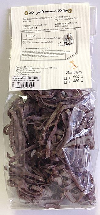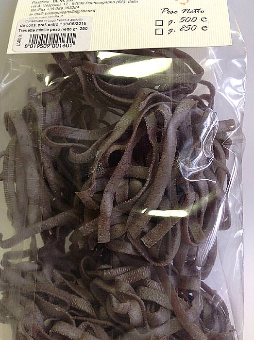 Паста c черникой, Paisanella / Trenette al mirtillo - паста в форме "узкой лапши" с добавлением лесной черники. Рекомендуется сочетать с белыми грибами и тимьяном, а также паста послужит прекрасным гарниром к тушеному мясу (особенно хорошо сочетается с тушеной говядиной).