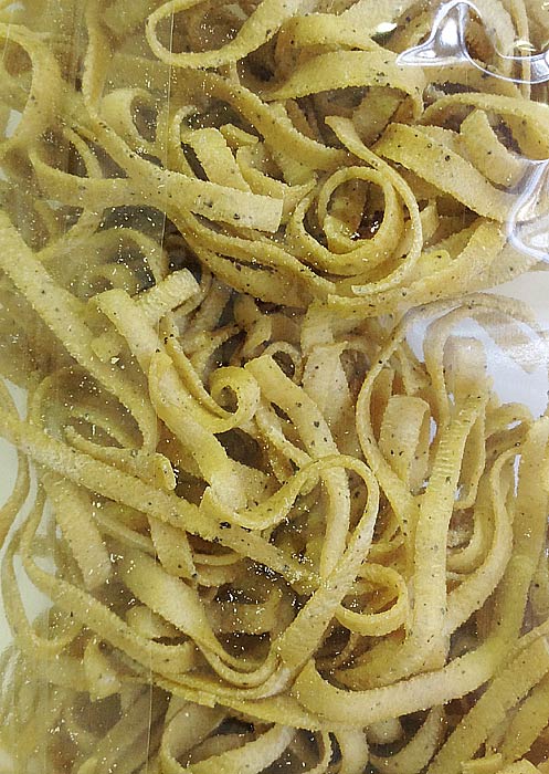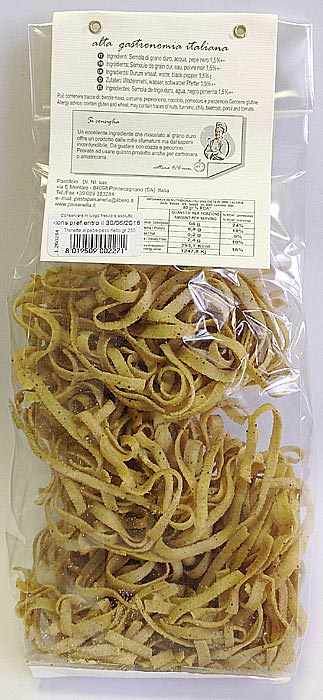Паста c черным перцем, Paisanella / Trenette al pepe nero - паста в форме "узкой лапши" с добавлением черного перца - тем, кто любит остренькое! К пасте отлично подойдет как мясной, так и рыбный соус (например соус из кролика по-охотничьи или соус из кальмаров и зеленого горошка). Рекомендуется с креветками, кабачками и молодым репчатым луком в корочке из пармезана.