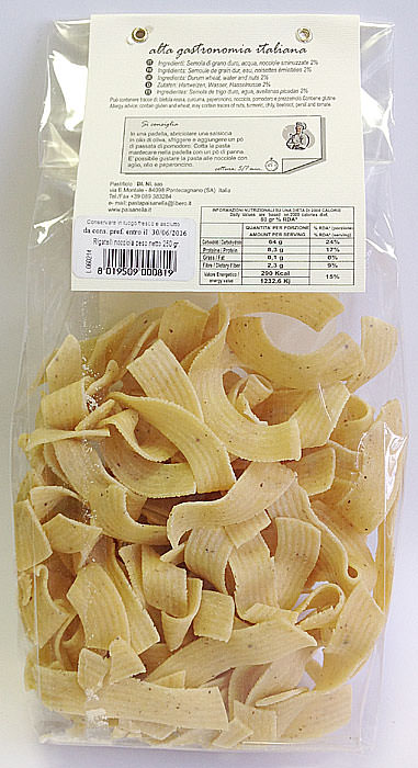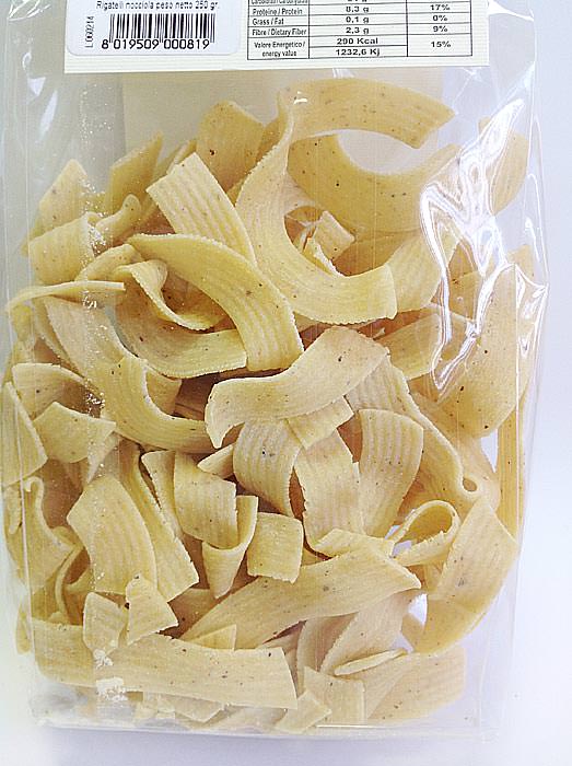Паста c фундуком / Rigatelli alla nocciola - паста в форме "очень широкой волнистой лапши" с добавлением фундука (лесного ореха). Рекомендуется как с обычным соусом из помидоров, так и со сливочным маслом с шалфеем. Необычно раскрывается вкус пасты в сочетании с сушеными помидорами, сыром маскарпоне и руколой.