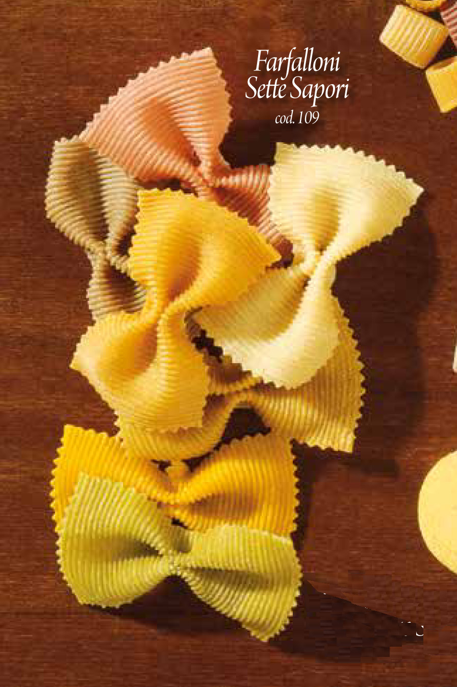 Бабочки или, как еще называют эту форму, бантики. Семь различных цветов - семь различных вкусов. Уникальная форма сочетается практически с любым соусом, но чаще всего вы её встретите именно с соусом из лосося и кабачков-цуккини.