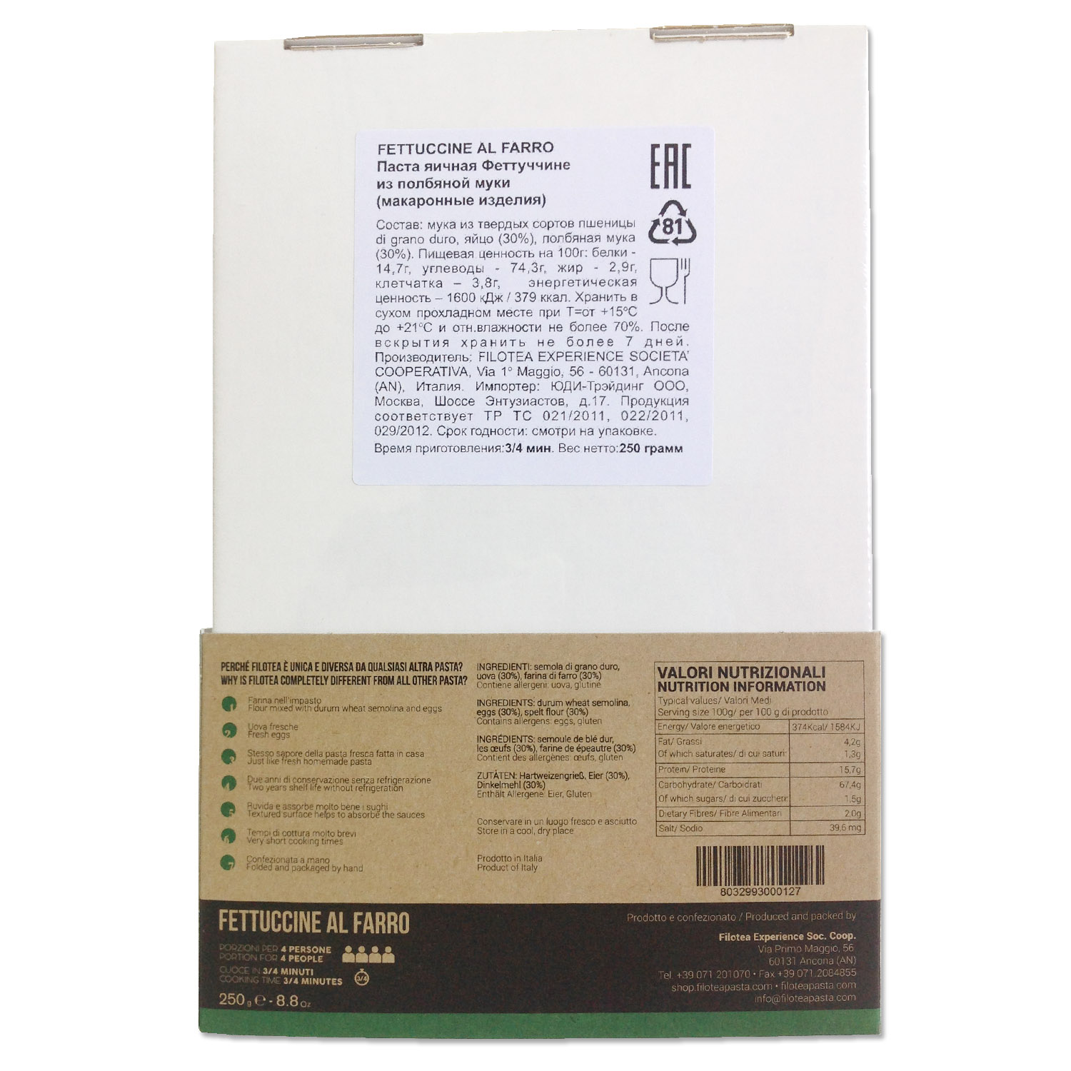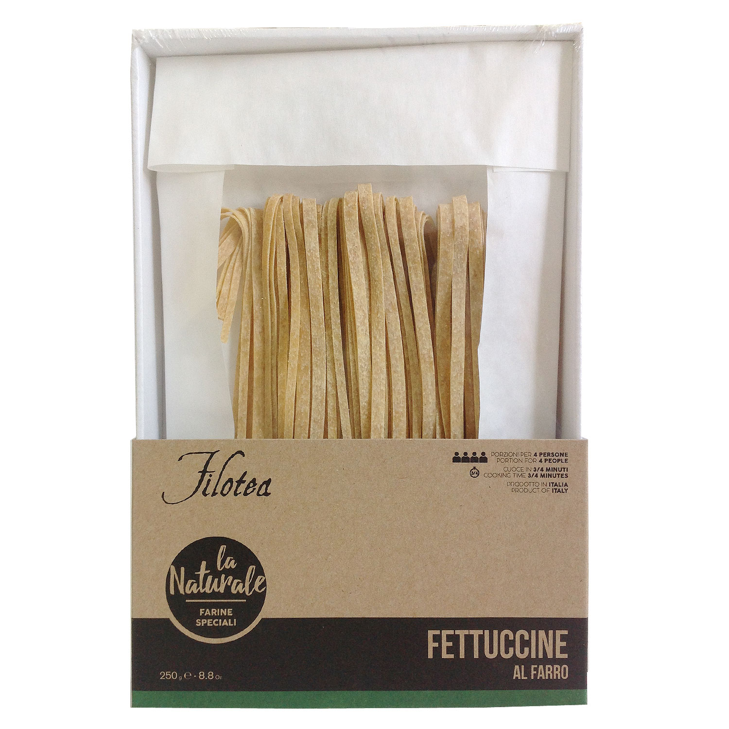 Паста Феттуччине из полбяной муки, хлопья которой обладают удивительными питательными свойствами, представляет БИО-линию продукции бренда "FILOTEA". Паста с низким содержанием жиров и превосходным вкусом хорошо сочетается с соусами из овощей и мяса, как красного, так и белого. Длинная паста шириной 1 см.