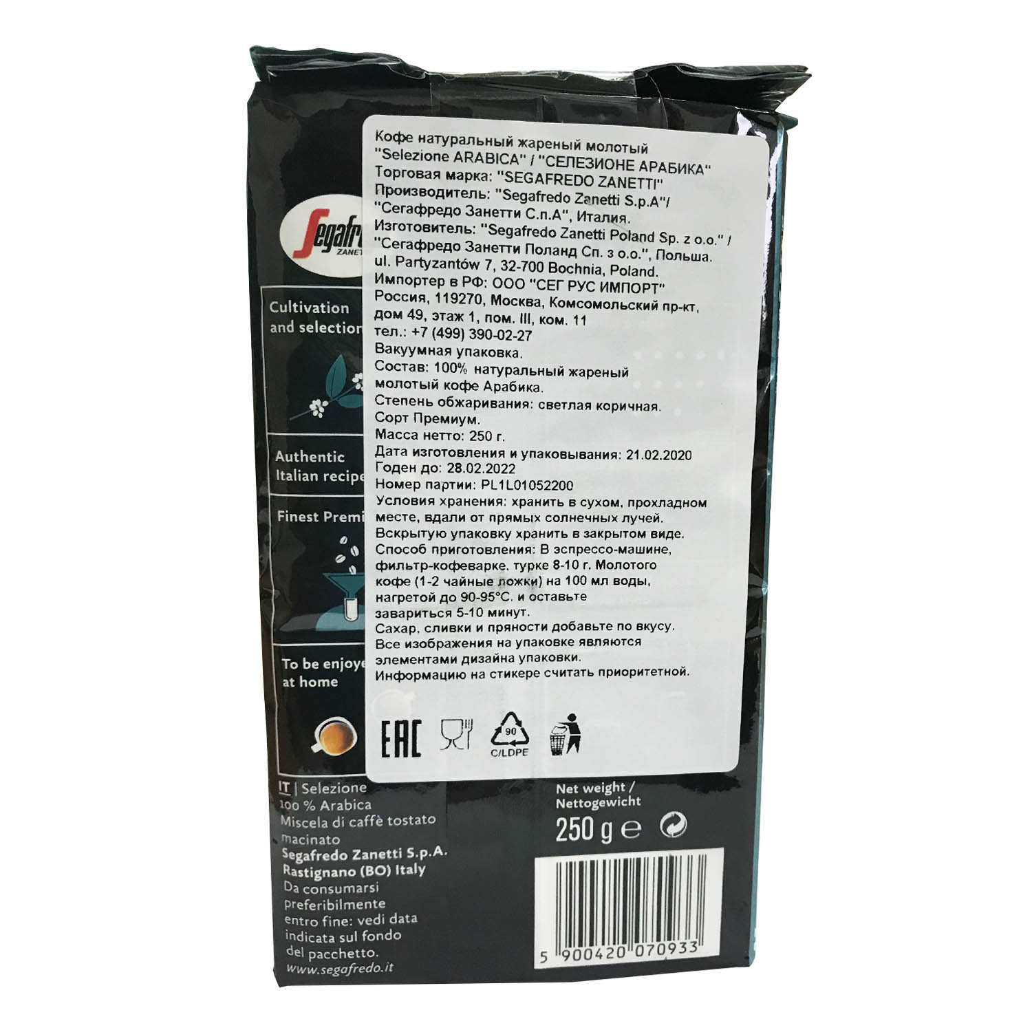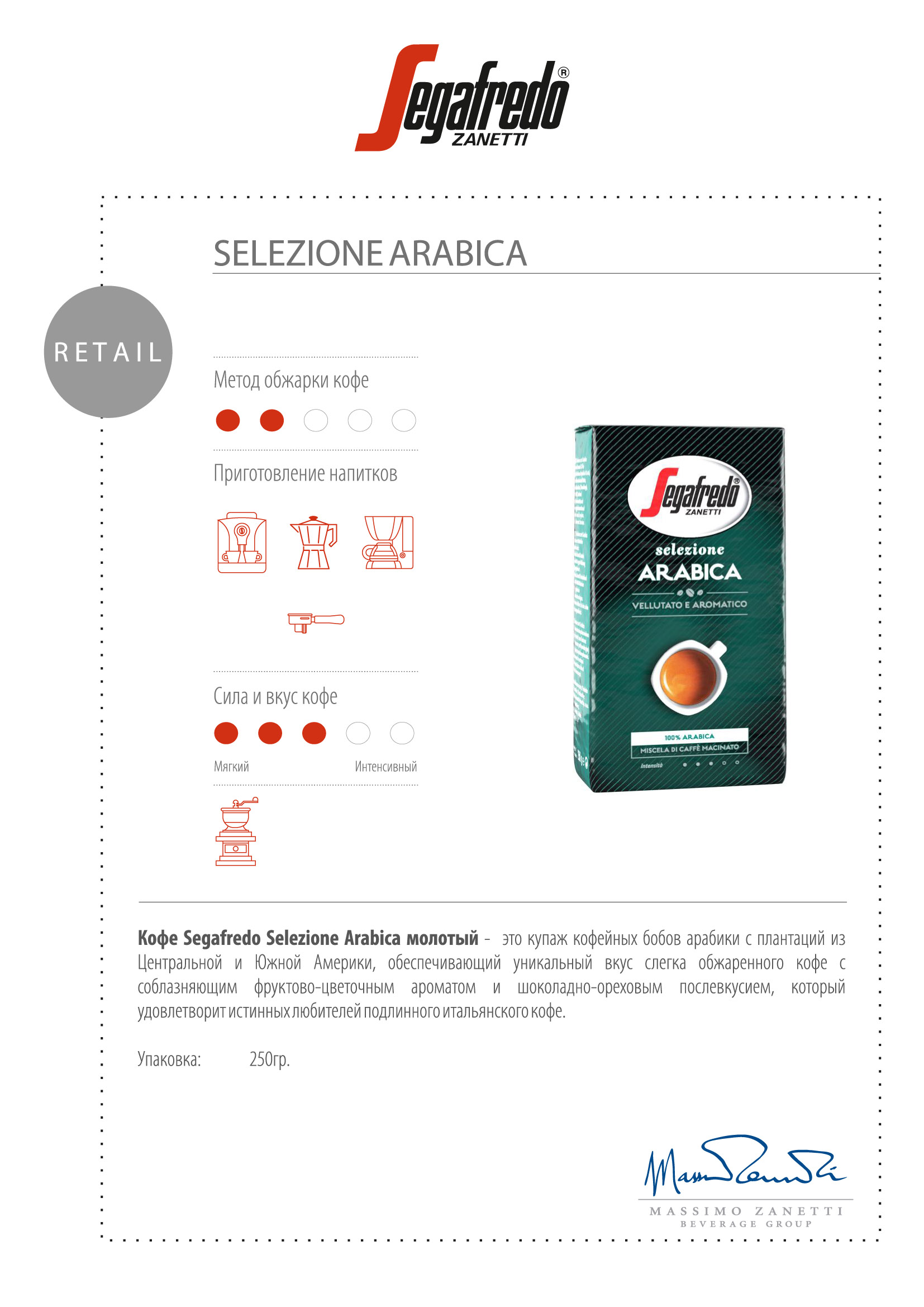 Кофе Segafredo Selezione Arabica молотый - это купаж кофейных бобов с плантаций из Центральной и Южной Америки, обеспечивающий уникальный вкус слегка обжаренного кофе с соблазняющим фруктово-цветочным ароматом и шоколадно-ореховым послевкусием, который удовлетворит истинных любителей подлинного итальянского кофе.