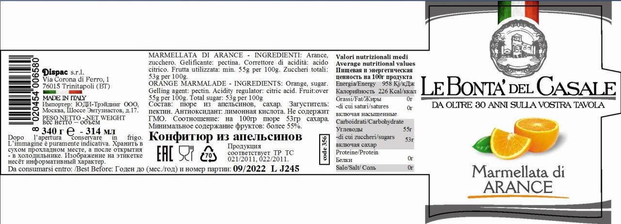 Конфитюр из сочных и ароматных апельсинов, выращенных в на юге Италии.