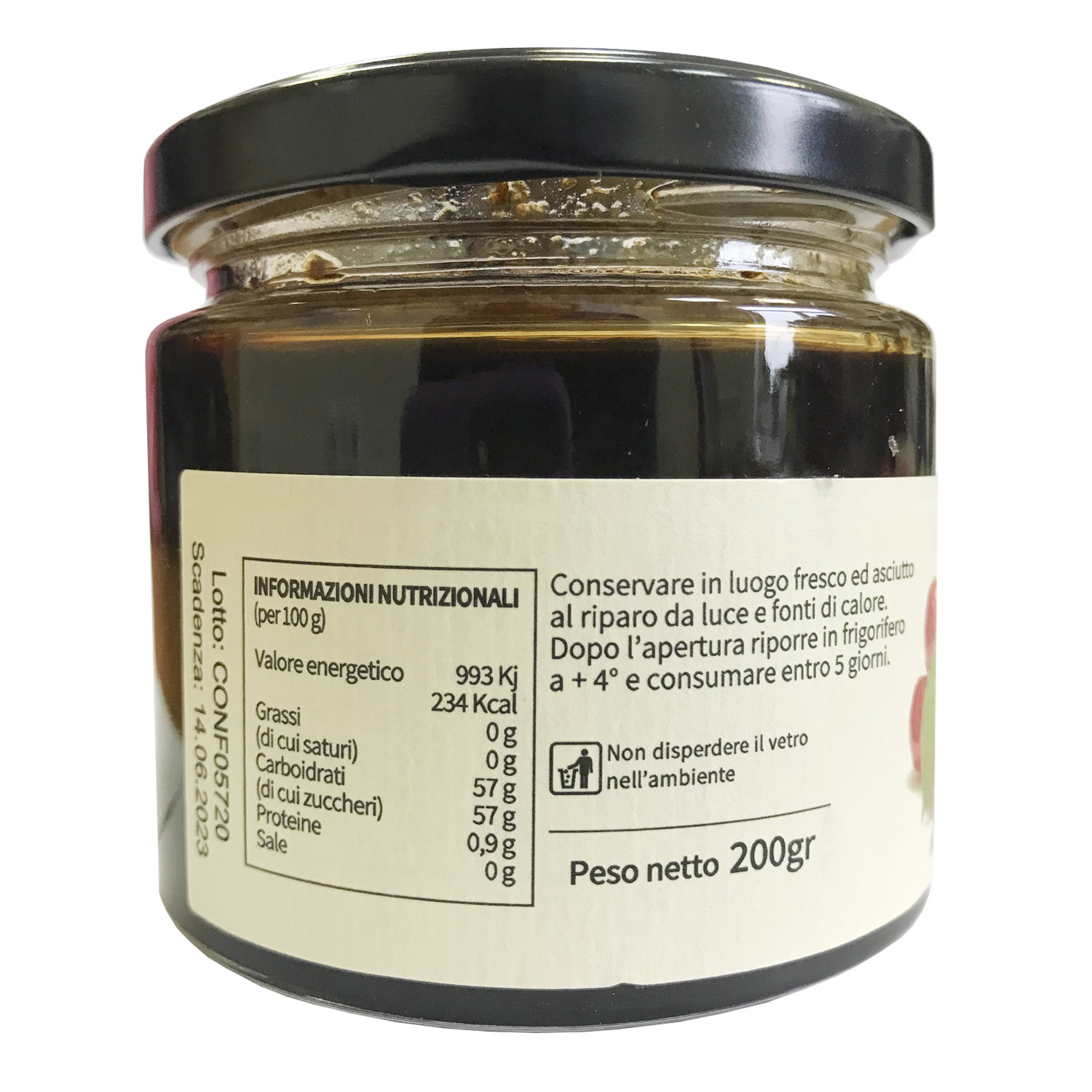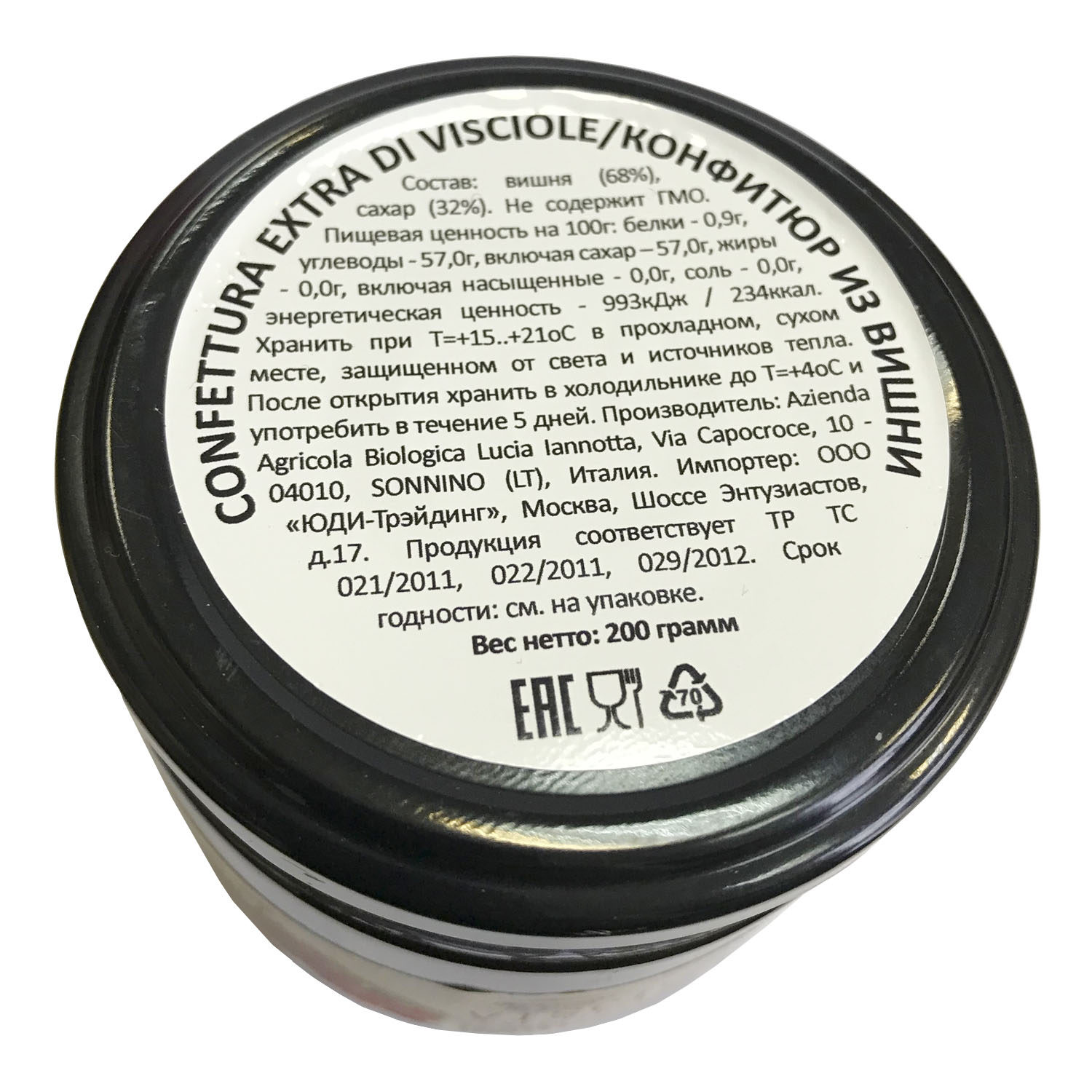 Конфитюр из вишни, выращенной в регионе Лацио. Воздушный, легкий - лакомство для любителей спелой, ароматной вишни. Хорошо сочетается с сырами.