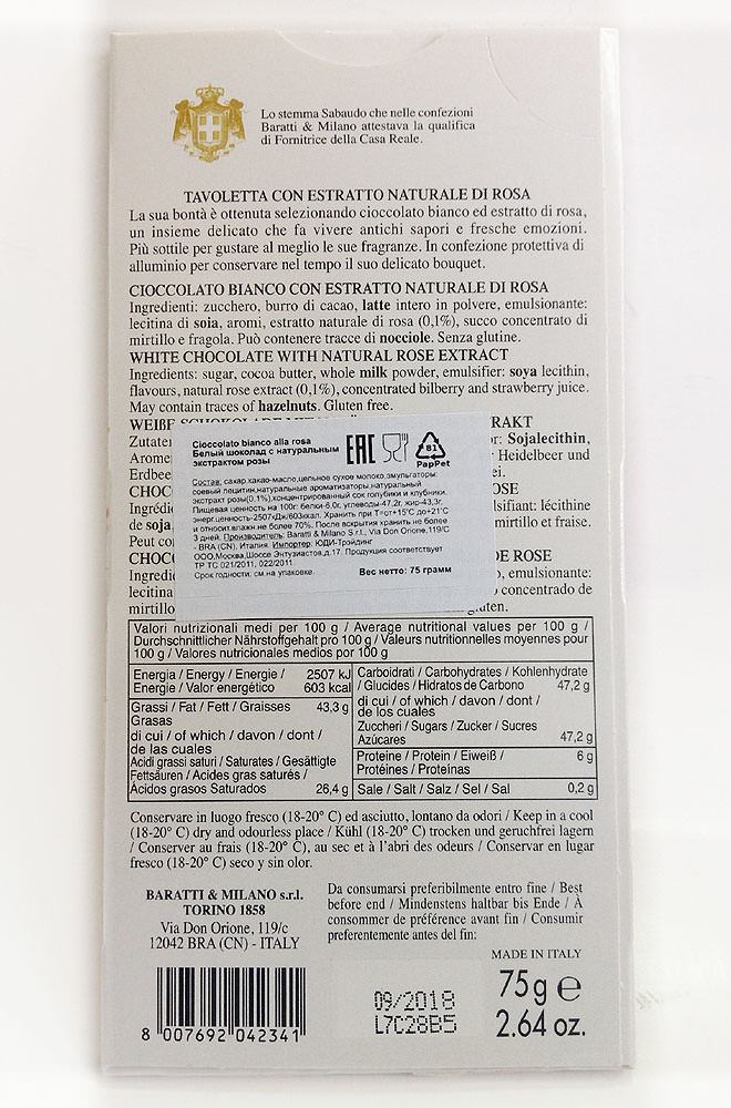Cioccolato bianco alla rosa - белый шоколад с натуральным экстрактом розы.
