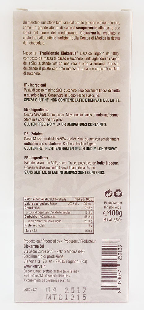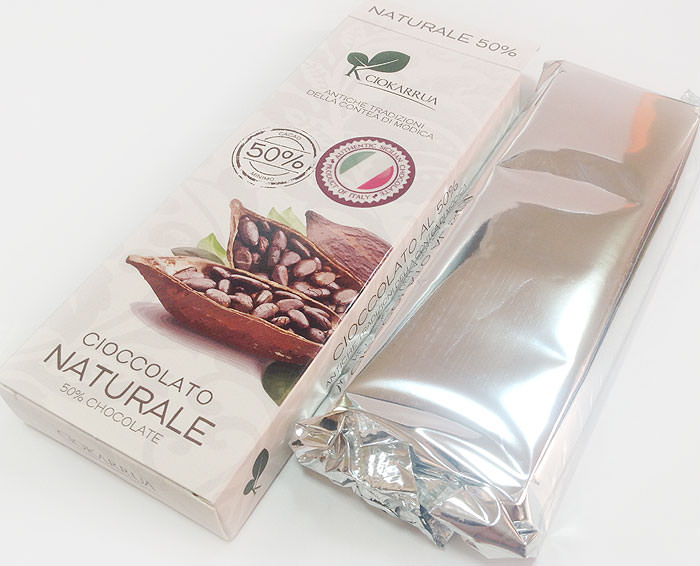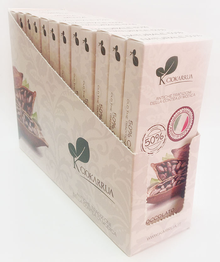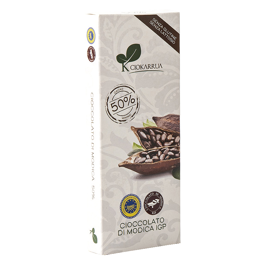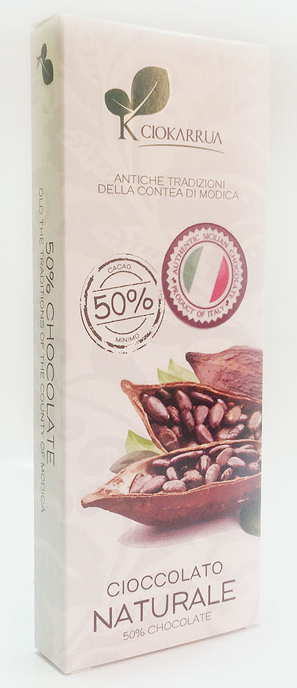 Cioccolato di Modica cacao minimo 50% - шоколад для любителей оценить только вкус шоколада и ничего более. "Грубая" текстура шоколада, характерная для старинного "холодного" способа приготовления массы из какао-бобов.