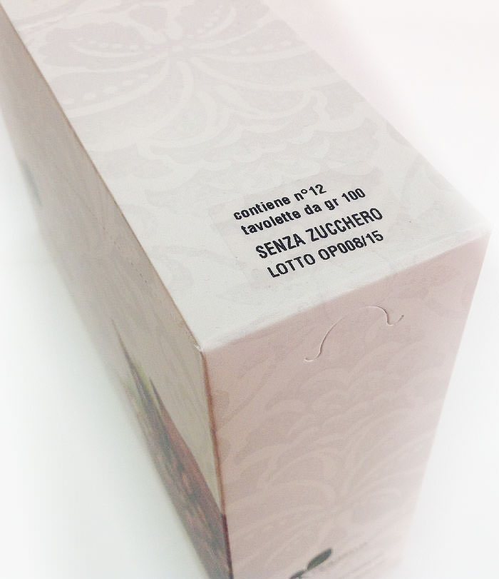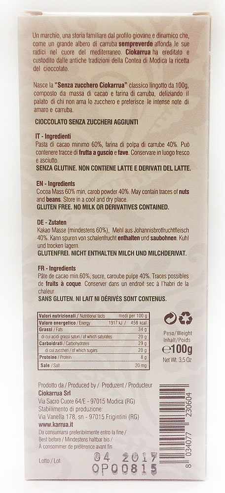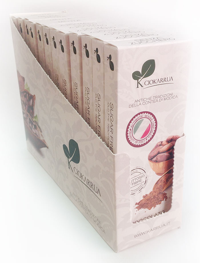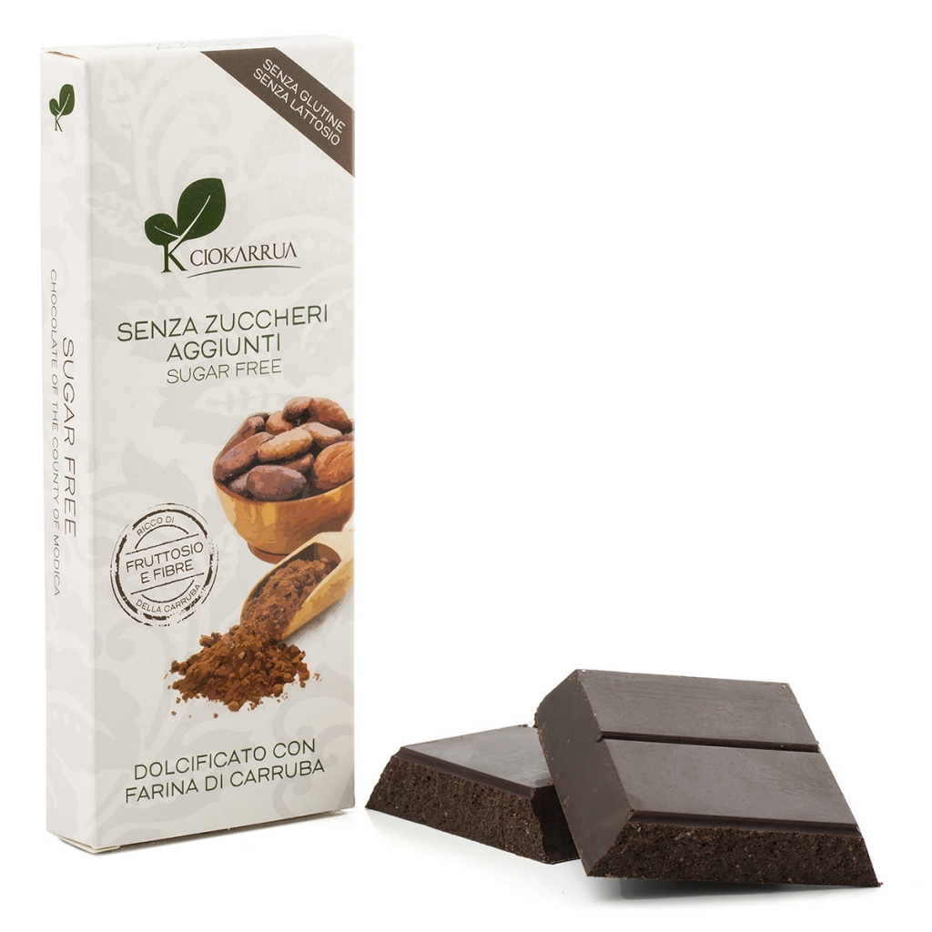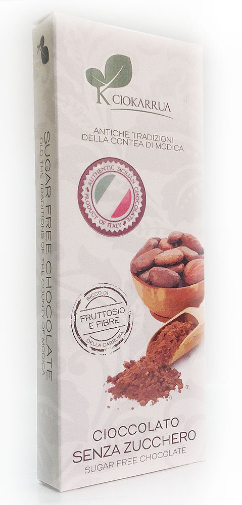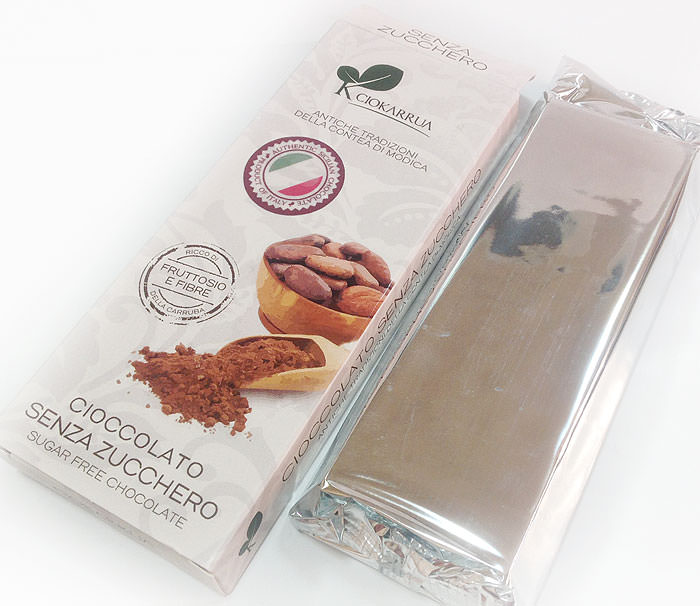 Cioccolato senza Zucchero - вариант для любителей горького шоколада. Мука из кэроба (плодов рожкового дерева, карруба) добавляет продукту витаминов и полезных минералов. "Грубая" текстура шоколада, характерная для старинного "холодного" способа приготовления массы из какао-бобов.