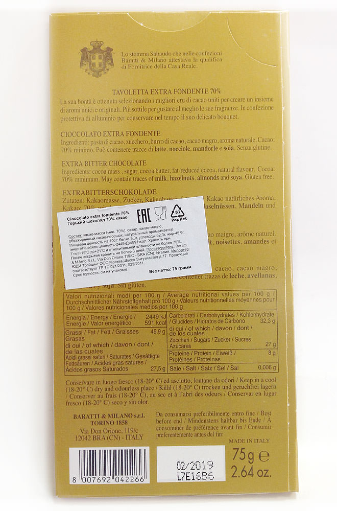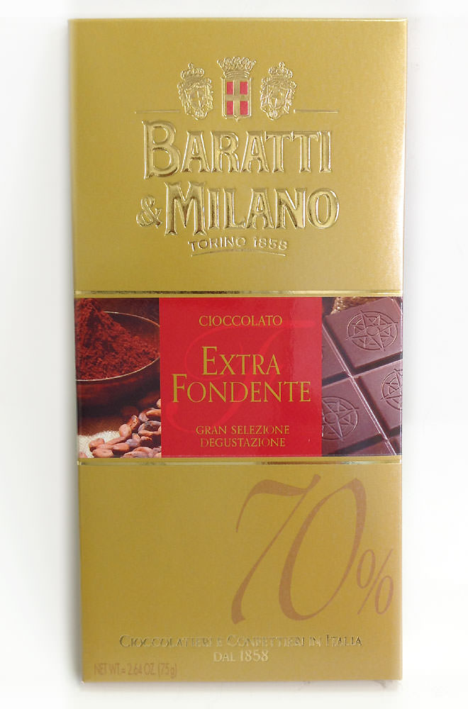 Cioccolato extra fondente 70% - горький шоколад с содержанием какао-массы не менее 70%. Для создания этого идеально сбалансированного шедевра "Baratti & Milano" использует 70% смесь какао-бобов из Ганы и Эквадора. Как и во всех продуктах Baratti & Milano, для производства используются только натуральные ингредиенты. Цель нашего мастера-шоколатье создать плитку со сбалансированным танинным вкусом. Идеальный "полусладкий" вкус: не слишком темного, но и не слишком светлого шоколада. Плитка со сбалансированным сочетанием вкусов красных фруктов и цветочных нот.