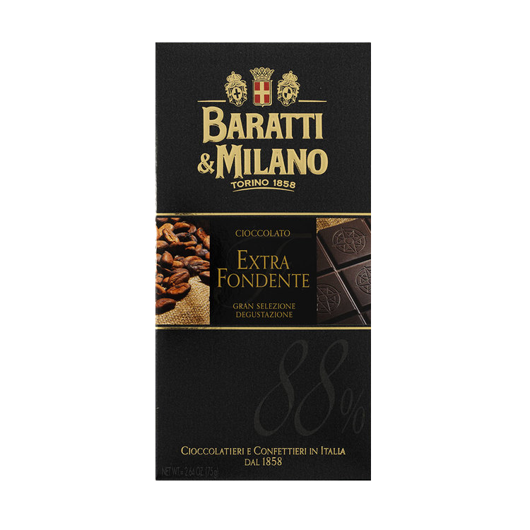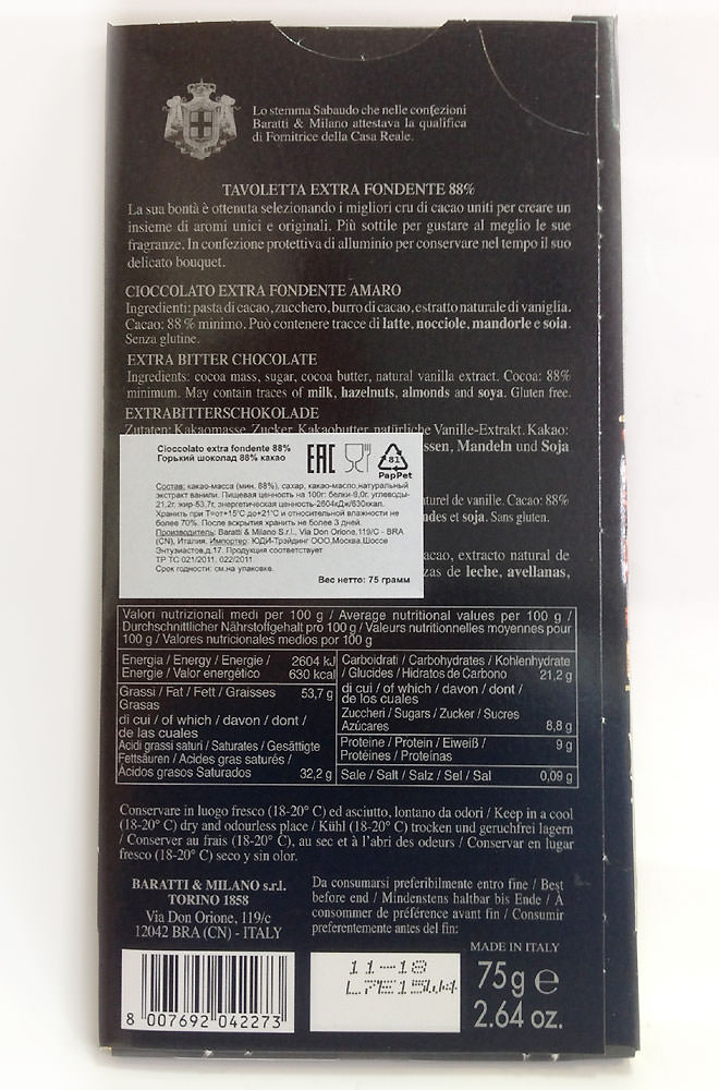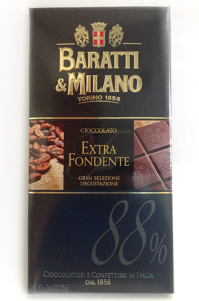 Cioccolato extra fondente 88% - горький шоколад с содержанием какао-массы не менее 88%. Экстра темный шоколад, явившийся результатом объединения лучших Крю какао, для создания уникального и оригинального аромата. Оригинальный купаж какао-бобов создает бархатистое послевкусия и неповторимый букет. Горький и танинный - отличный!