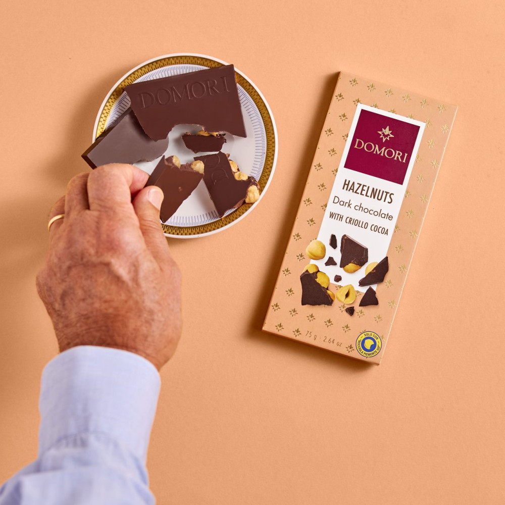 "Domori" шоколад горький с фундуком из Пьемонта IGP сочетает в себе сладость и сливочность фундука с качеством лучшего какао. Среди лучших сортов какао "Domori" использует какао сорта Criollo / Криолло - самое ароматное, ценное и редкое, которое придает шоколаду нежный, обволакивающий аромат и сбалансированную сладость во вкусе.