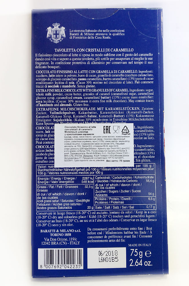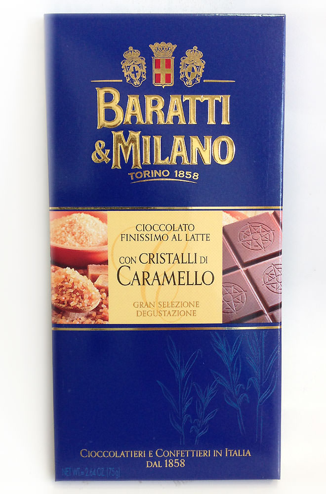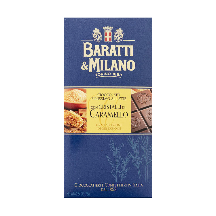 Cioccolato finissimo al latte con cristalli di caramello - молочный шоколад с добавлением сливочной карамели. Шоколад идеален для любителей карамельного шоколада. "Баратти и Милано" добавили совершенства там, где, как считается, это было невозможно. Этот удивительный молочный шоколад тает во рту, но дает вам естественный хруст кристаллов карамели, произведенных по древнему рецепту, чтобы удовлетворить вашу потребность в текстуре с таким гладким вкусом во рту. Молочный шоколад с кристаллизованной карамелью-это вкус, который вы не захотите пропустить. Шоколад-это смесь ганских и эквадорских бобов, смешанных с лучшим молоком Европы, чтобы создать плитку шоколада, которую вы всегда захотите иметь под рукой.