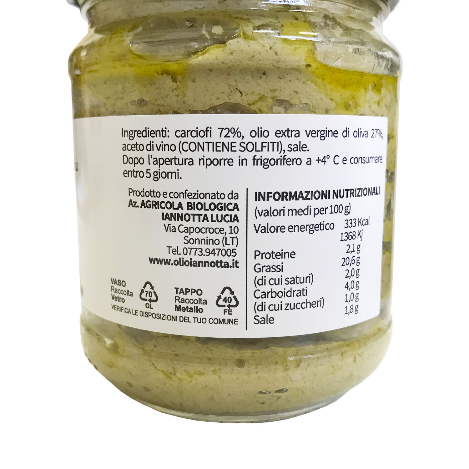 Крем из артишоков Lucia Iannotta - это пате, сделанное из тщательно отобранных артишоков, с добавлением оливкового масла первого холодного отжима. Крем готовится по традиционному рецепту компании. Сливочный и универсальный - крем из артишоков можно использовать во многих рецептах: на подсушенном хлебе или брускетте он даёт вкусную закуску ; идеально подойдёт в качестве соуса для сопровождения вторых блюд. И не забываем про пасту: крем из артишоков выступит идеальным соусом/топингом !