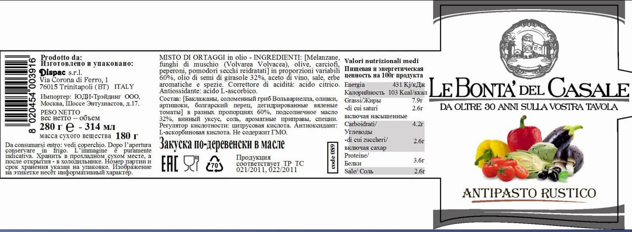 Девизом данного продукта могла бы стать фраза: "Всё и сразу". "Закуска по-деревенски" позволит вам попробовать практически весь ассортимент овощей "Le Bonta del Casale" и выбрать то, что вам по вкусу. Прекрасное дополнение к любому столу - яркое, вкусное, аппетитное !