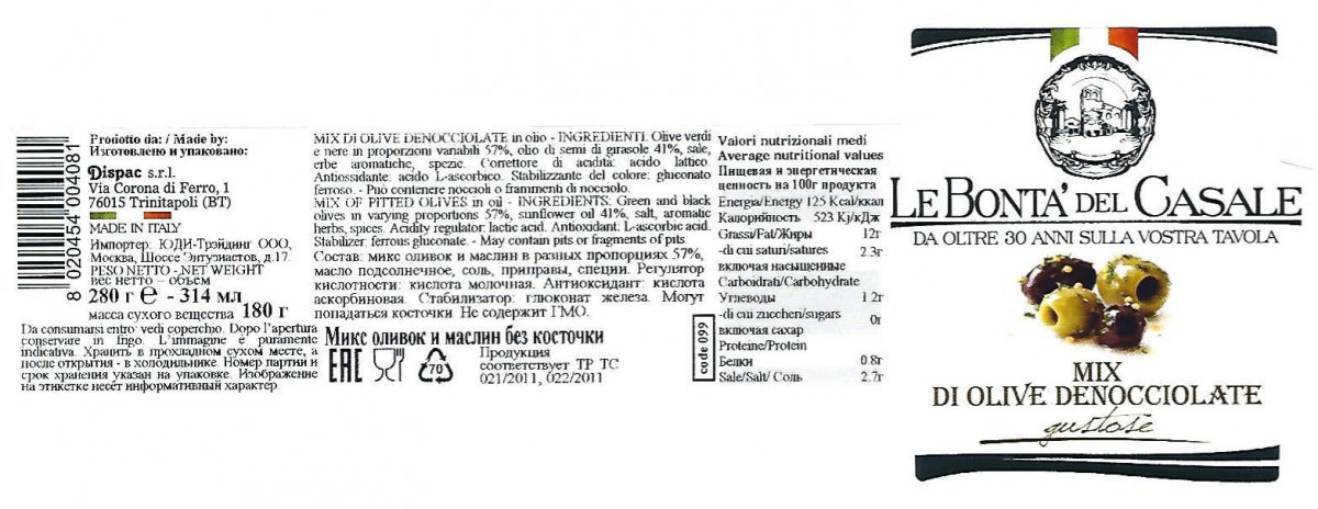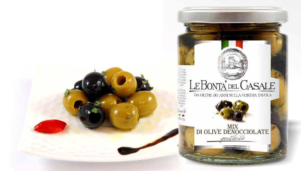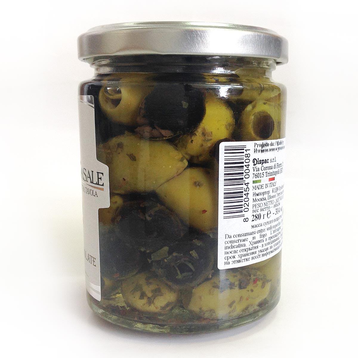 Микс оливок и маслин местных, апулийских сортов - сочные, мясистые. Сразу два вкуса в одной упаковке и без косточки, что очень удобно для салатов или просто в качестве закуски.