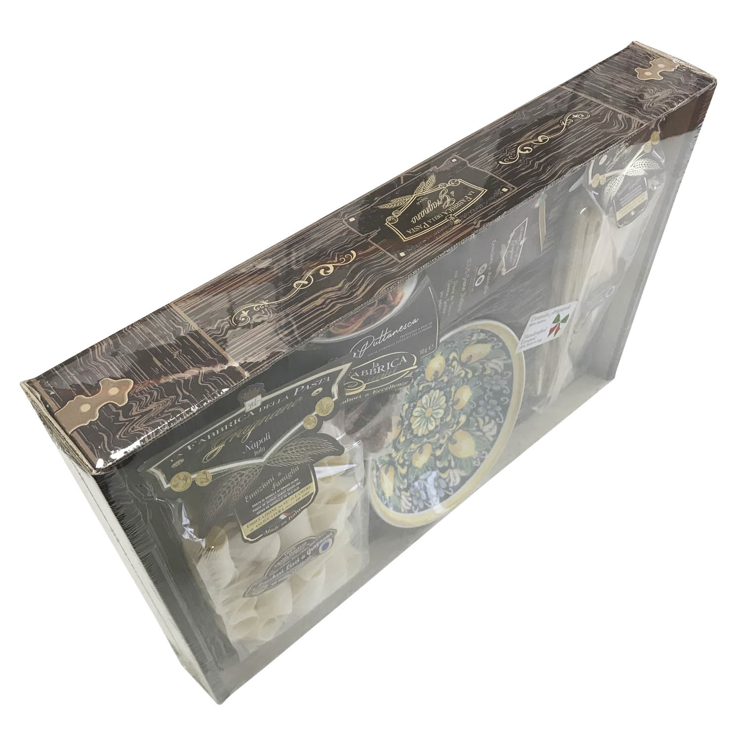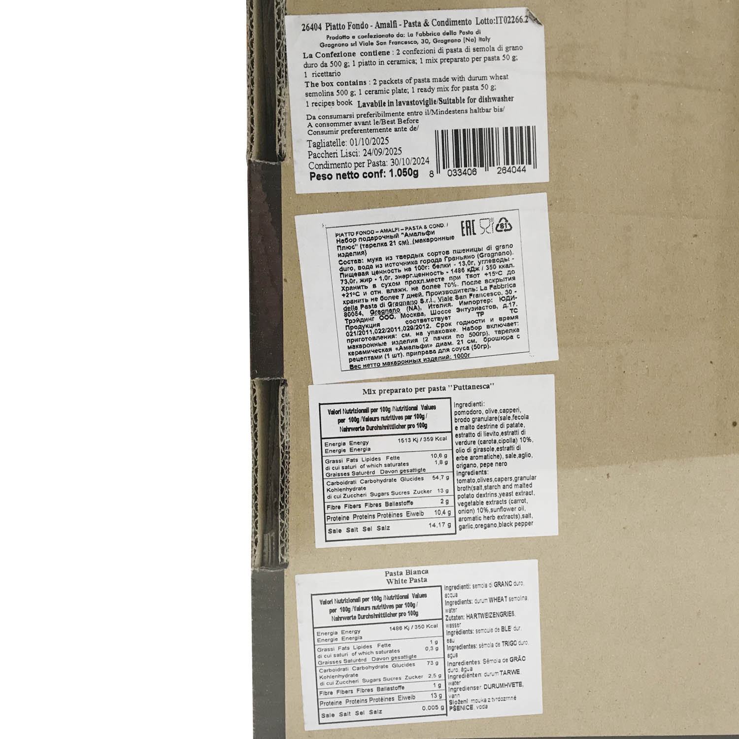 Подарочный набор "Амальфи Плюс (тарелка 21 см)" - это оригинальный подарок, включающий две пачки пасты La Fabbrica della pasta di Gragnano, керамическую тарелку, расписанную в дизайне "Амальфи", приправу для приготовления соуса и брошюру с оригинальными итальянскими рецептами и всё это в эксклюзивной коробке, оформленной в стиле "старинный сундучок". Набор полностью собирается и бережно упаковывается в Италии. Готовое решение прекрасного подарка!