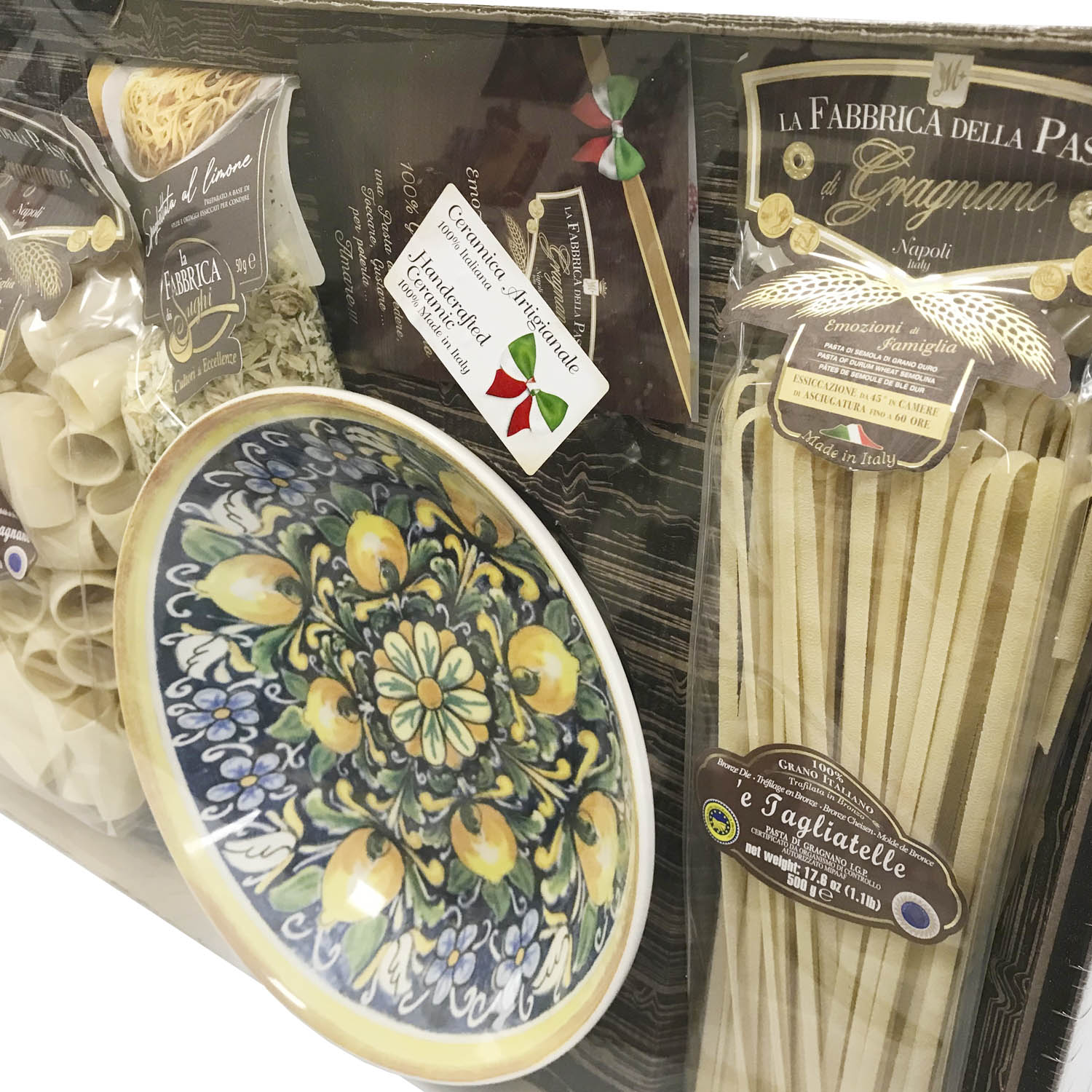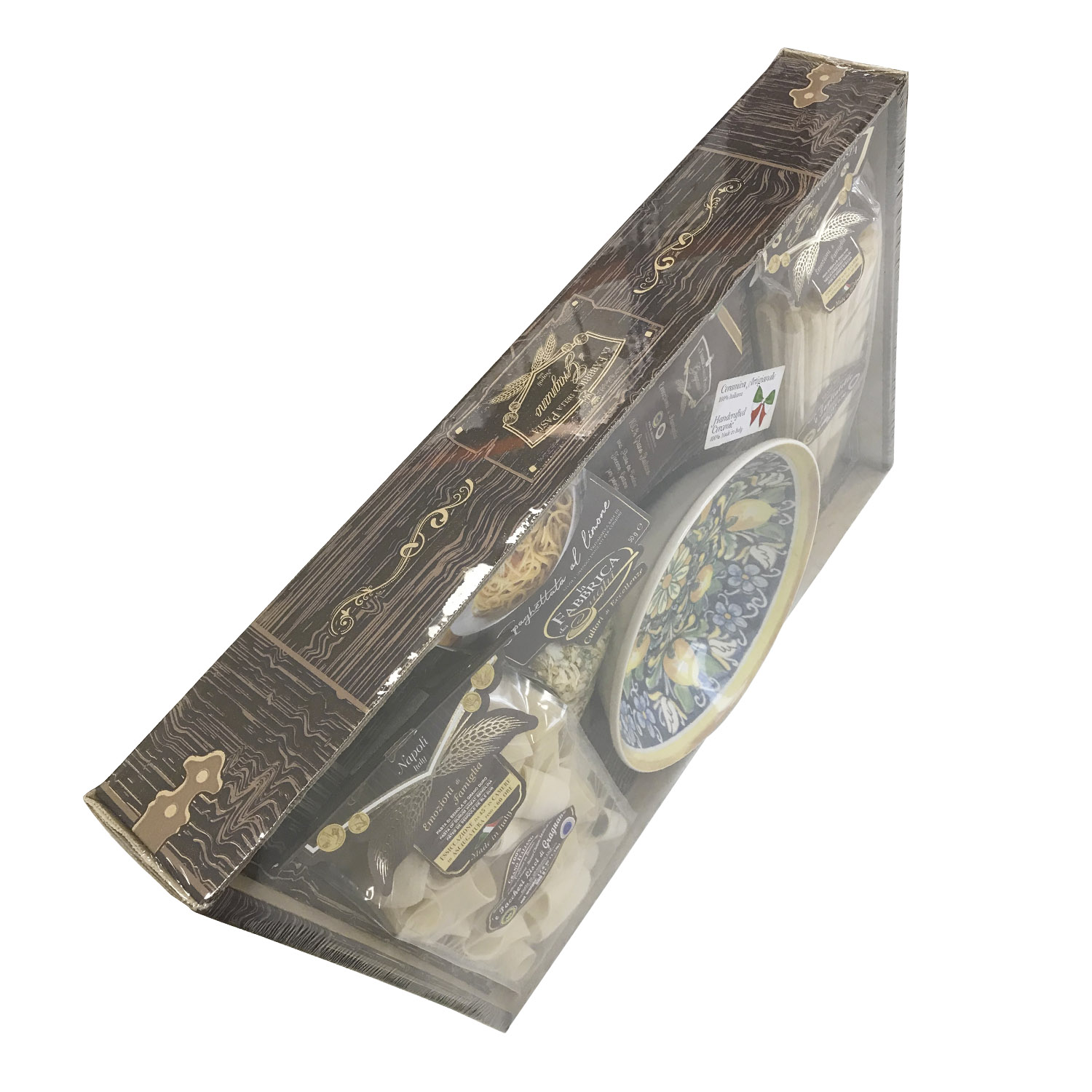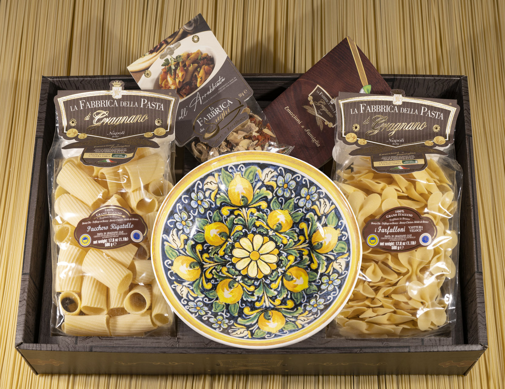 Подарочный набор "Амальфи Плюс (тарелка 25 см)" - это оригинальный подарок, включающий две пачки пасты La Fabbrica della pasta di Gragnano, керамическую тарелку, расписанную в дизайне "Амальфи", приправу для приготовления соуса и брошюру с оригинальными итальянскими рецептами и всё это в эксклюзивной коробке, оформленной в стиле "старинный сундучок". Набор полностью собирается и бережно упаковывается в Италии. Готовое решение прекрасного подарка!