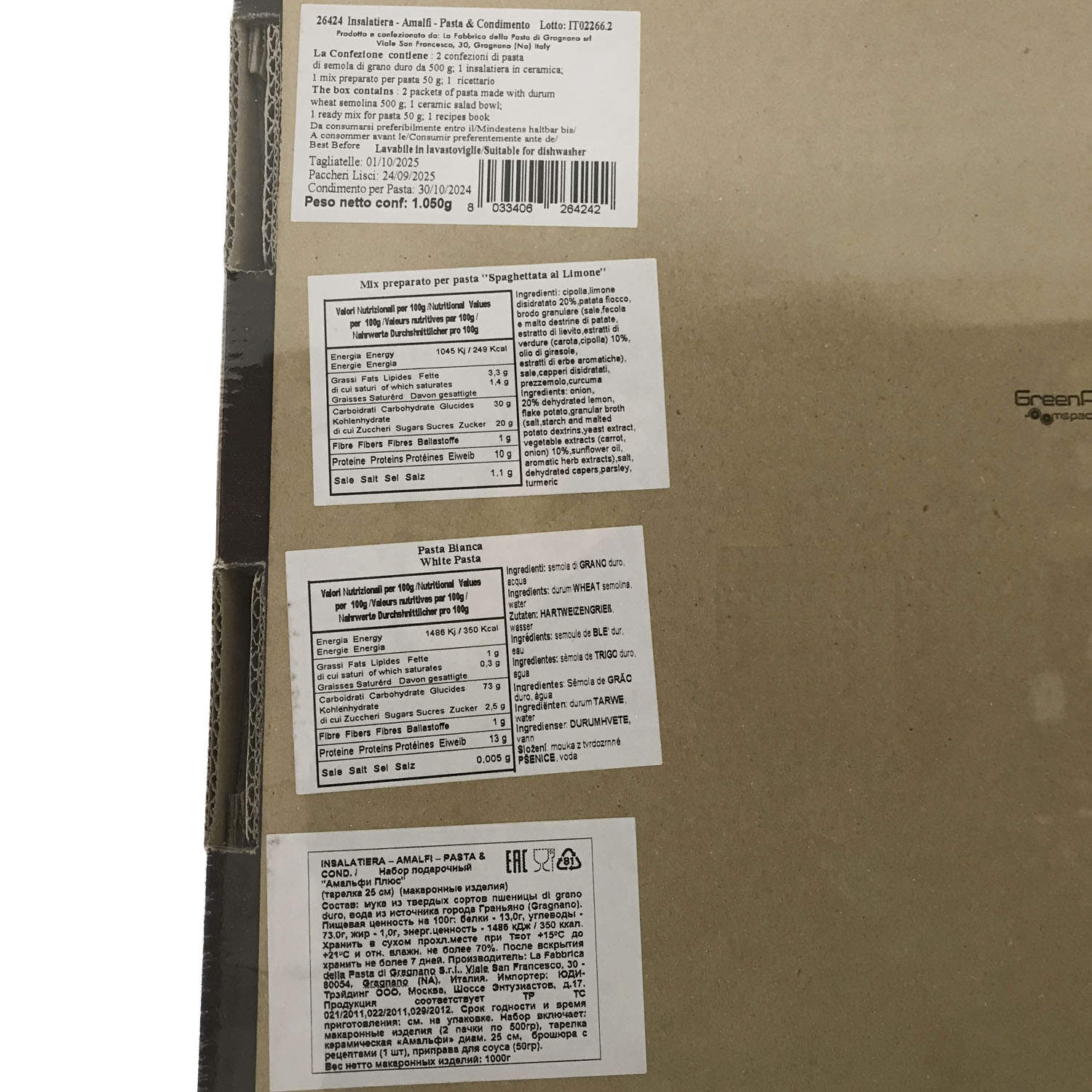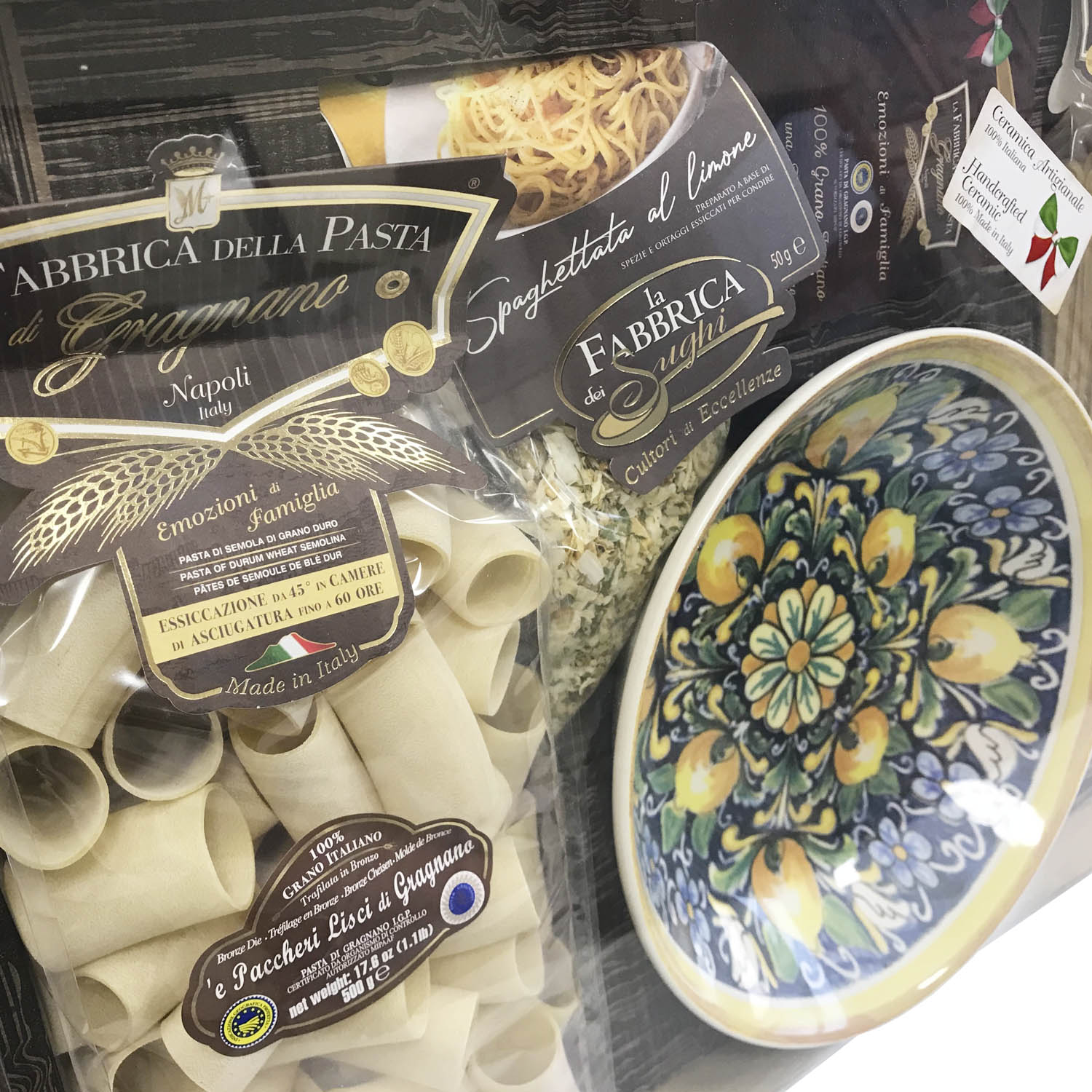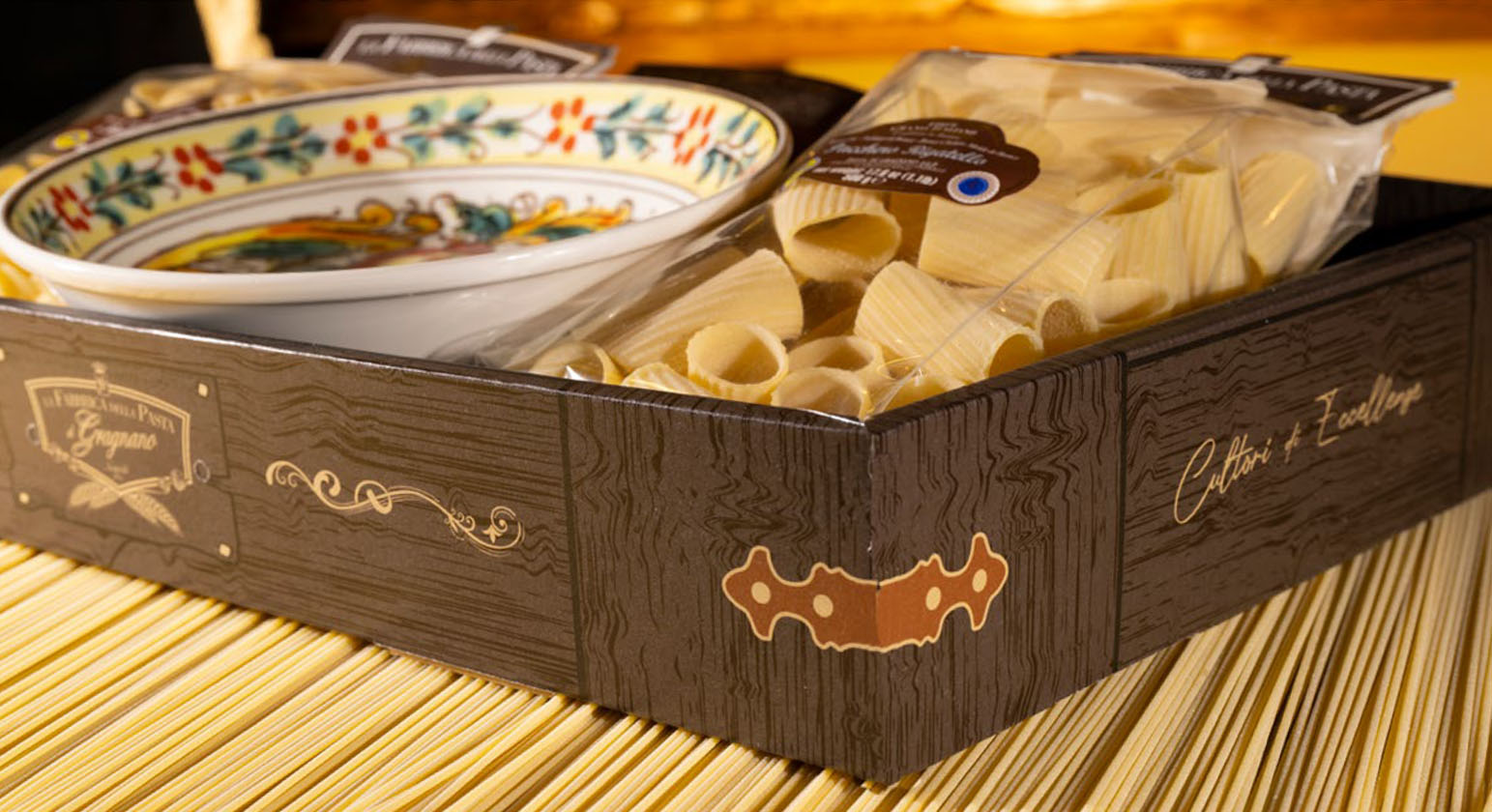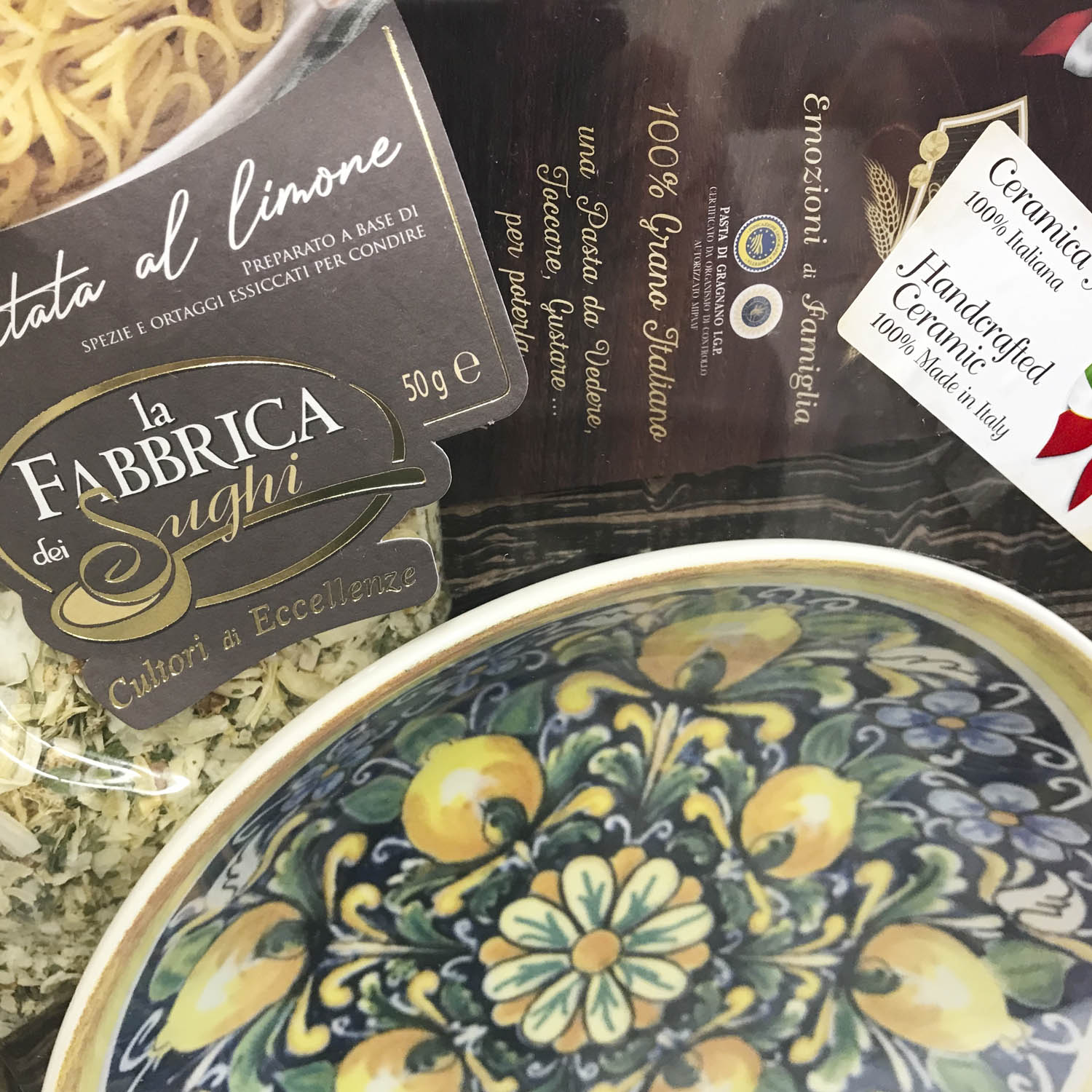 Подарочный набор "Амальфи Плюс (тарелка 25 см)" - это оригинальный подарок, включающий две пачки пасты La Fabbrica della pasta di Gragnano, керамическую тарелку, расписанную в дизайне "Амальфи", приправу для приготовления соуса и брошюру с оригинальными итальянскими рецептами и всё это в эксклюзивной коробке, оформленной в стиле "старинный сундучок". Набор полностью собирается и бережно упаковывается в Италии. Готовое решение прекрасного подарка!