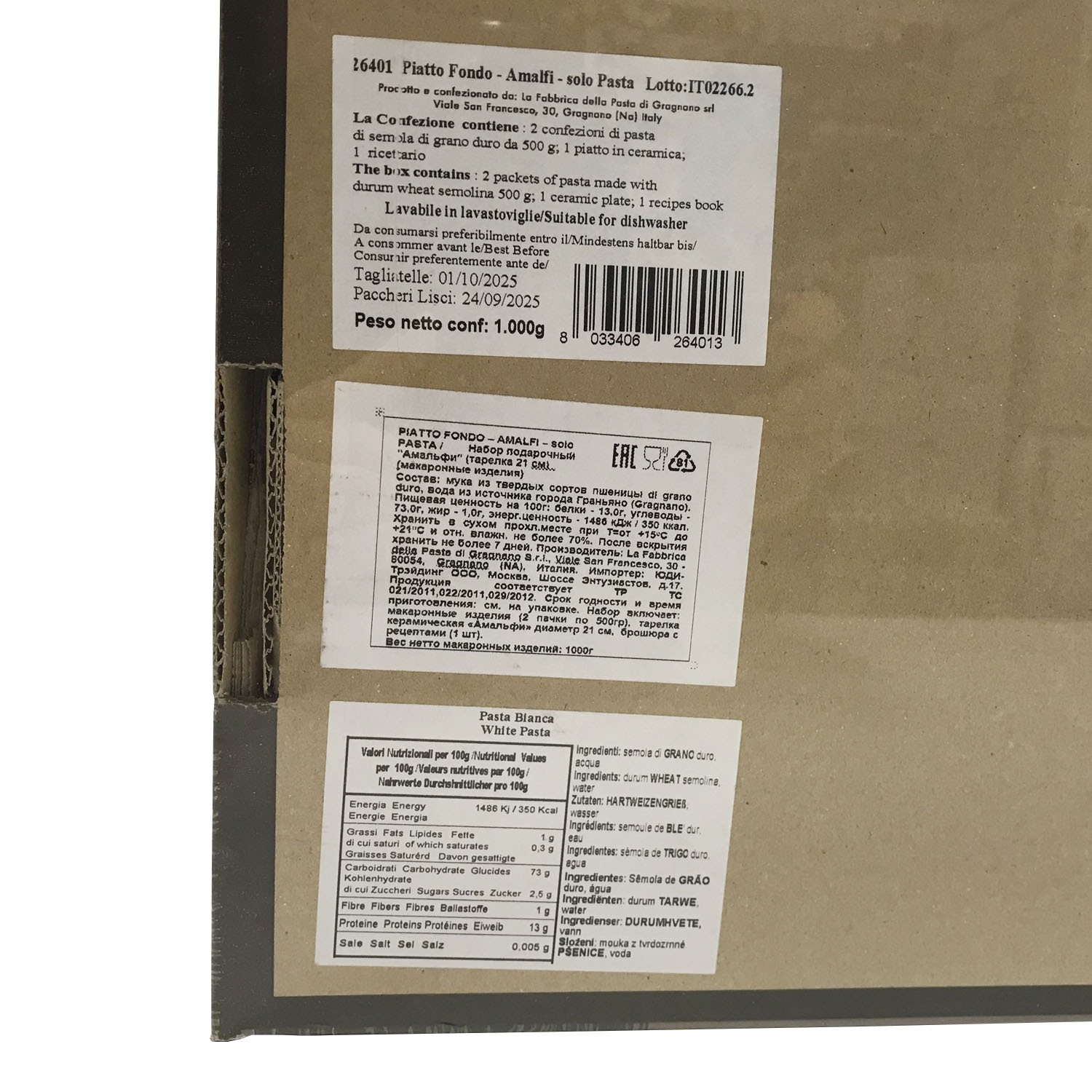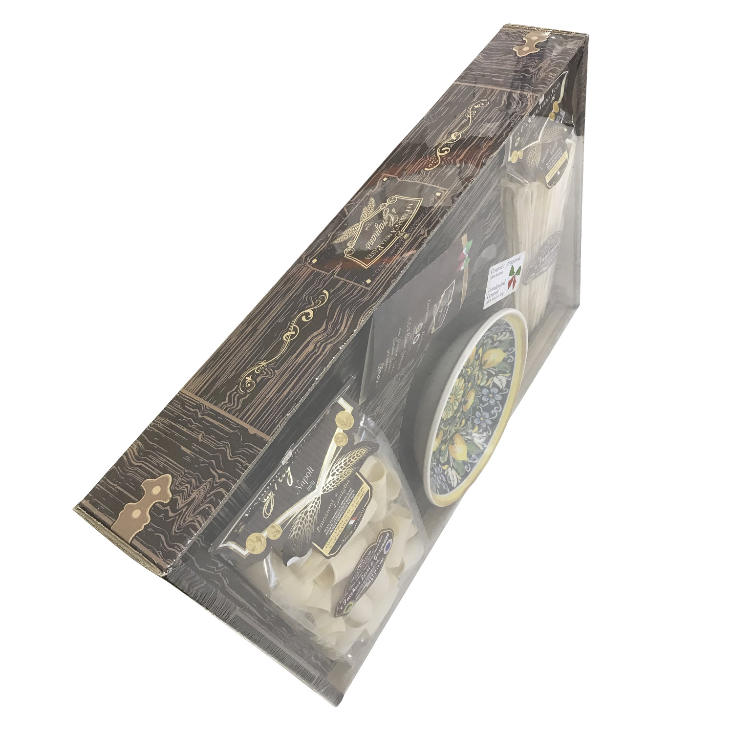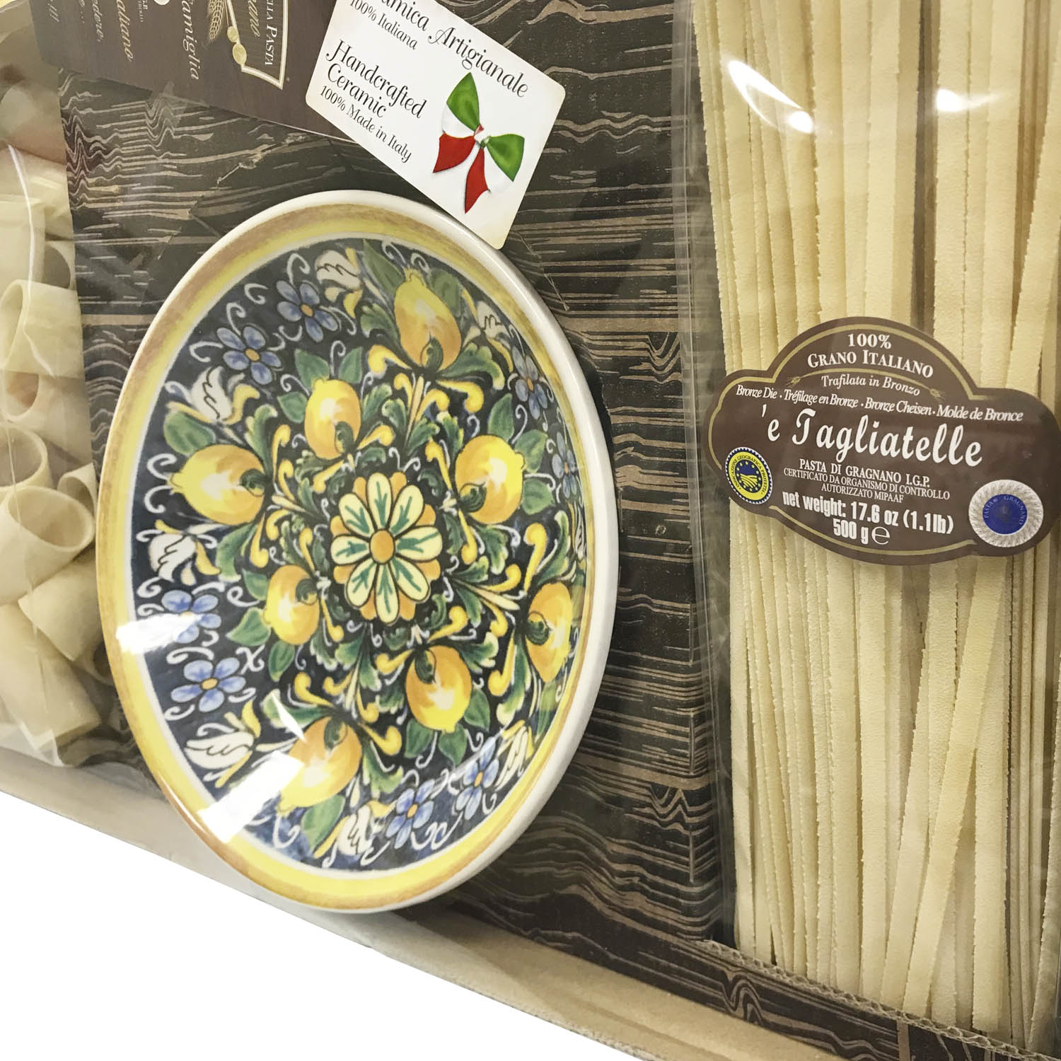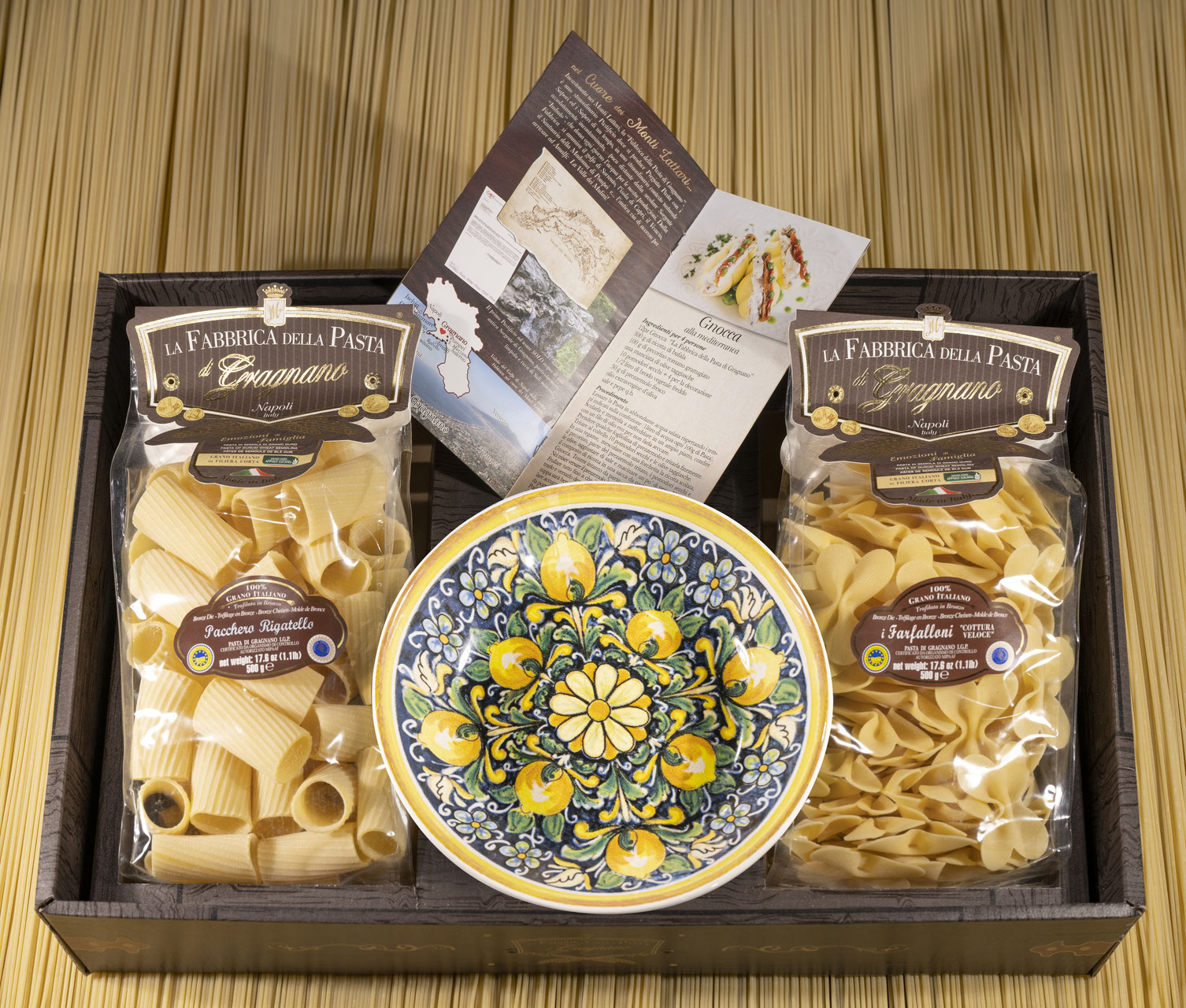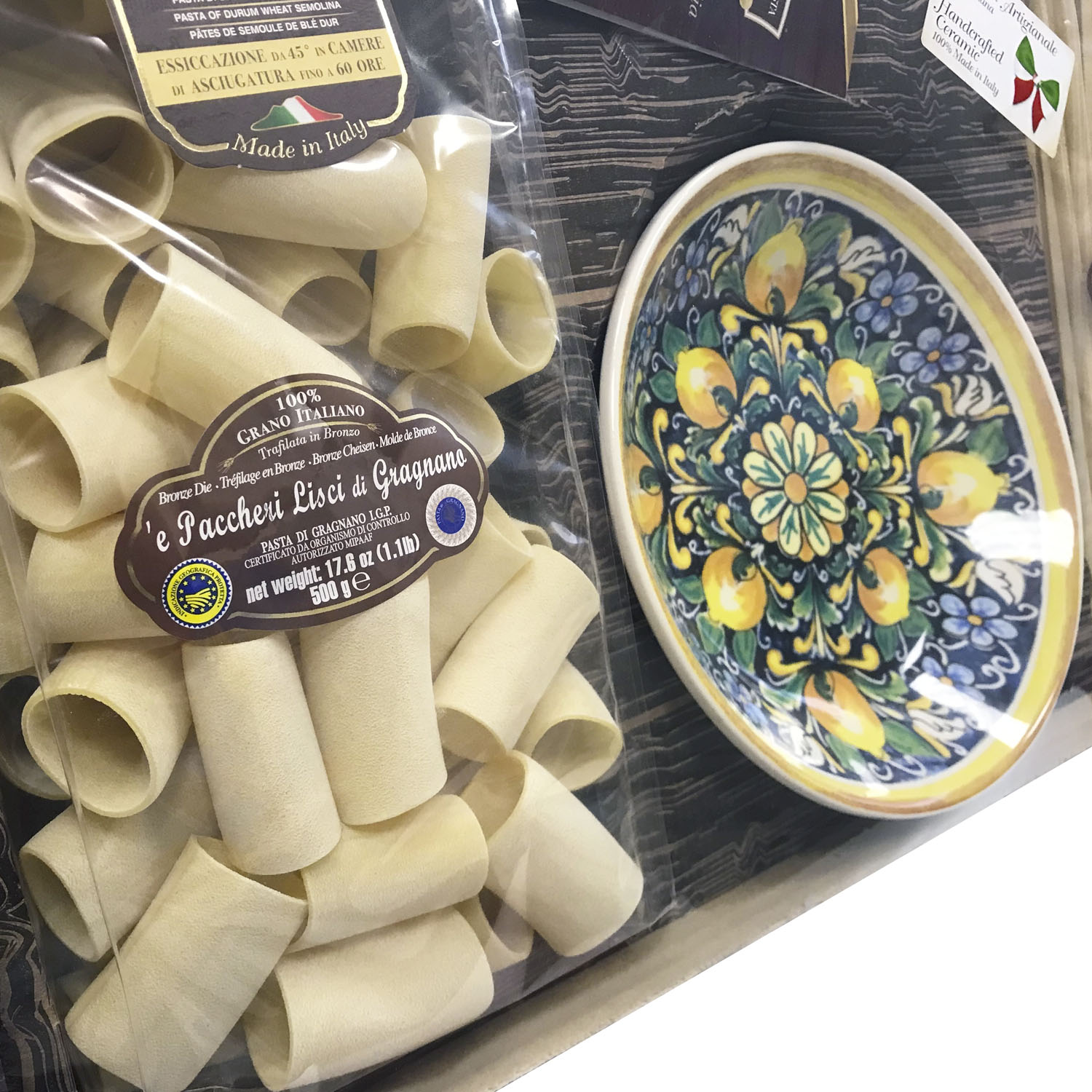 Подарочный набор "Амальфи (тарелка 21 см)" - это оригинальный подарок, включающий две пачки пасты La Fabbrica della pasta di Gragnano, керамическую тарелку, расписанную в дизайне "Амальфи", брошюру с оригинальными итальянскими рецептами и всё это в эксклюзивной коробке, оформленной в стиле "старинный сундучок". Набор полностью собирается и бережно упаковывается в Италии. Готовое решение прекрасного подарка!