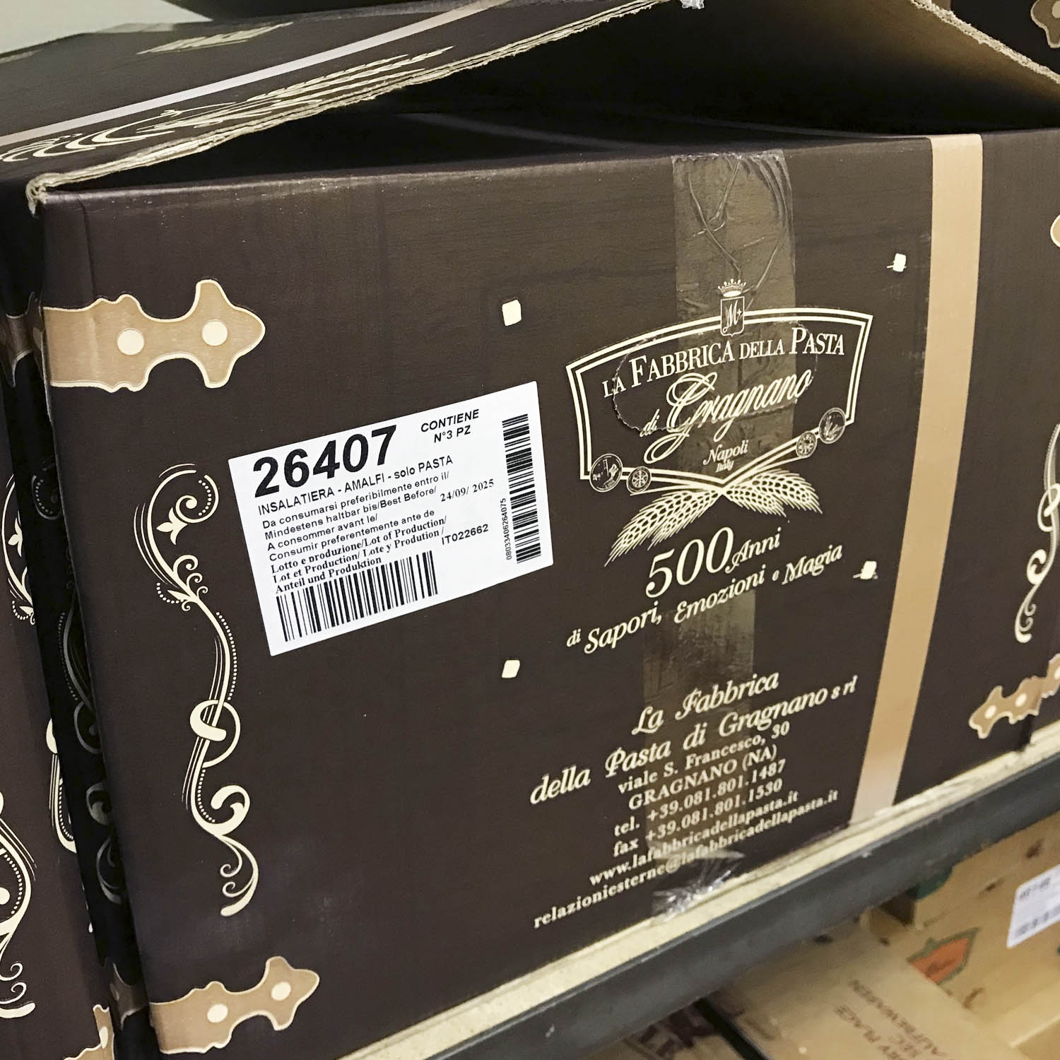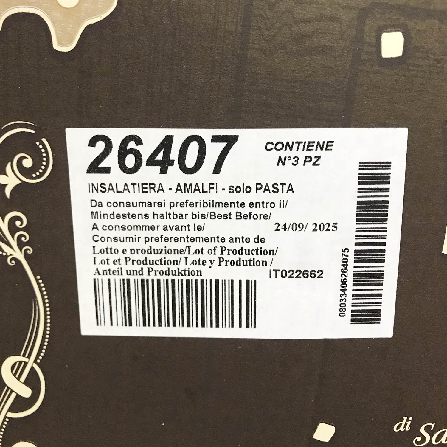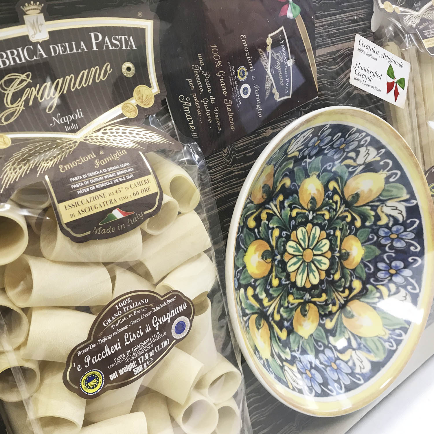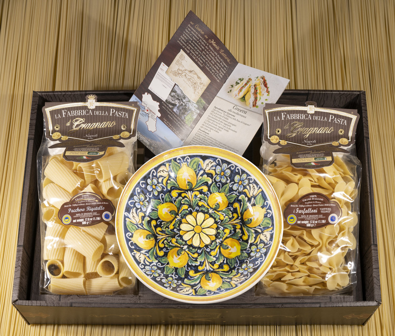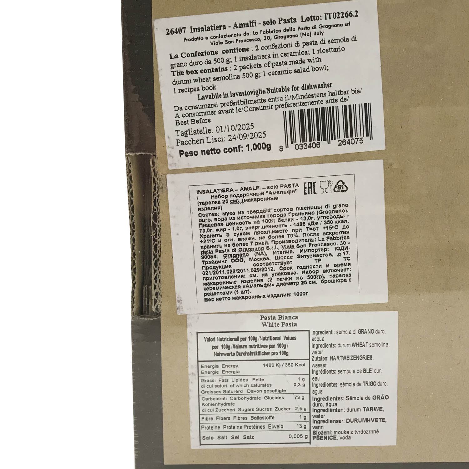 Подарочный набор "Амальфи (тарелка 25 см)" - это оригинальный подарок, включающий две пачки пасты La Fabbrica della pasta di Gragnano, керамическую тарелку, расписанную в дизайне "Амальфи", брошюру с оригинальными итальянскими рецептами и всё это в эксклюзивной коробке, оформленной в стиле "старинный сундучок". Набор полностью собирается и бережно упаковывается в Италии. Готовое решение прекрасного подарка!