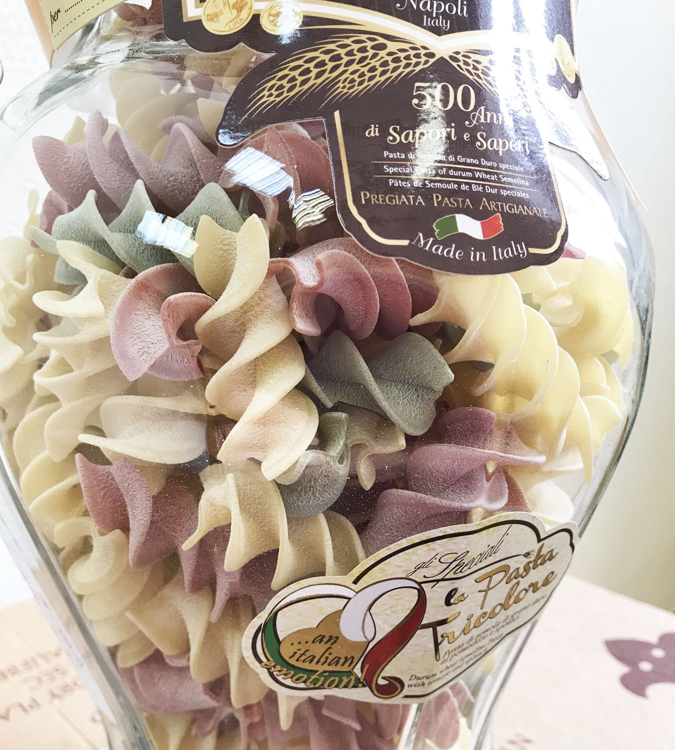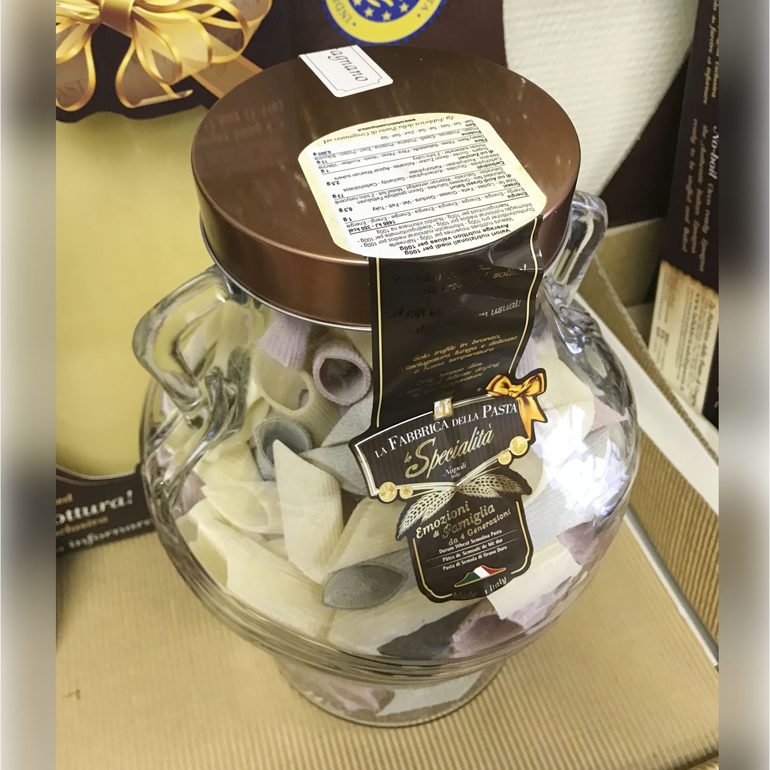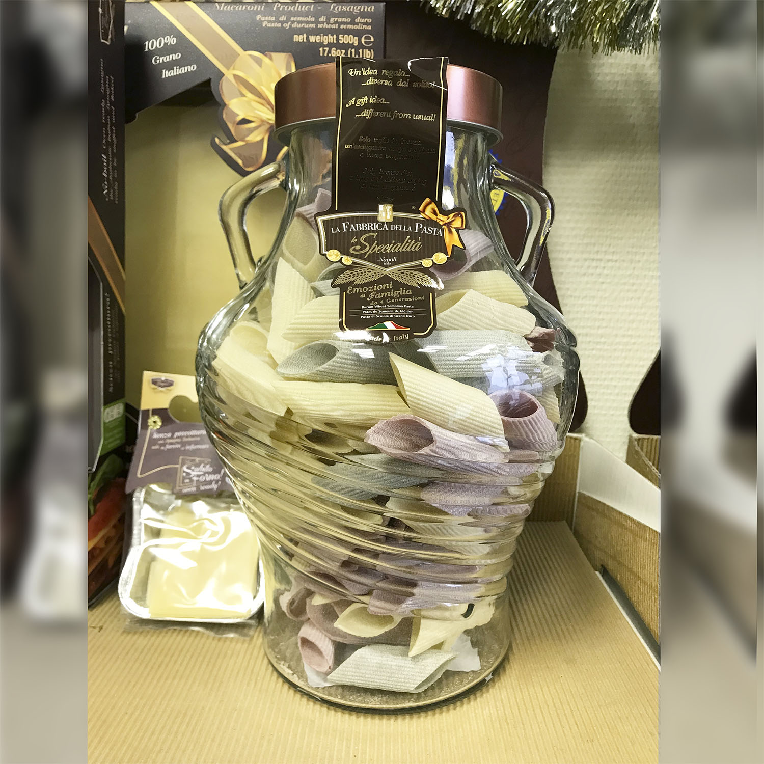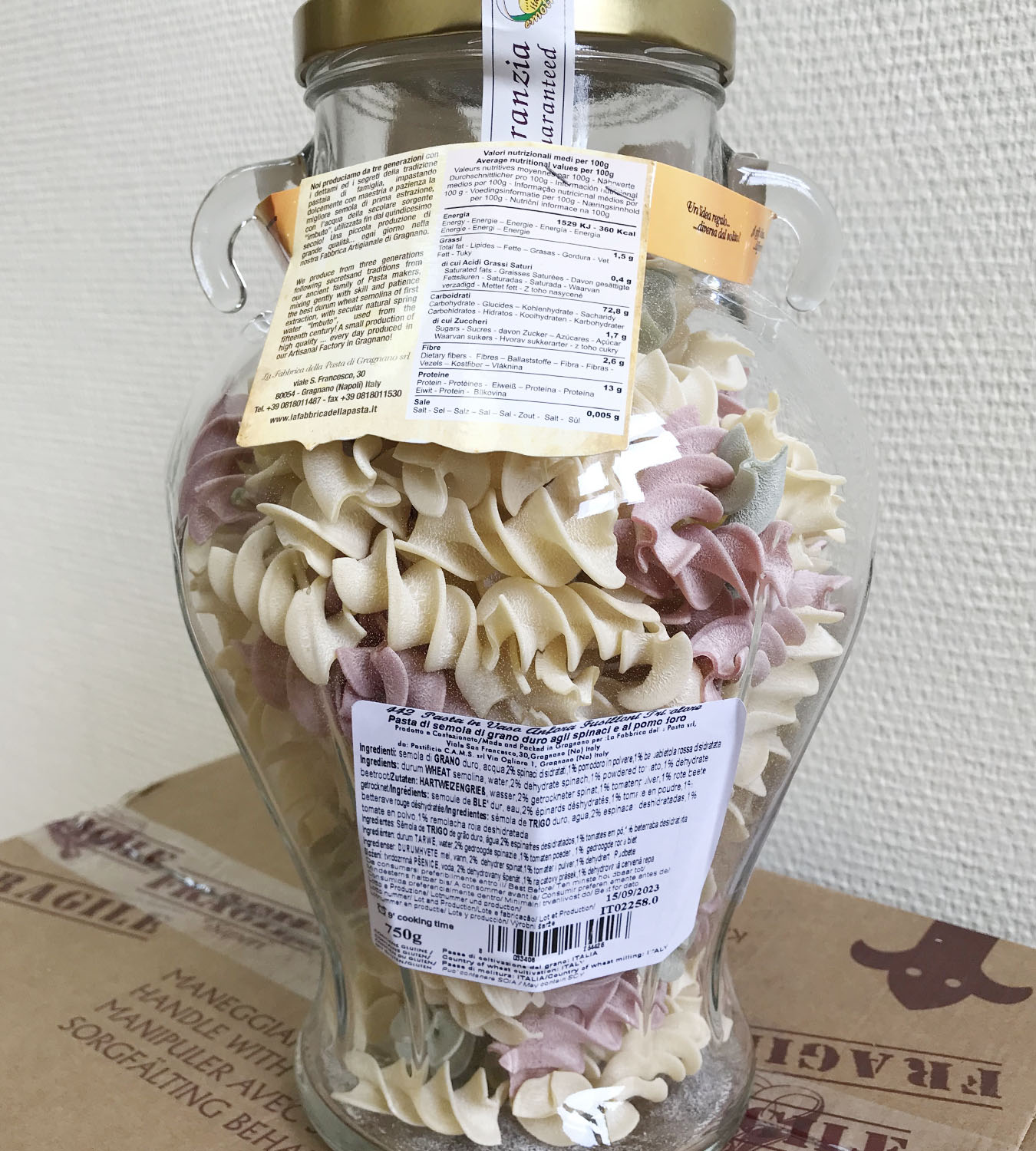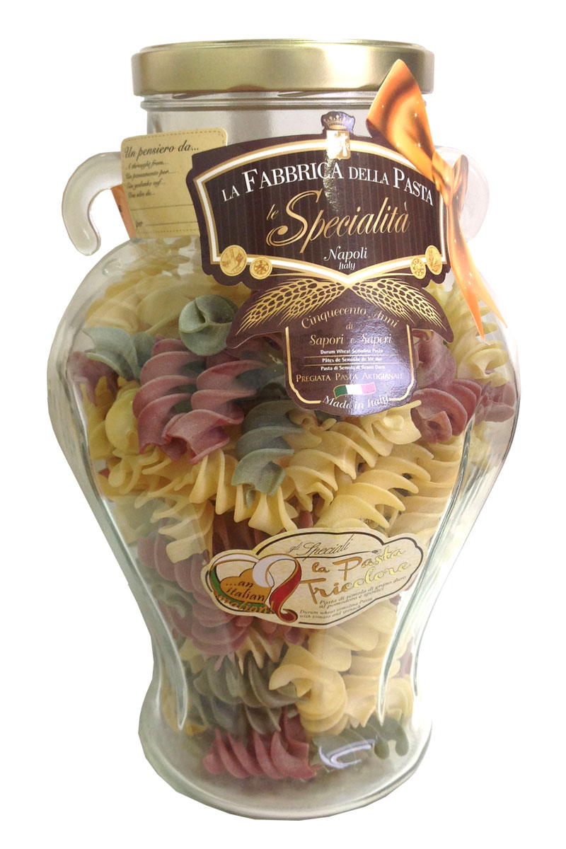 Подарочный набор "Амфора" состоит из стеклянной амфоры, изготовленной в старинном стиле с винтовой крышкой, заполненной трёхцветной пастой Tricolore различных форм. Необычный, приятный подарок и амфора потом пригодится :)