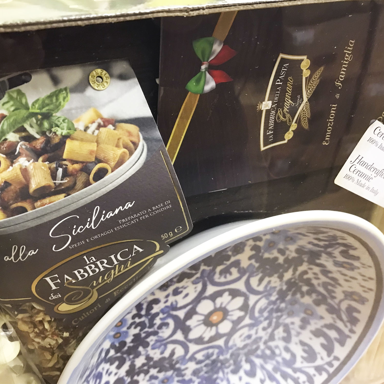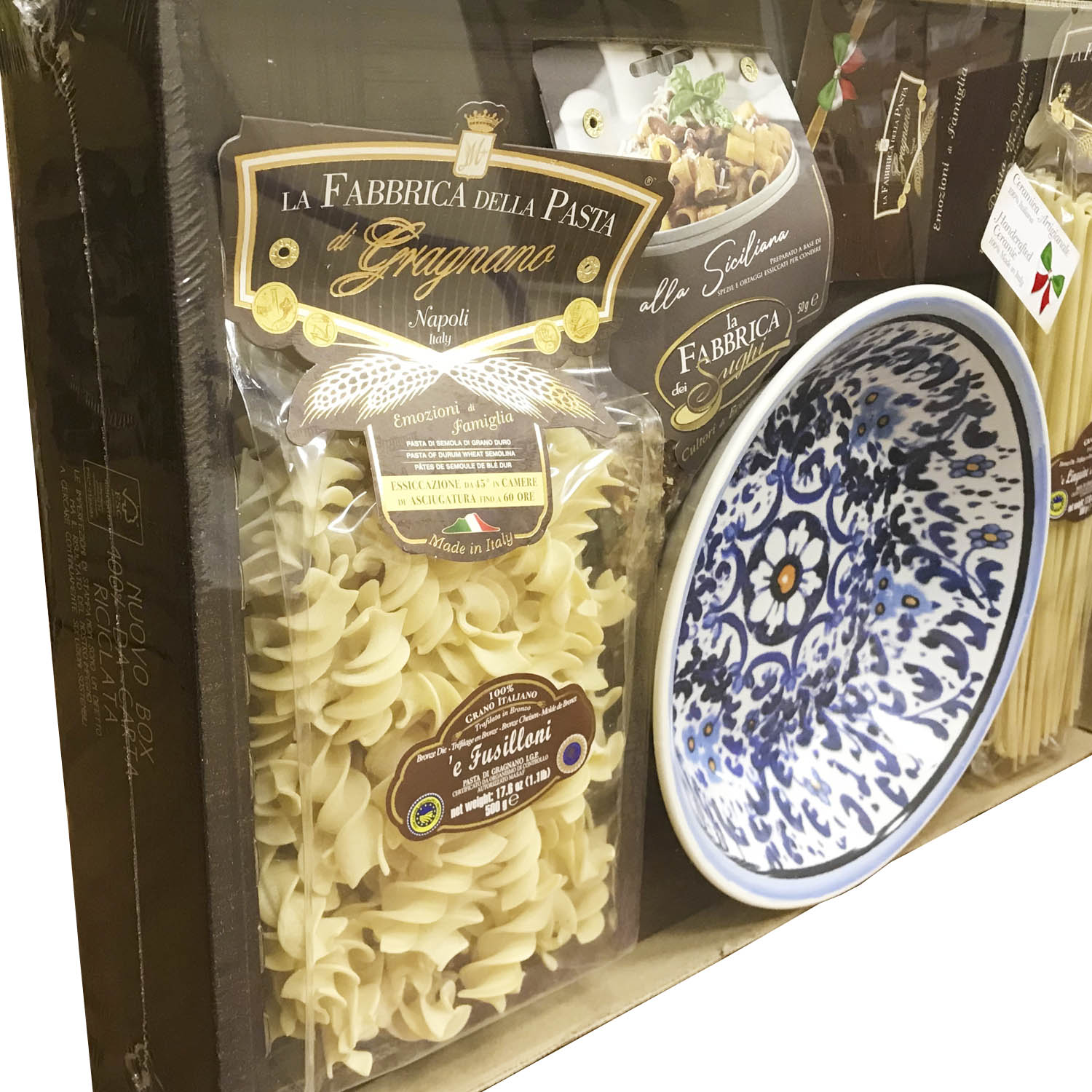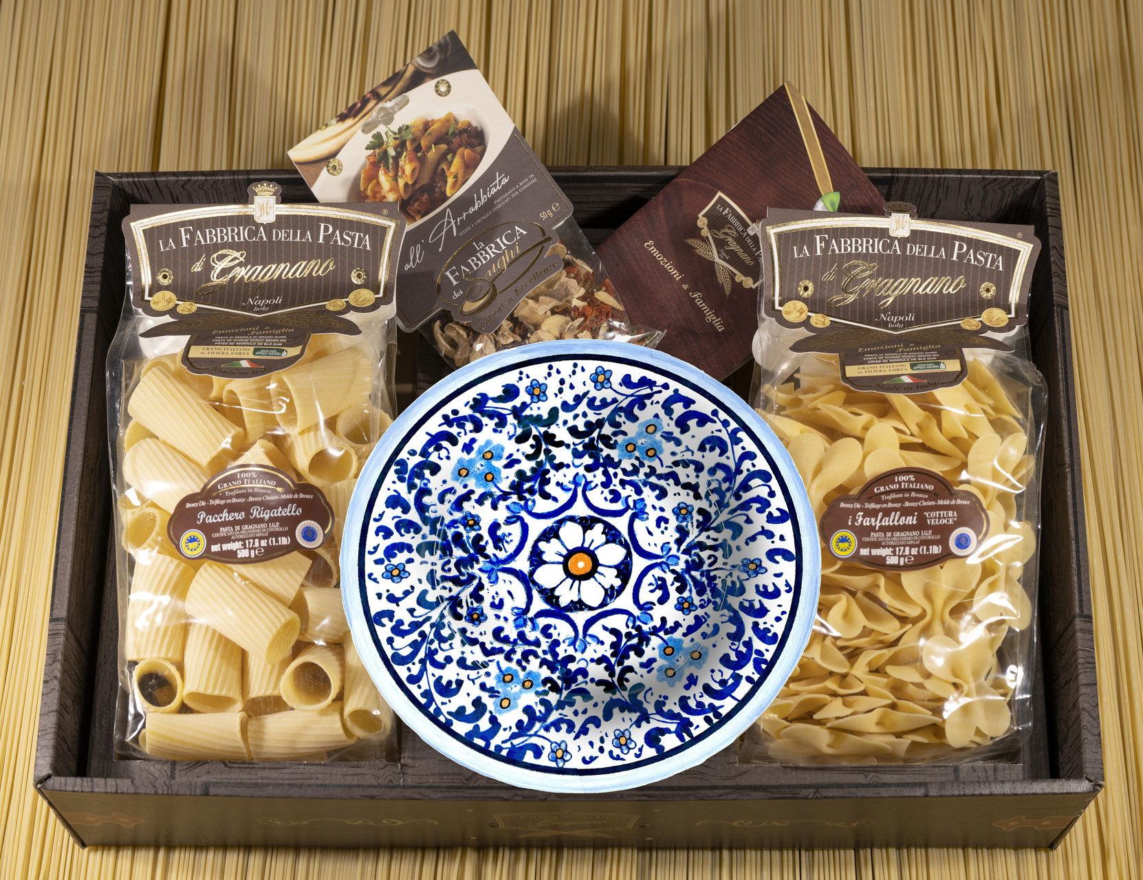 Подарочный набор "Позитано Плюс (тарелка 25 см)" - это оригинальный подарок, включающий две пачки пасты La Fabbrica della pasta di Gragnano, керамическую тарелку, расписанную в дизайне "Позитано", приправу для приготовления соуса и брошюру с оригинальными итальянскими рецептами и всё это в эксклюзивной коробке, оформленной в стиле "старинный сундучок". Набор полностью собирается и бережно упаковывается в Италии. Готовое решение прекрасного подарка!