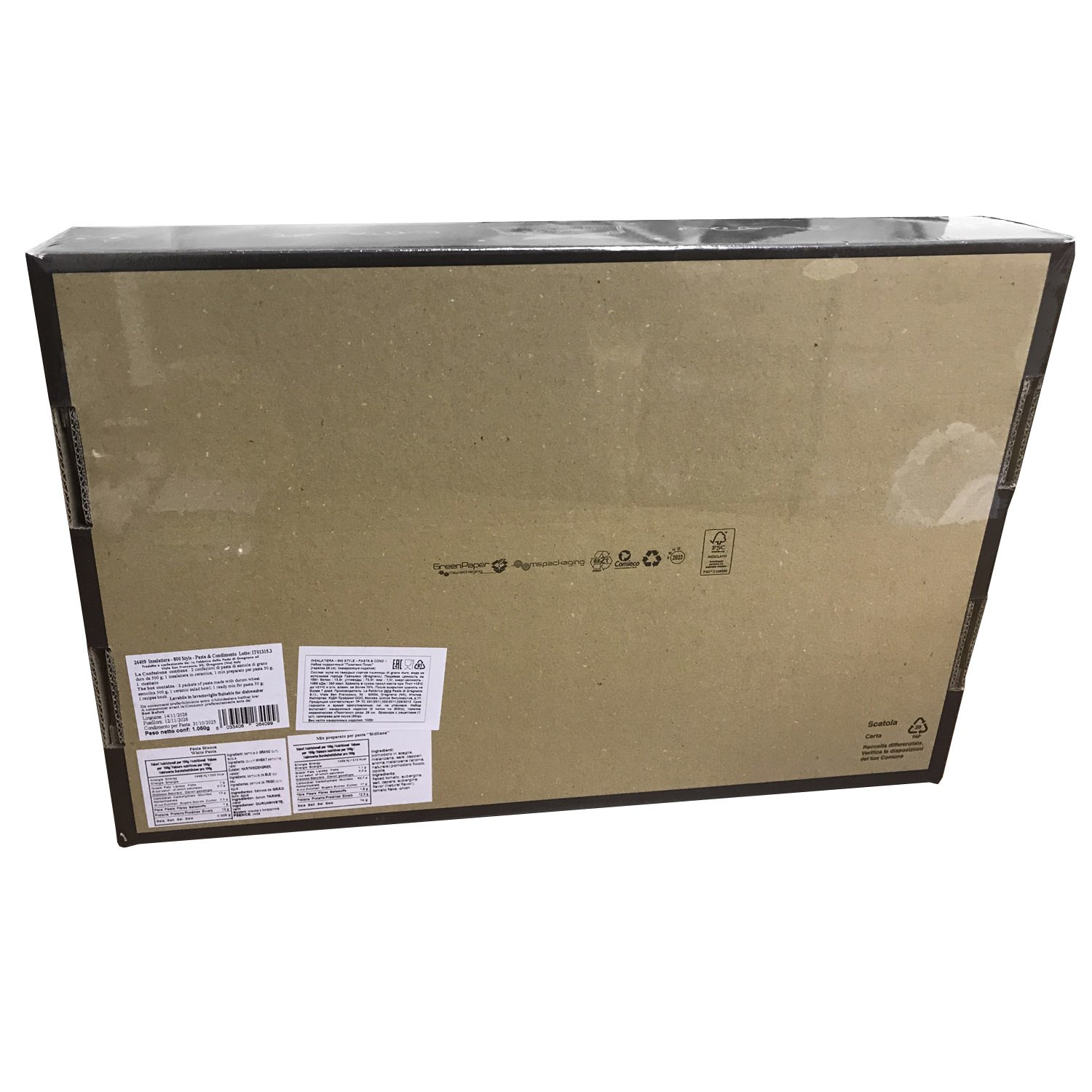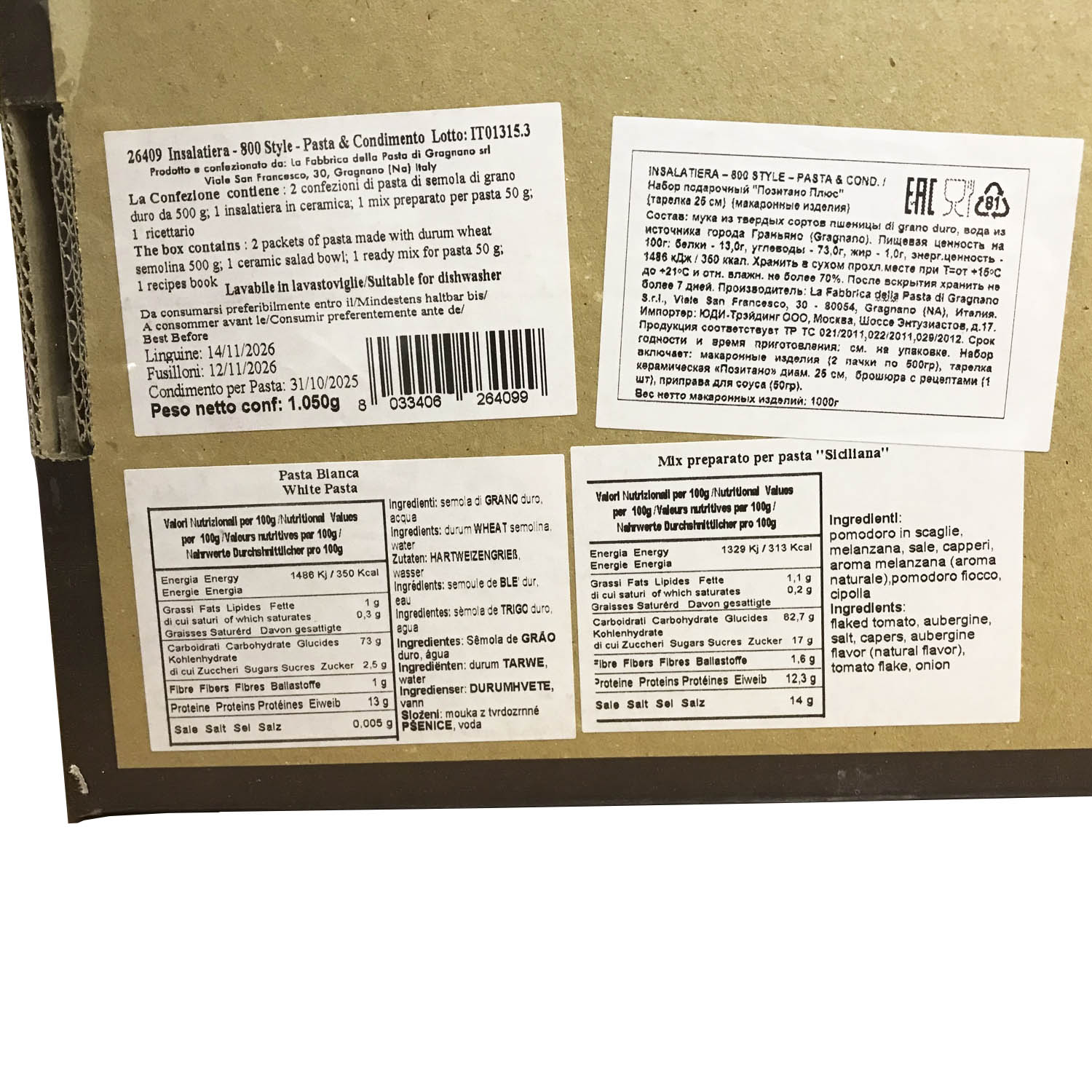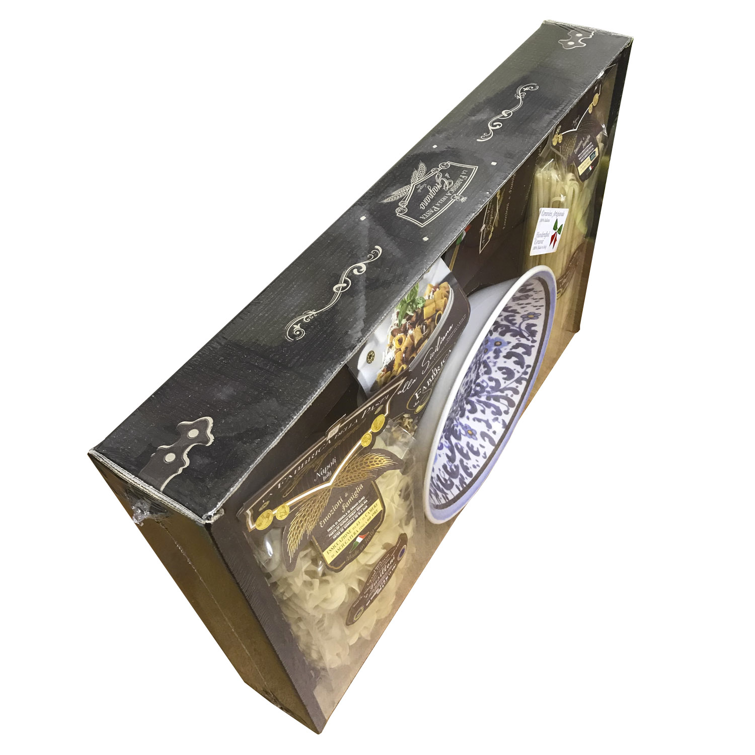 Подарочный набор "Позитано Плюс (тарелка 25 см)" - это оригинальный подарок, включающий две пачки пасты La Fabbrica della pasta di Gragnano, керамическую тарелку, расписанную в дизайне "Позитано", приправу для приготовления соуса и брошюру с оригинальными итальянскими рецептами и всё это в эксклюзивной коробке, оформленной в стиле "старинный сундучок". Набор полностью собирается и бережно упаковывается в Италии. Готовое решение прекрасного подарка!