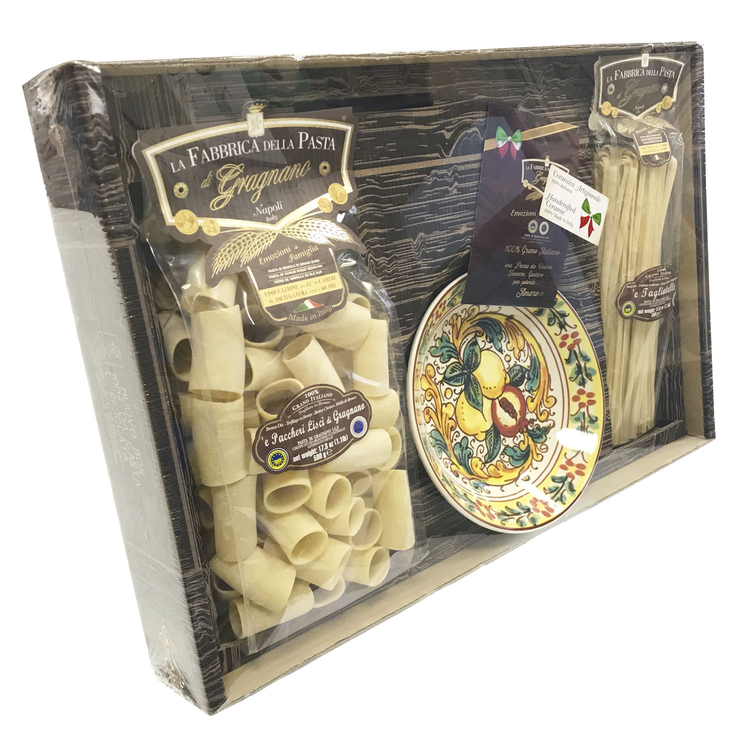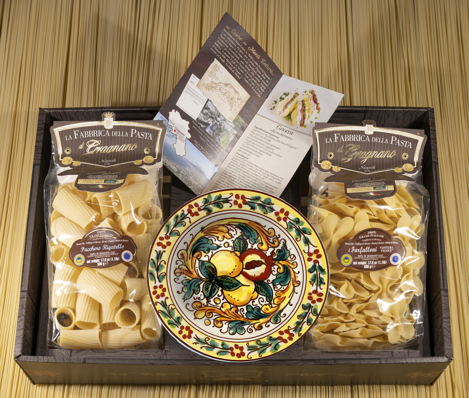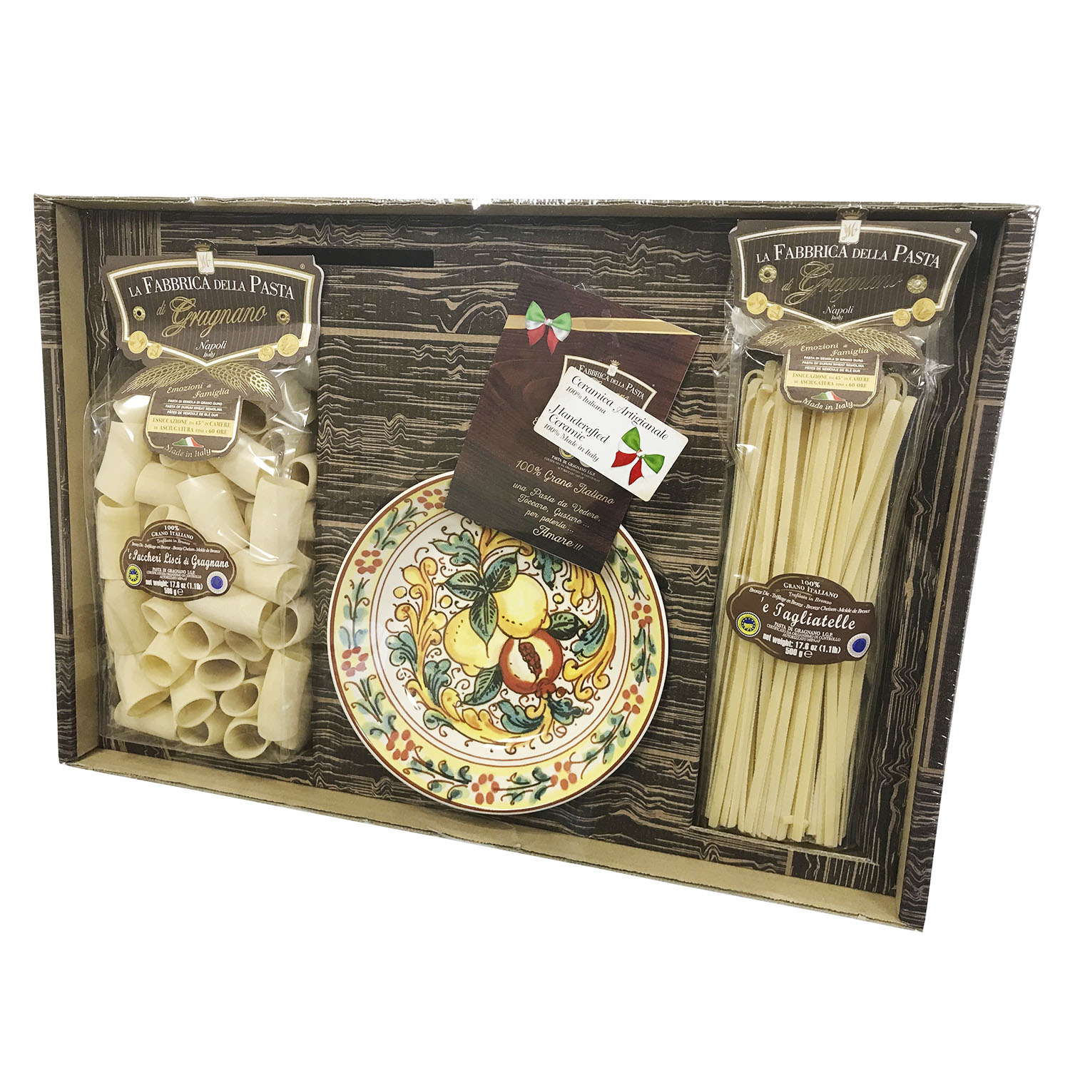 Подарочный набор "Сорренто (тарелка 21 см)" - это оригинальный подарок, включающий две пачки пасты La Fabbrica della pasta di Gragnano, керамическую тарелку, расписанную в дизайне "Сорренто", брошюру с оригинальными итальянскими рецептами и всё это в эксклюзивной коробке, оформленной в стиле "старинный сундучок". Набор полностью собирается и бережно упаковывается в Италии. Готовое решение прекрасного подарка!