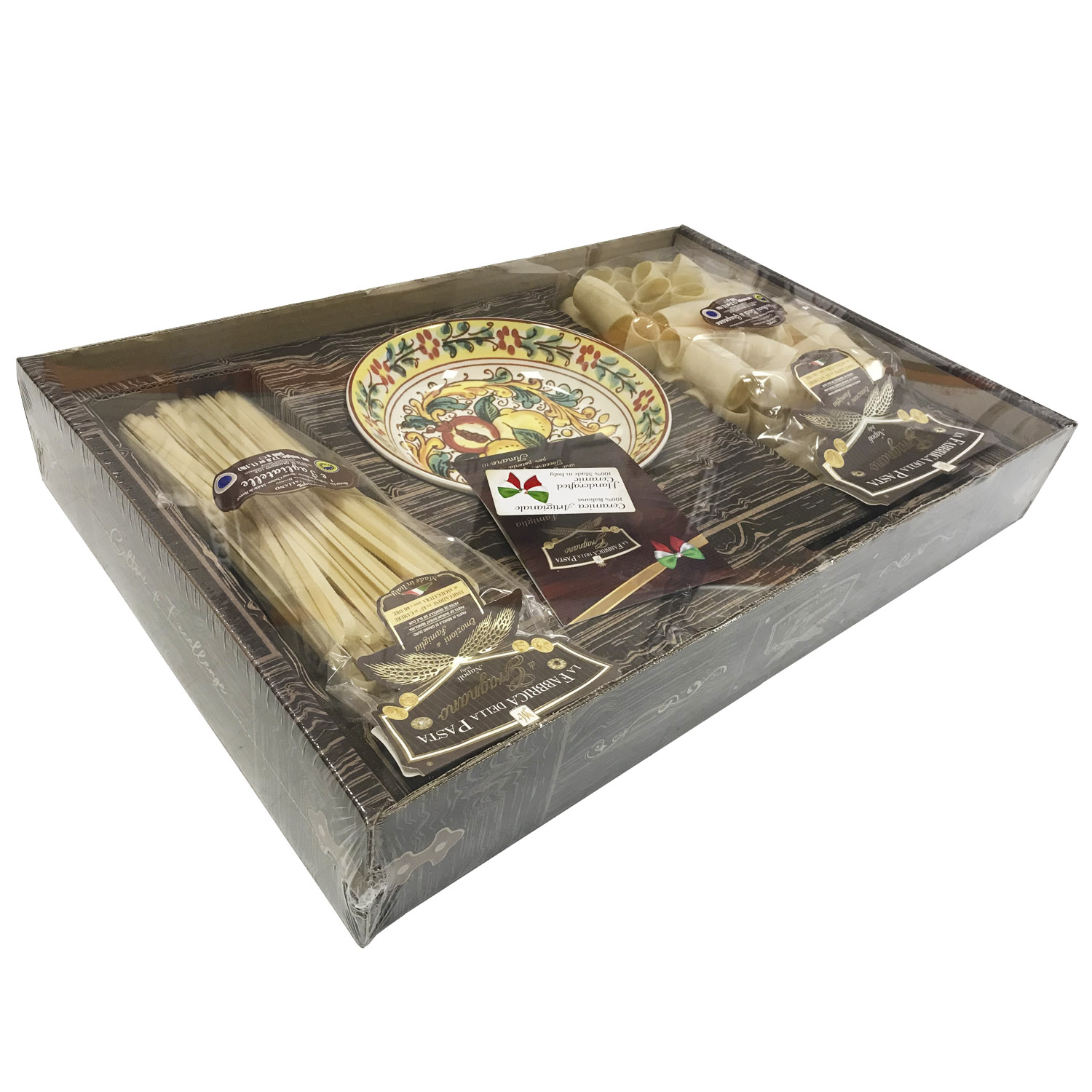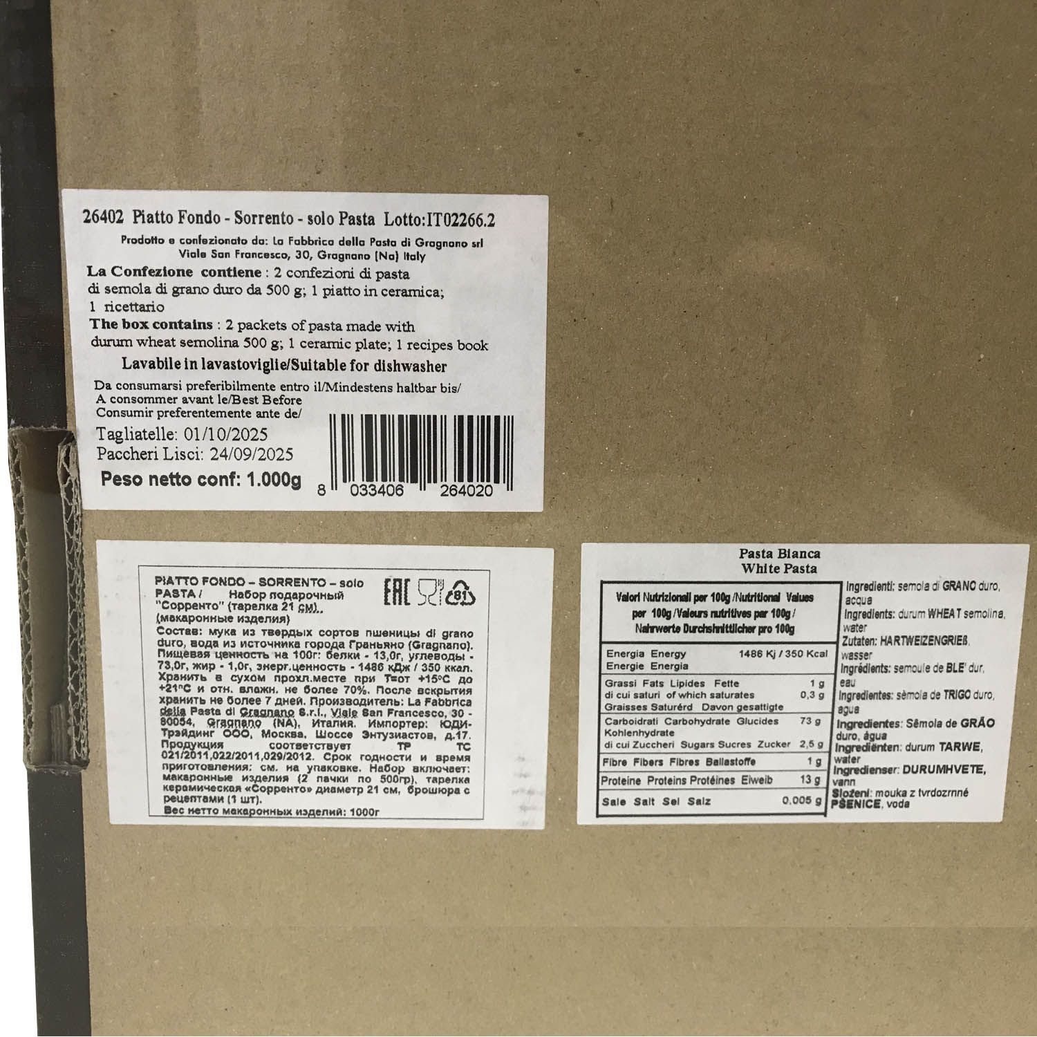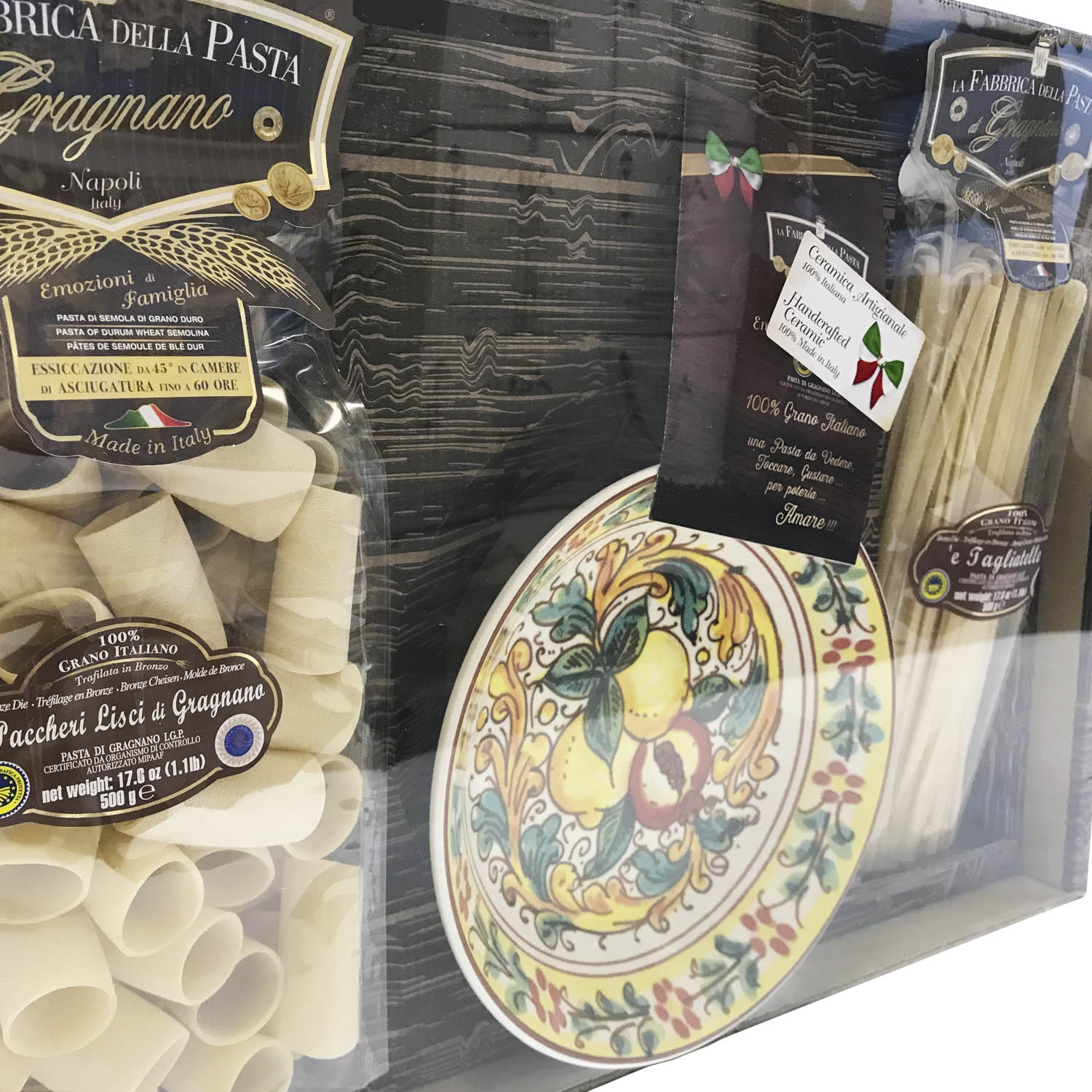Подарочный набор "Сорренто (тарелка 21 см)" - это оригинальный подарок, включающий две пачки пасты La Fabbrica della pasta di Gragnano, керамическую тарелку, расписанную в дизайне "Сорренто", брошюру с оригинальными итальянскими рецептами и всё это в эксклюзивной коробке, оформленной в стиле "старинный сундучок". Набор полностью собирается и бережно упаковывается в Италии. Готовое решение прекрасного подарка!