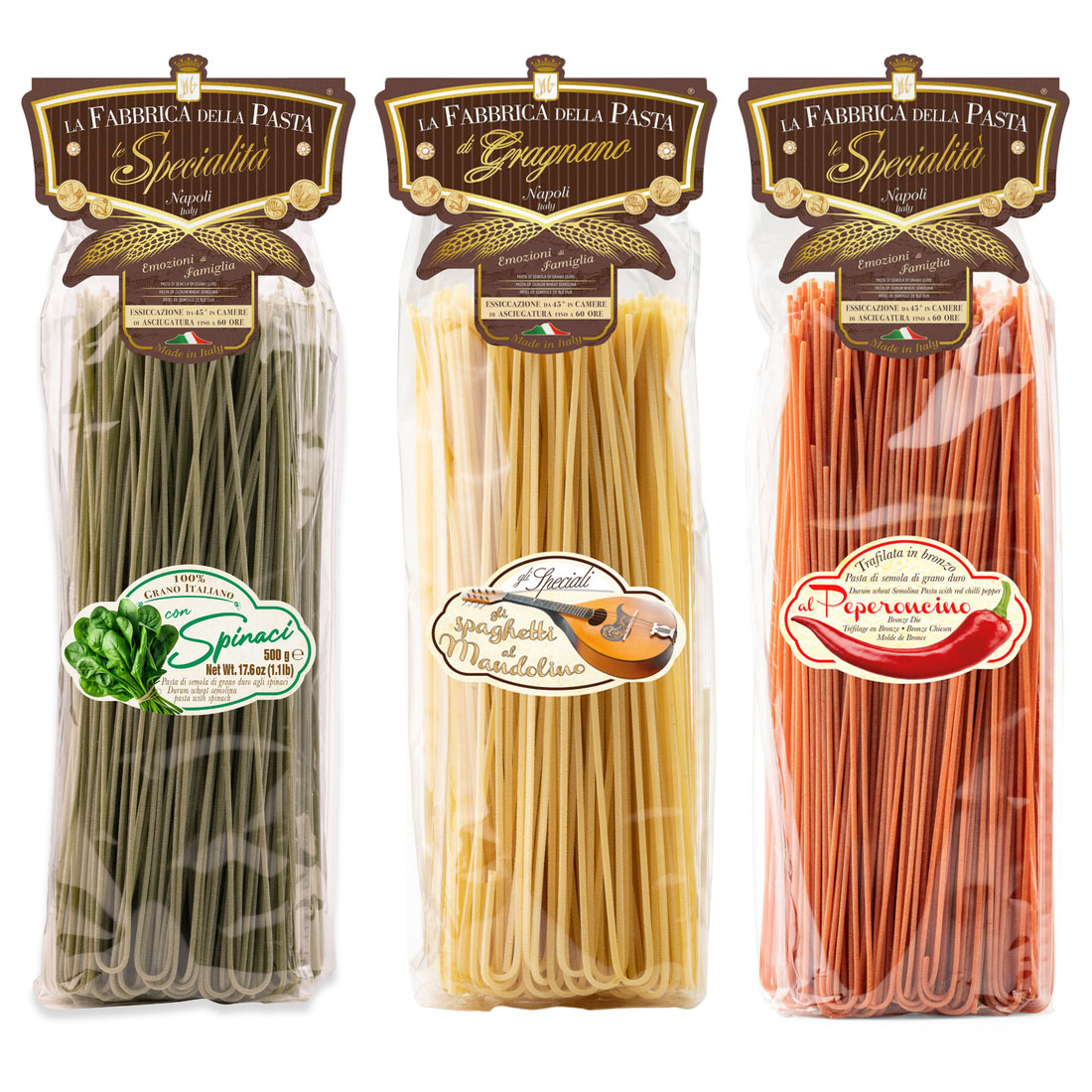 Подарочный набор "Спагетти Мания" включает три вида длинной классической пасты спагетти (55 см) с различными вкусами, включая: