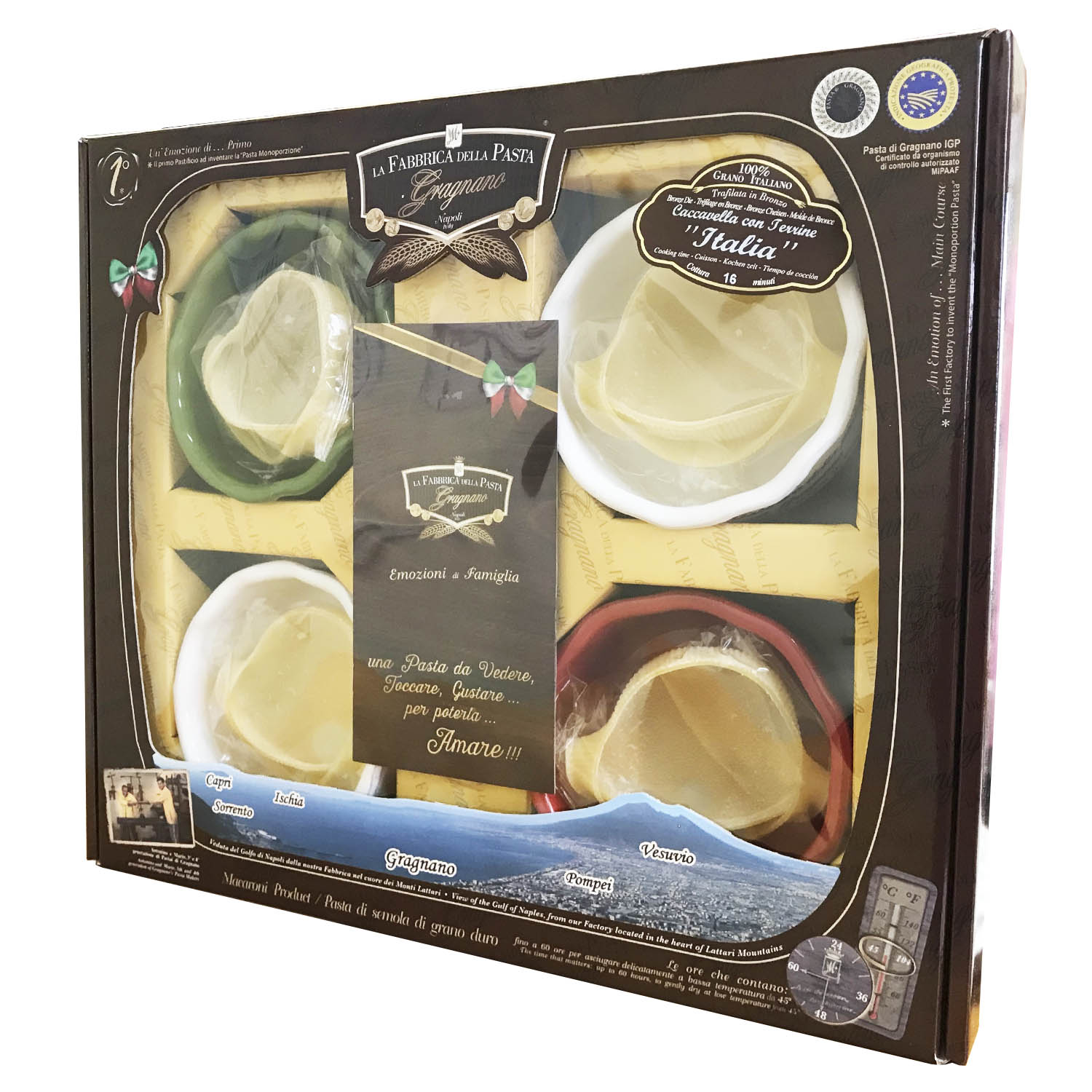 Подарочный набор "Ужин по-итальянски". Это эксклюзивных набор, состоящий пасты БОЛЬШАЯ РАКУШКА и четырёх эксклюзивных керамических горшочков в цвета итальянского триколора для запекания. Пасту рекомендуется слегка отварить, нафаршировать и запечь в керамическом горшке до готовности. В наборе есть всё, что для этого требуется...и даже брошюра с рецептами :) Друзья оценят результат!