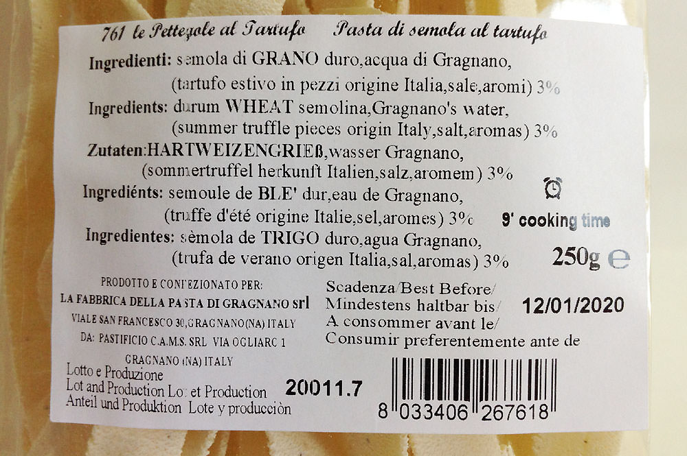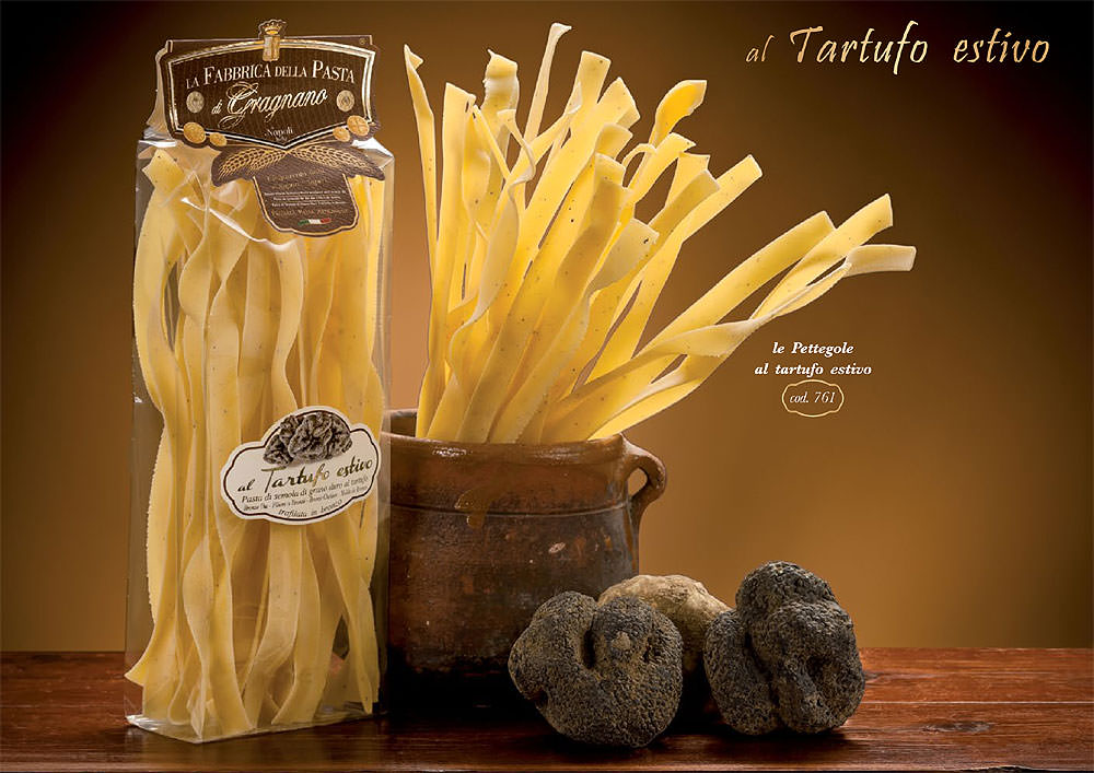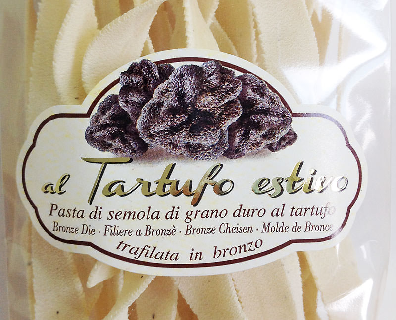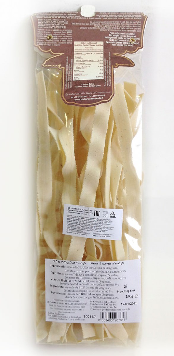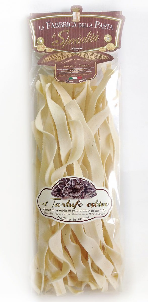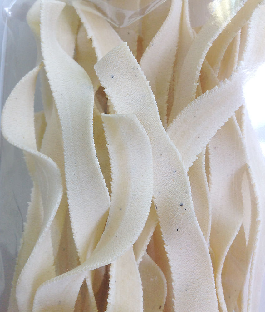 Широкая длинная паста (типа паппарделле) с добавлением черного трюфеля (летнего) для гурманов и не только. Ароматную трюфельную пасту можно готовить просто и оливковым маслом и наслаждаться вкусом, а можно дополнить кремом из черного трюфеля или же карпаччо из черного трюфеля.