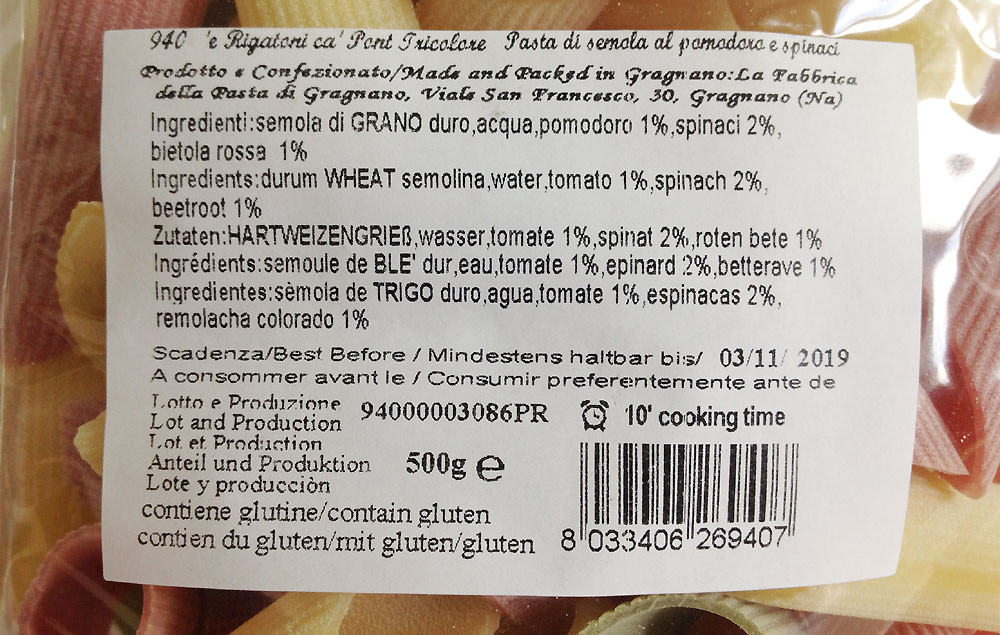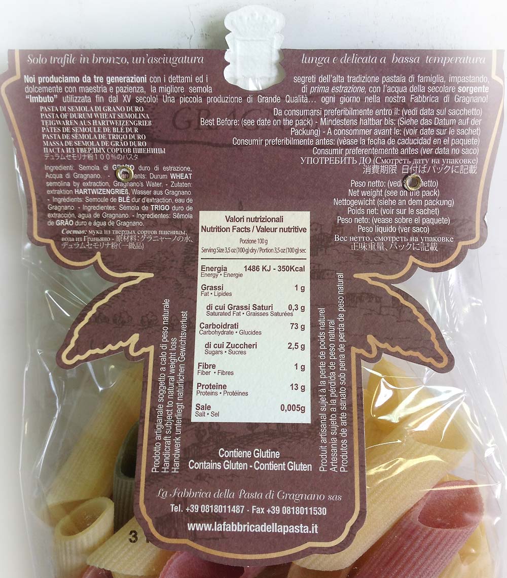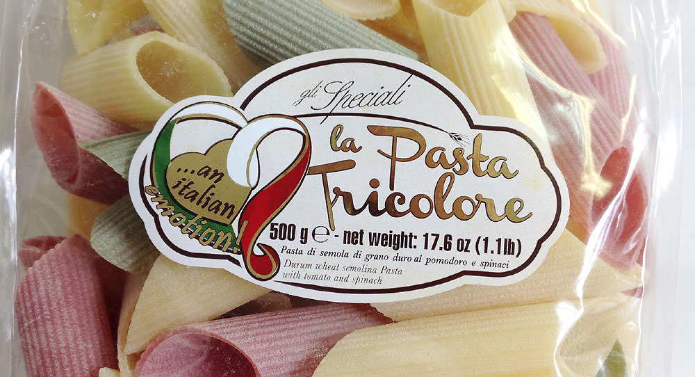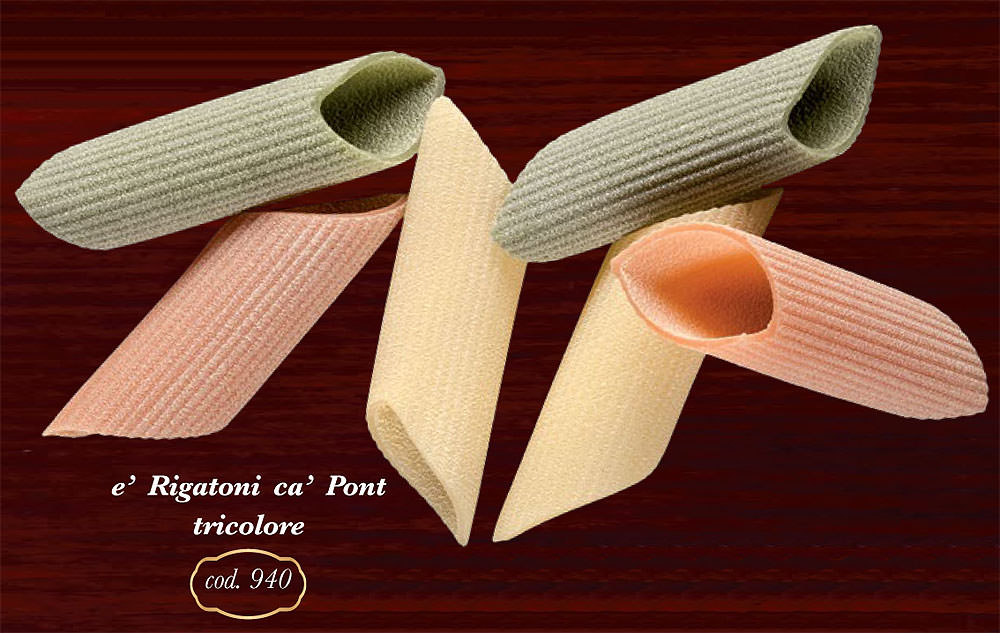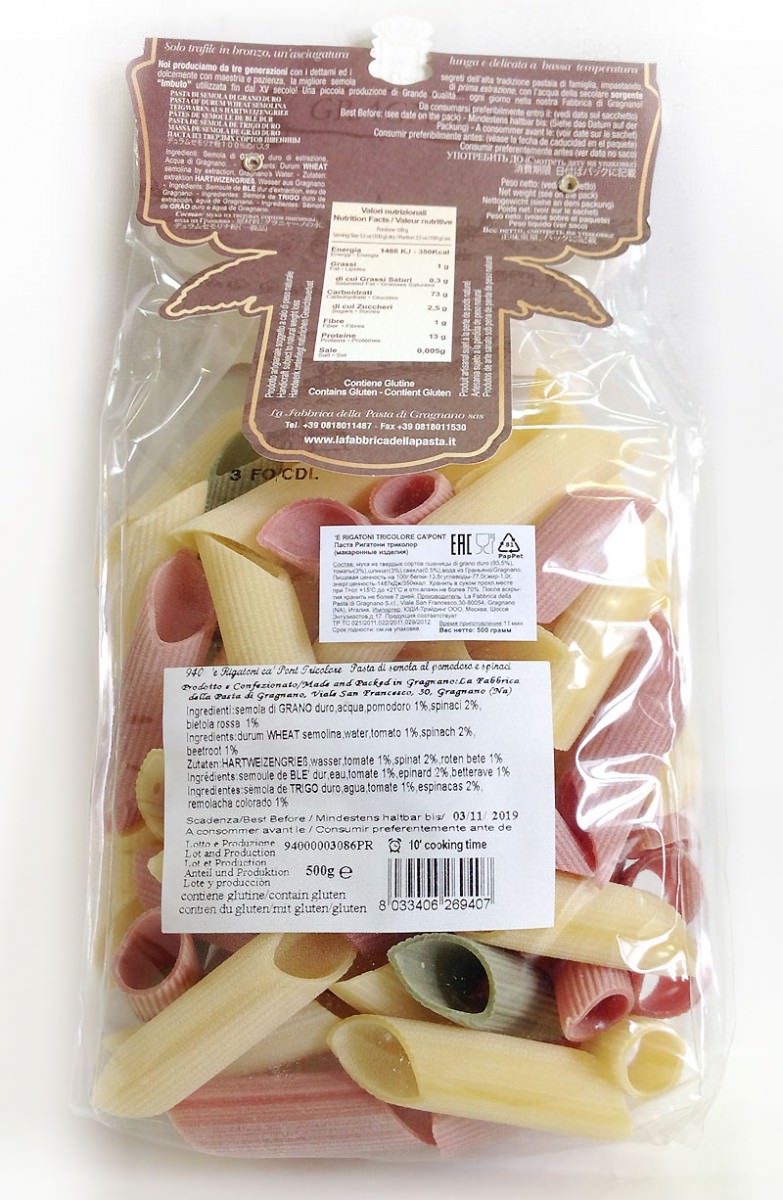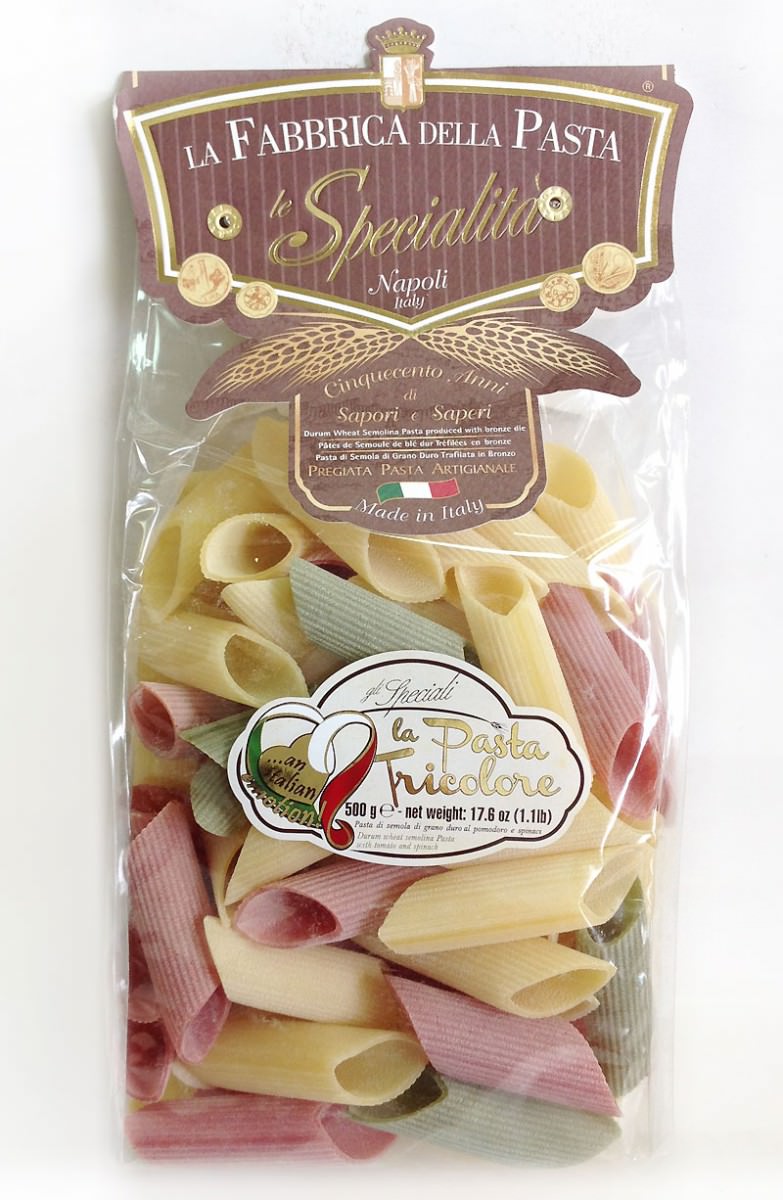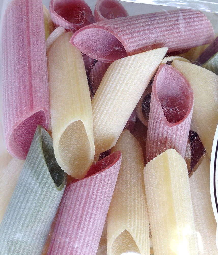 Паста "трёхцветная", с добавлением шпината, томата и свеклы, в форме рифленых рожков. Прекрасно сочетается с соусами на томатной основе, мясными соусами или же с артишоками и беконом.