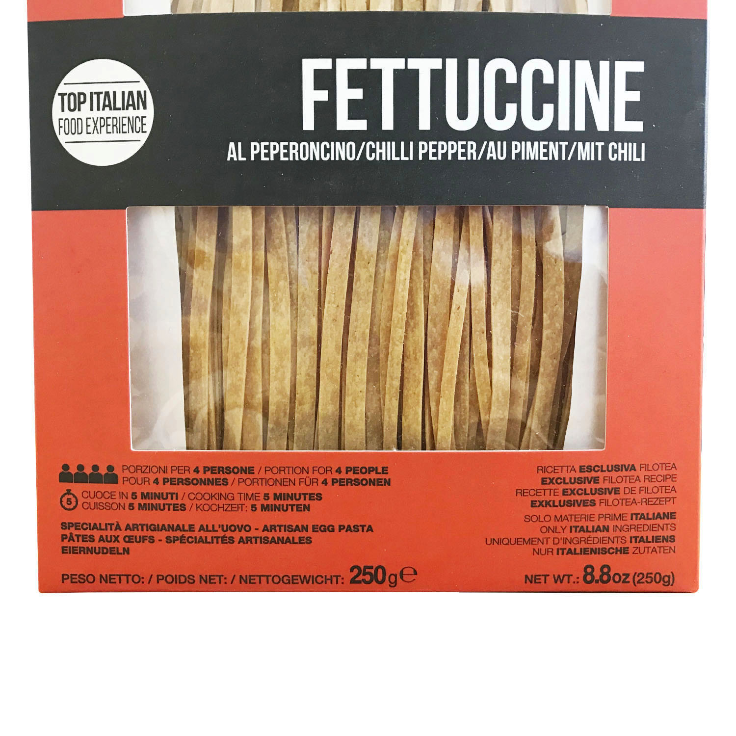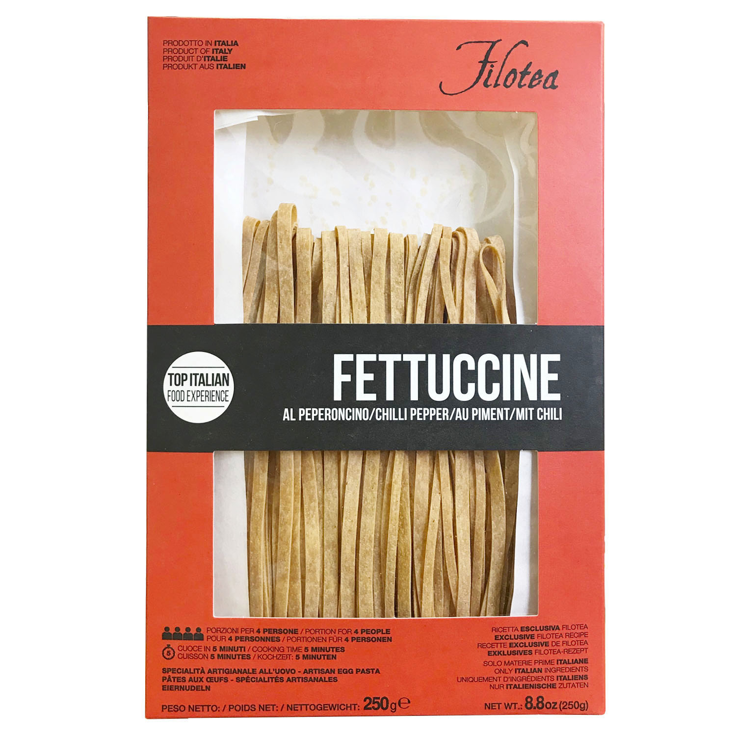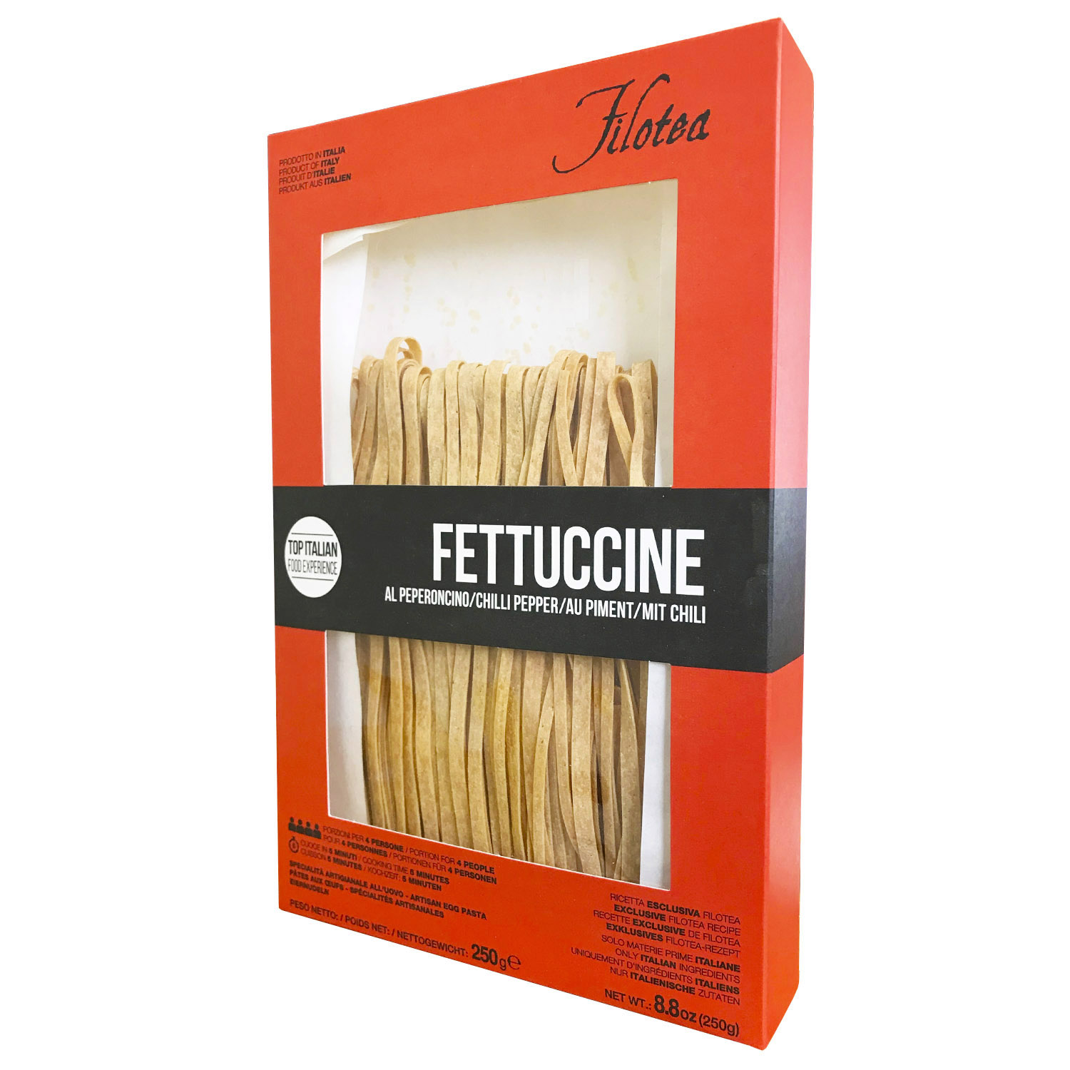 Яичная паста Феттуччине c добавлением острого красного перца. Освежит и придаст пикантную ноту вашему блюду. Для тех, кто любит по-горячее. Длинная паста шириной 1 см.