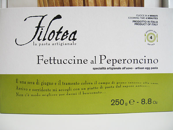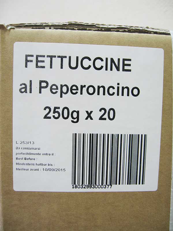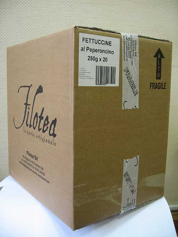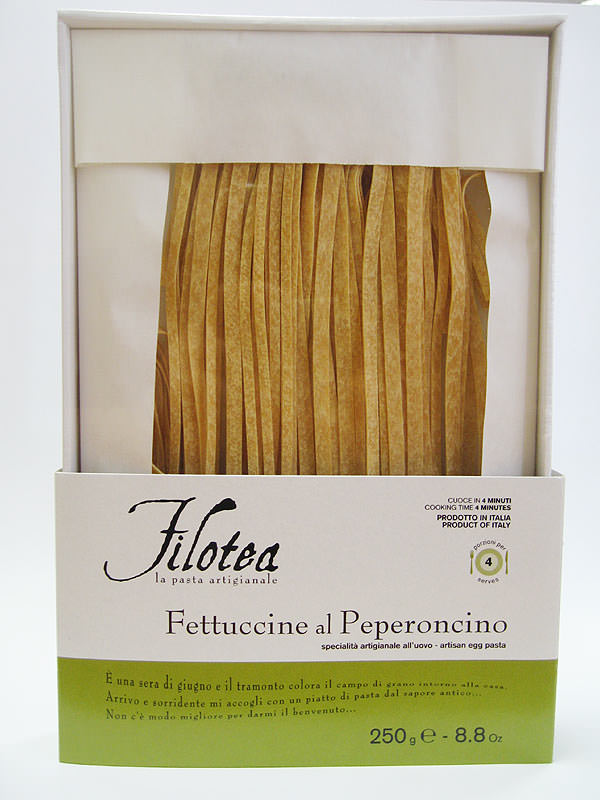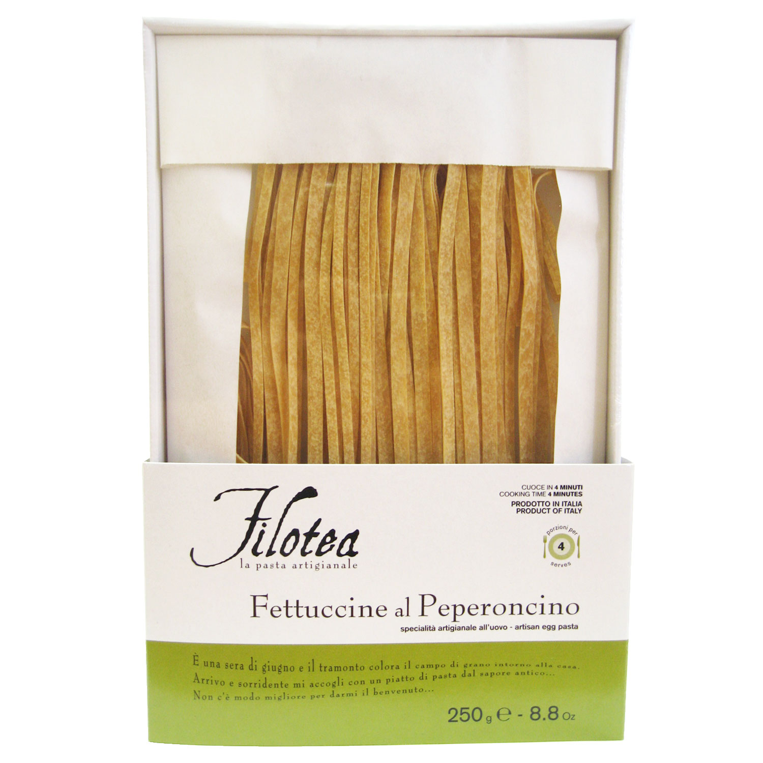 Яичная паста Феттуччине c добавлением острого красного перца. Освежит и придаст пикантную ноту вашему блюду. Для тех, кто любит по-горячее. Длинная паста шириной 1 см.
