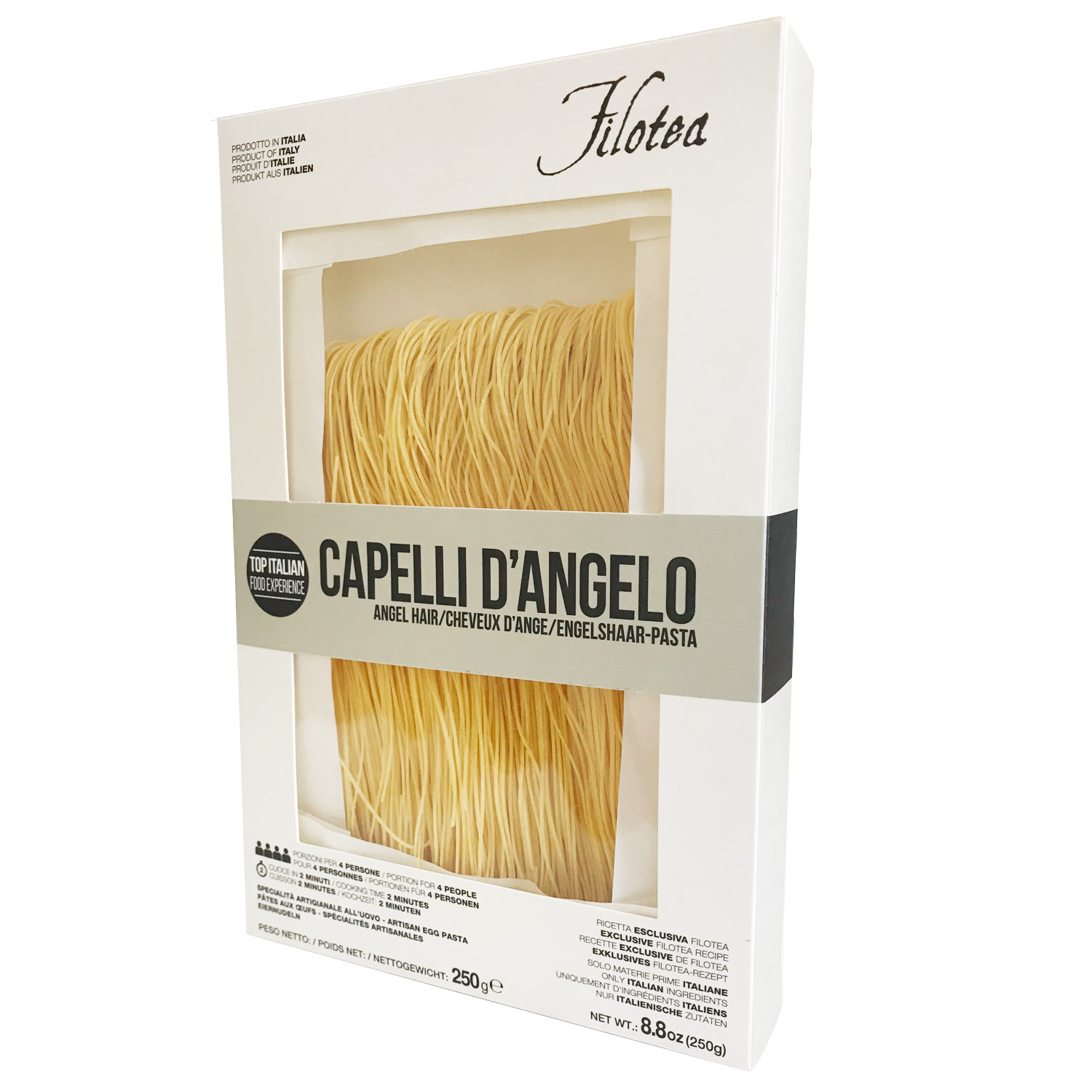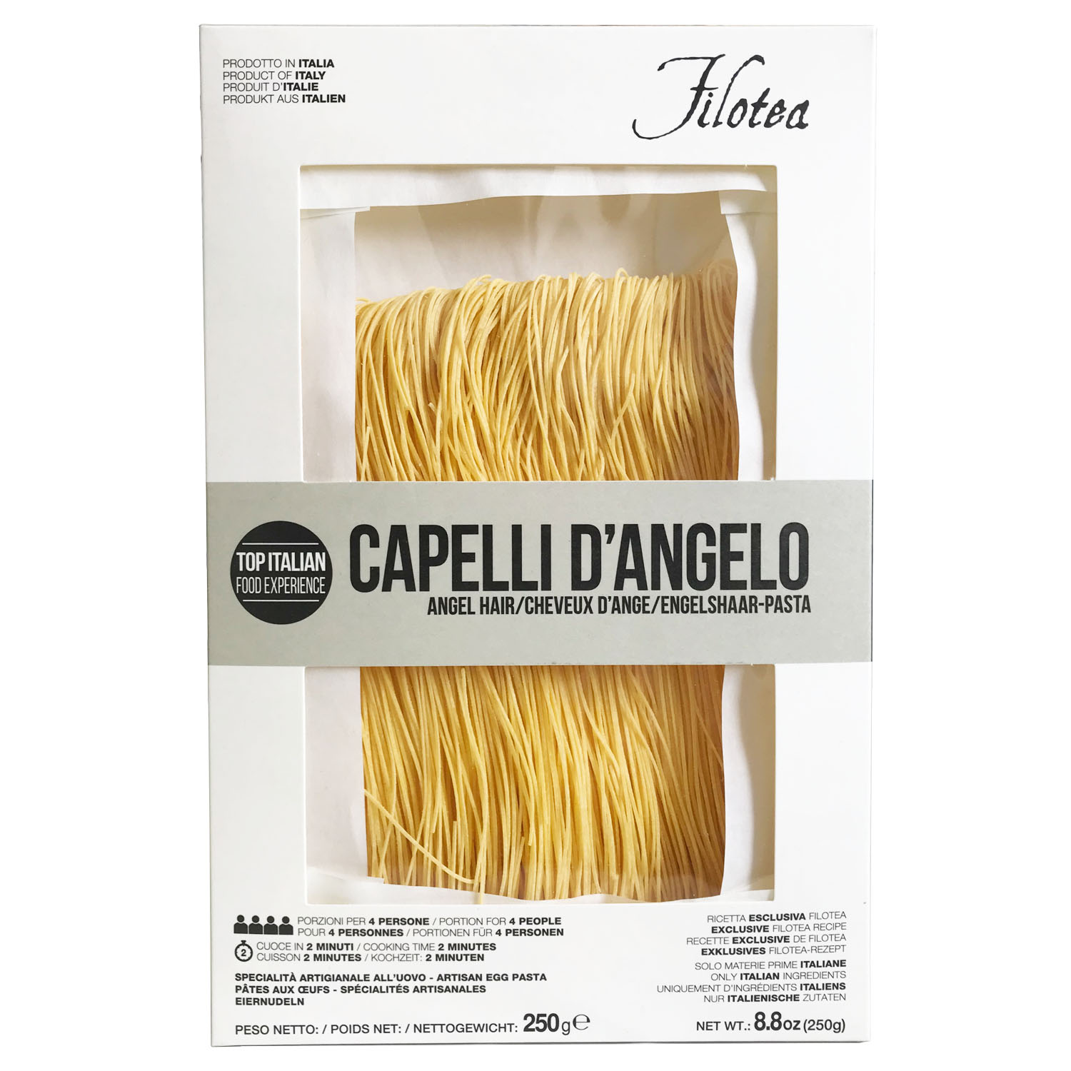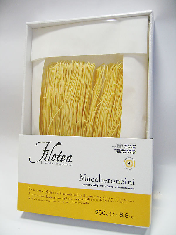 Яичная паста ручной работы Маккерончини (Капелли Д'Анджело) - самый тонкий вид пасты в мире типичный для региона Марке. Хорошо сочетается с мясными соусами, овощными и рыбными.