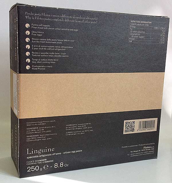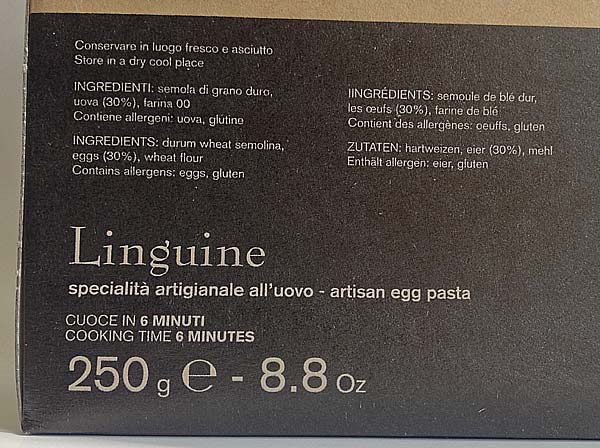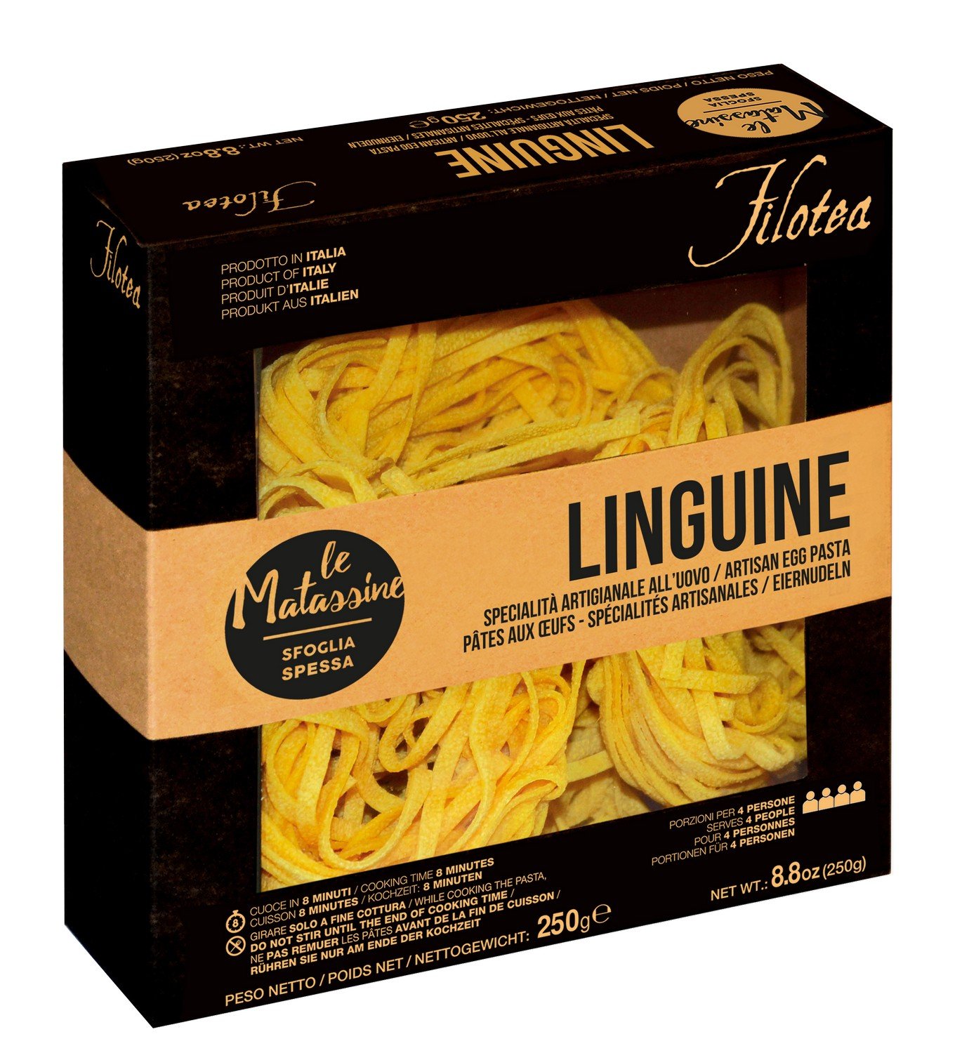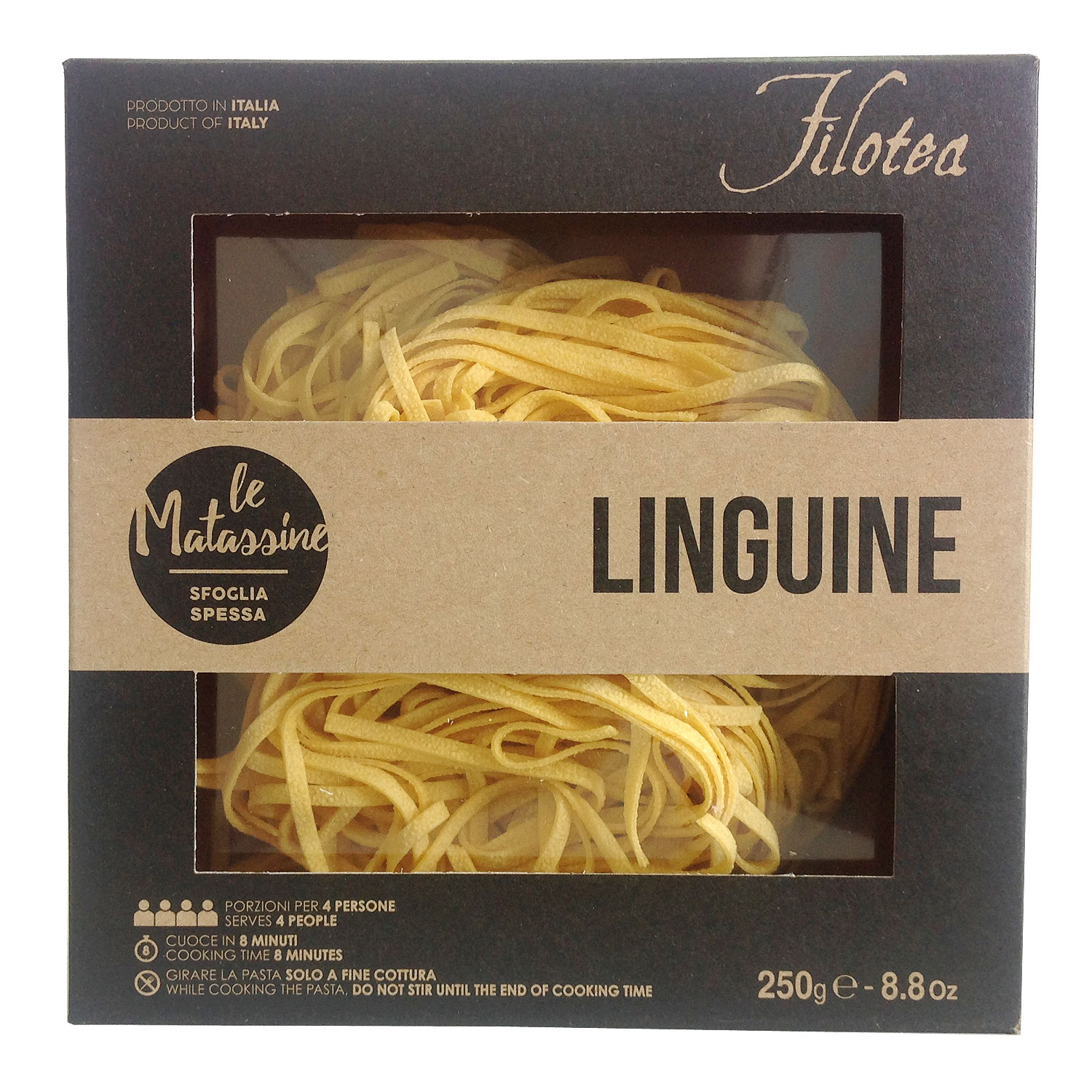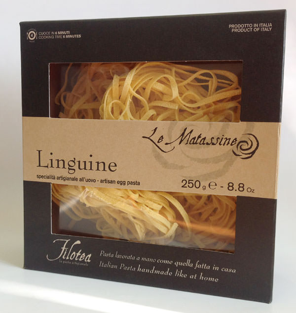 Яичная паста Матассине Лингвине ручной работы. Тесто пропускают через бронзовую фильеру для получения "пористой" "шероховатой" структуры, что позволяет соусу лучше проникать в структуру и раскрывать свои вкусовые качества. Классическая паста прекрасно сочетается с любыми соусами на ваш выбор и вкус.