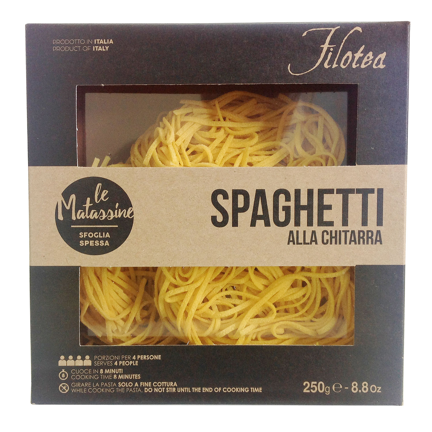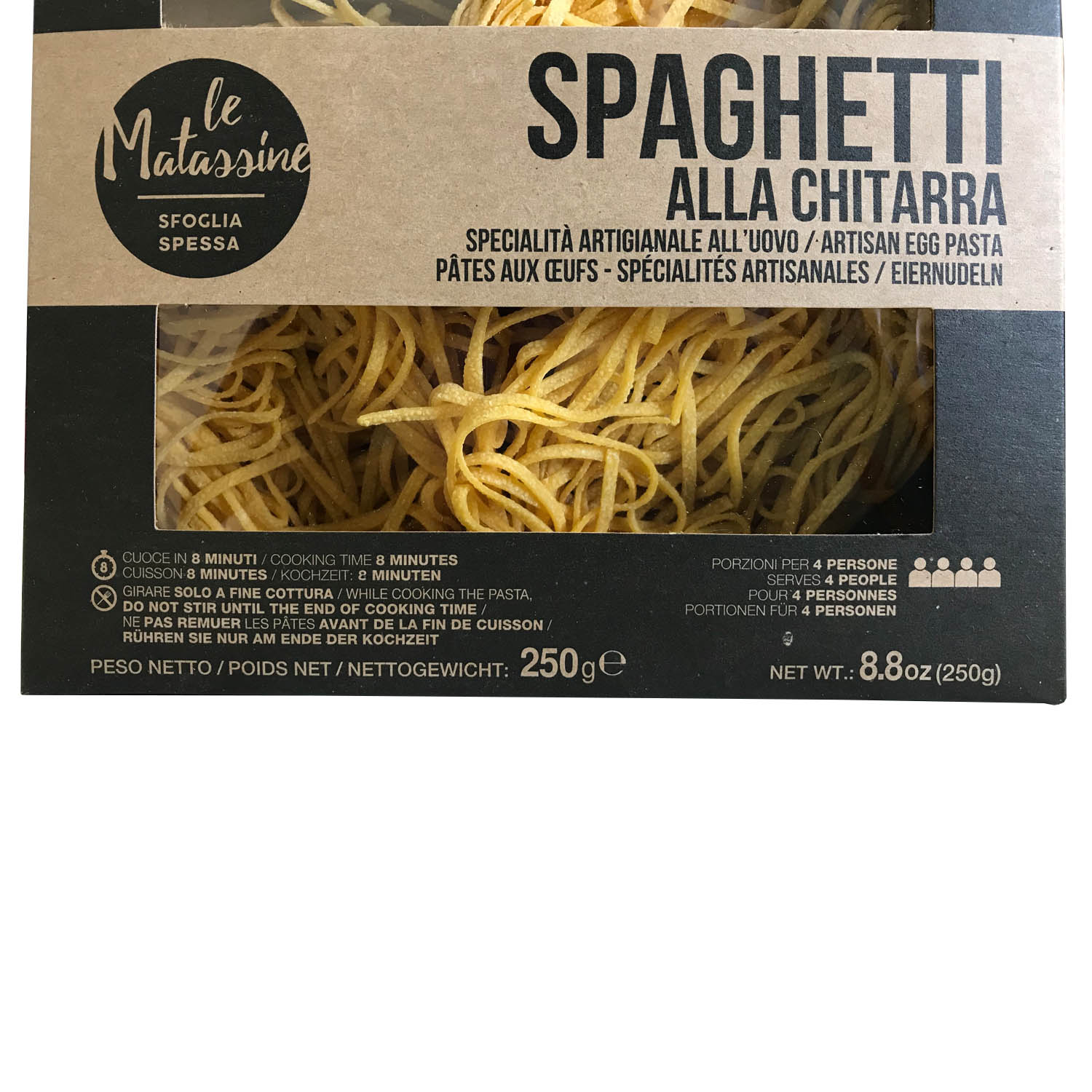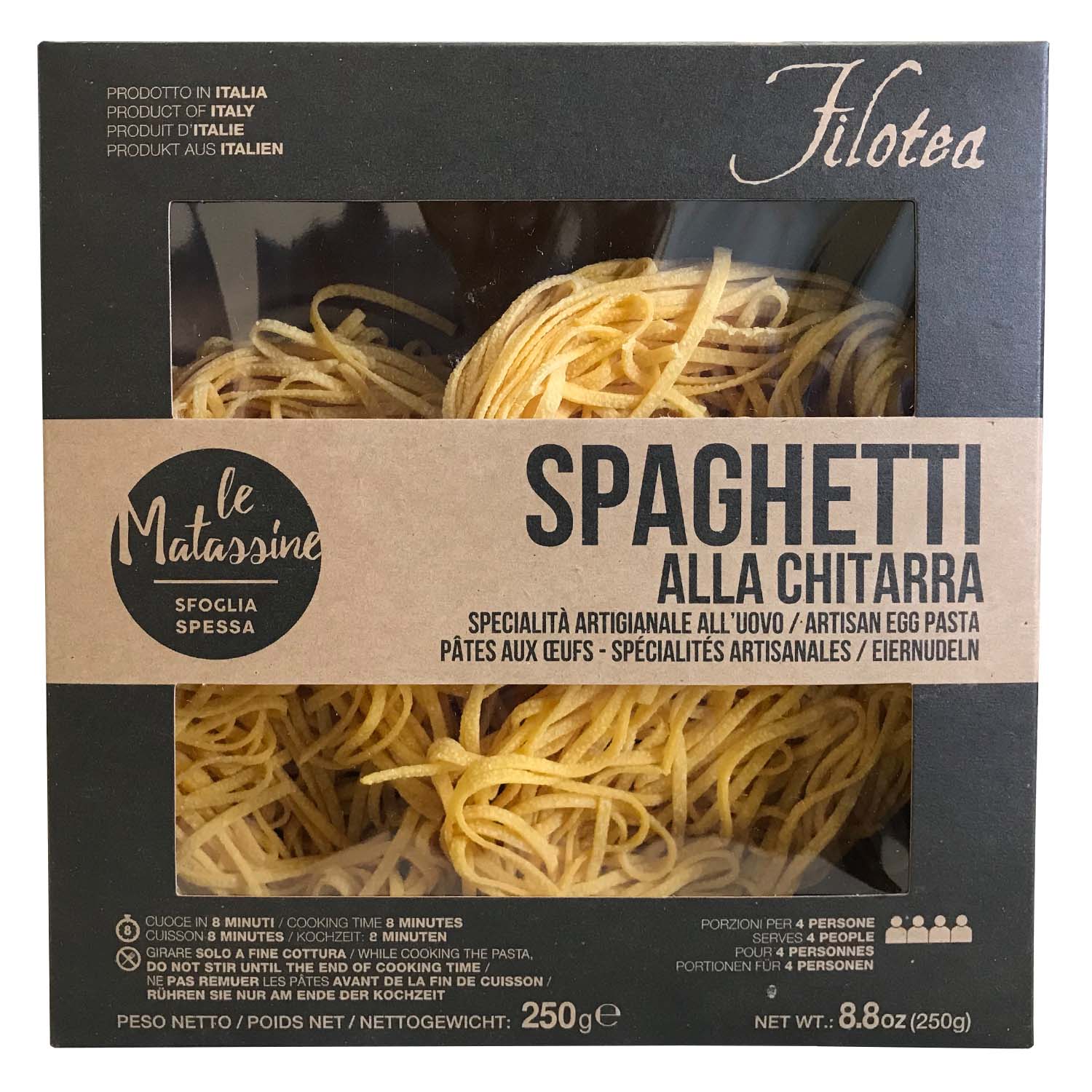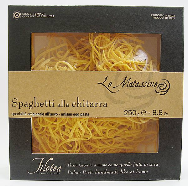 Яичная паста Матассине Спагетти Китарра ручной работы - спагетти квадратной формы, благодаря интрументу "китарра" на котором они производятся. Тесто пропускают через бронзовую фильеру для получения "пористой" "шероховатой" структуры, что позволяет соусу лучше проникать в структуру и раскрывать свои вкусовые качества. Классическая паста прекрасно сочетается с любыми соусами на ваш выбор и вкус.