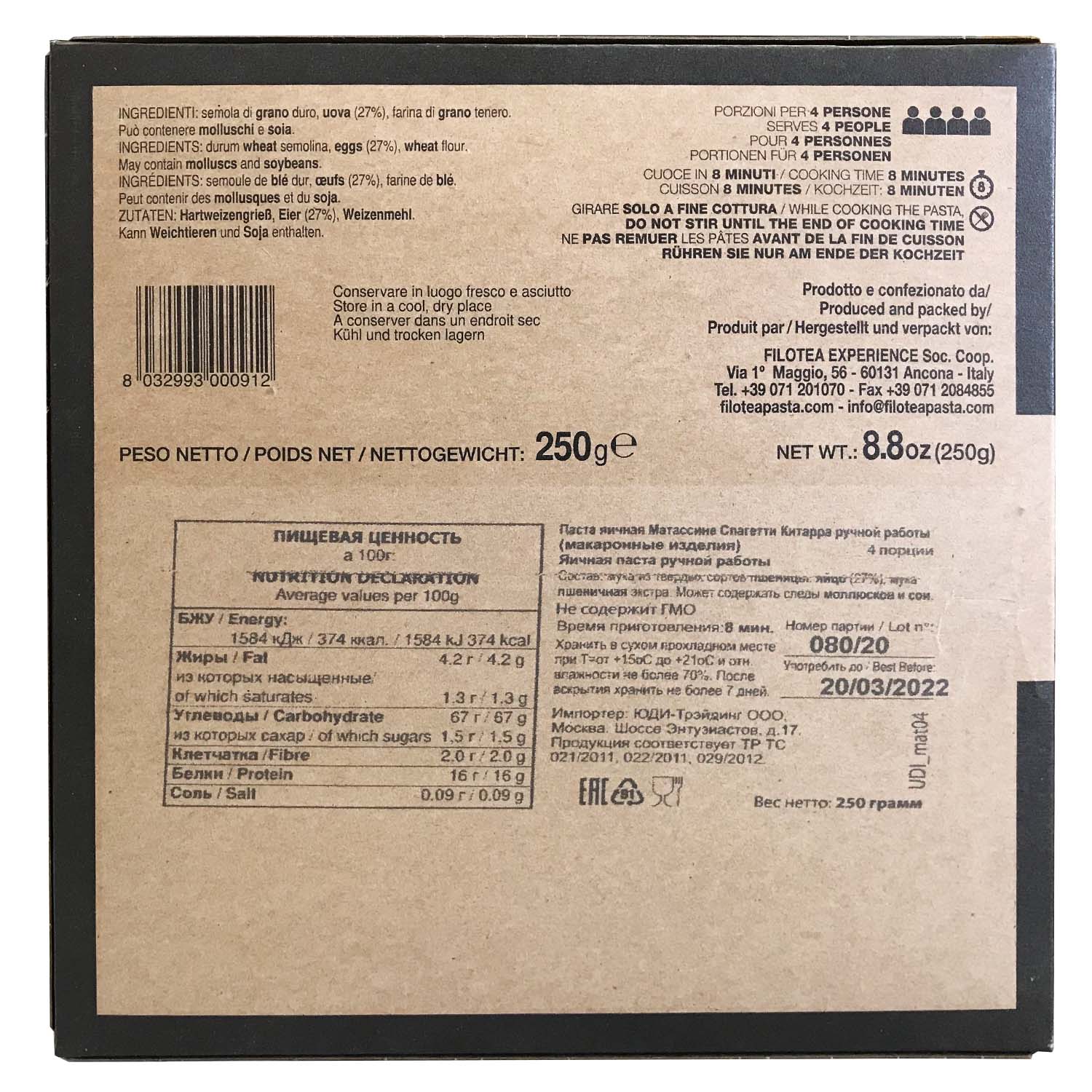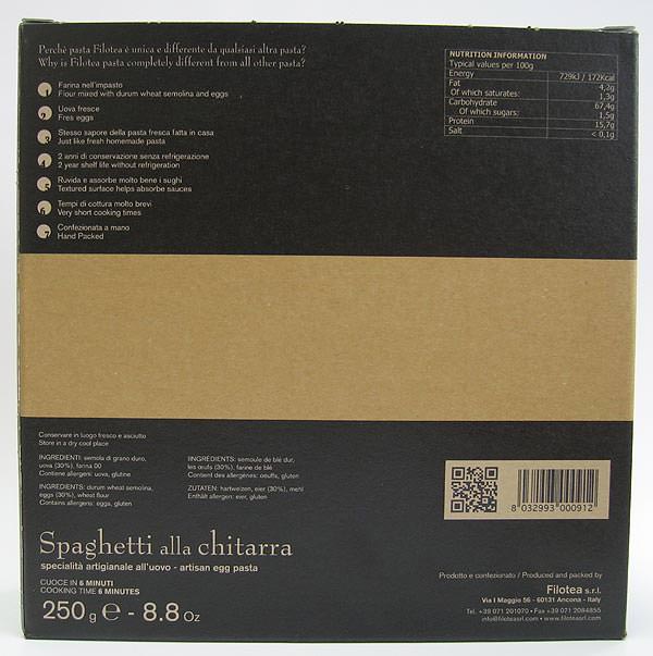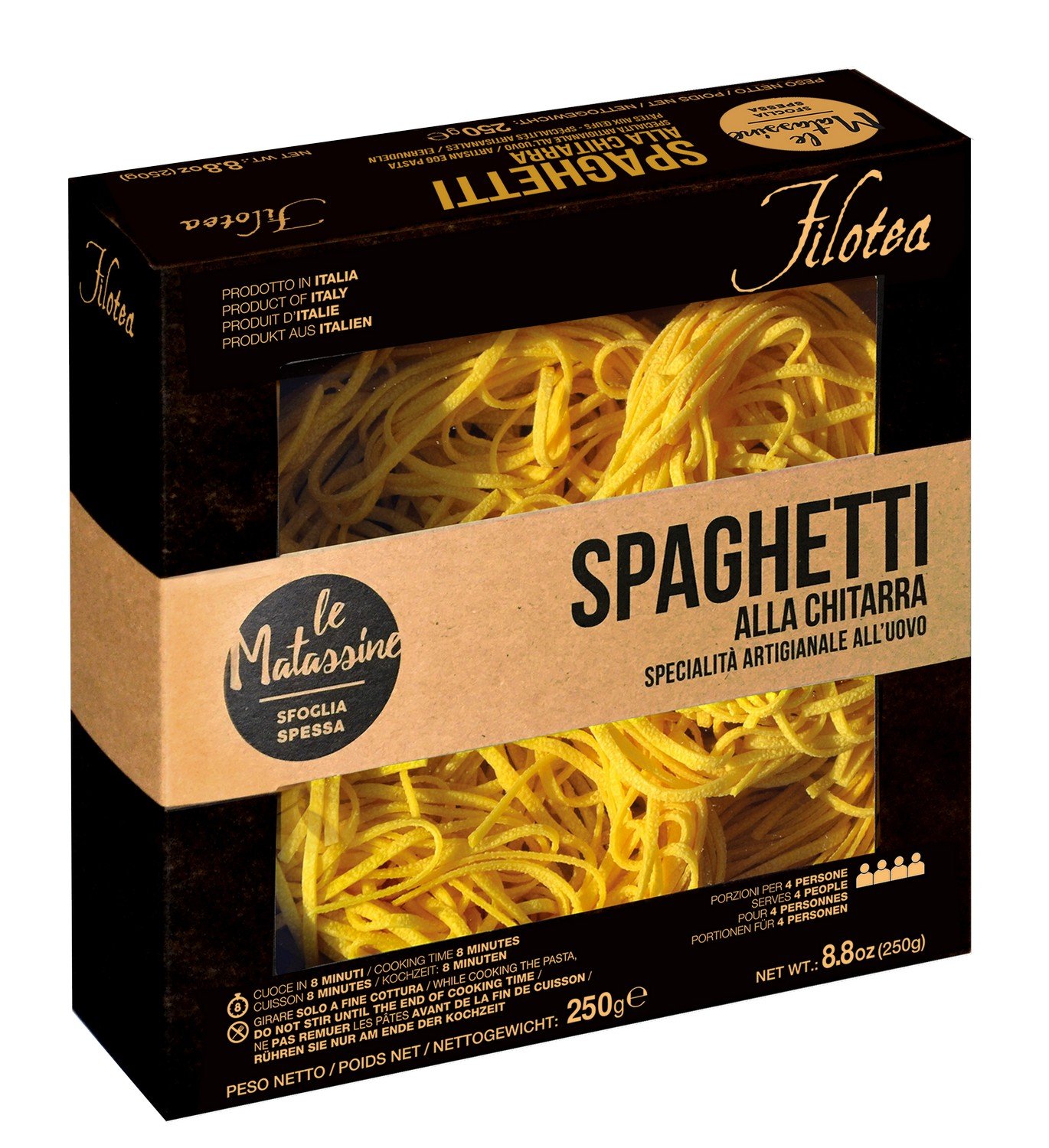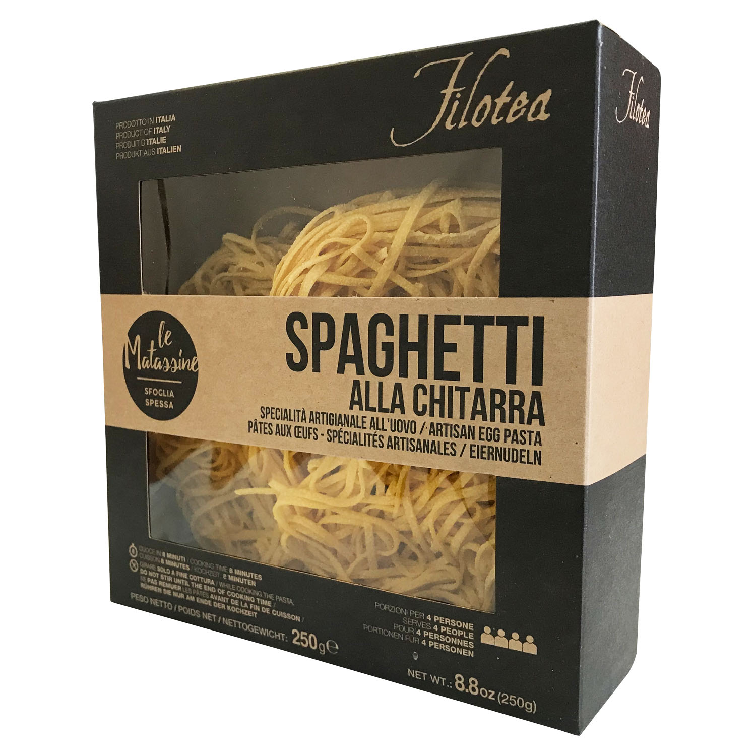 Яичная паста Матассине Спагетти Китарра ручной работы - спагетти квадратной формы, благодаря интрументу "китарра" на котором они производятся. Тесто пропускают через бронзовую фильеру для получения "пористой" "шероховатой" структуры, что позволяет соусу лучше проникать в структуру и раскрывать свои вкусовые качества. Классическая паста прекрасно сочетается с любыми соусами на ваш выбор и вкус.