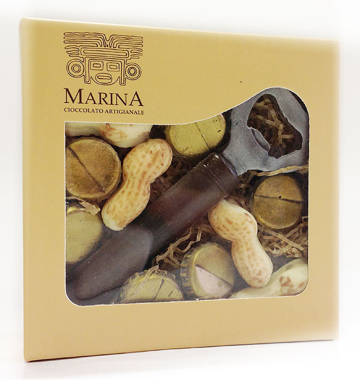 Набор фигурного шоколада "Открывалка" / Apribottiglia con tappi - шоколадный набор из горького и белого шоколада. Открывалка - одна из самых простых, но очень нужных вещей в жизни. Признавая этот факт, "MARINA" создали данный шоколадный набор. Оригинальный подарок и украшение стола.