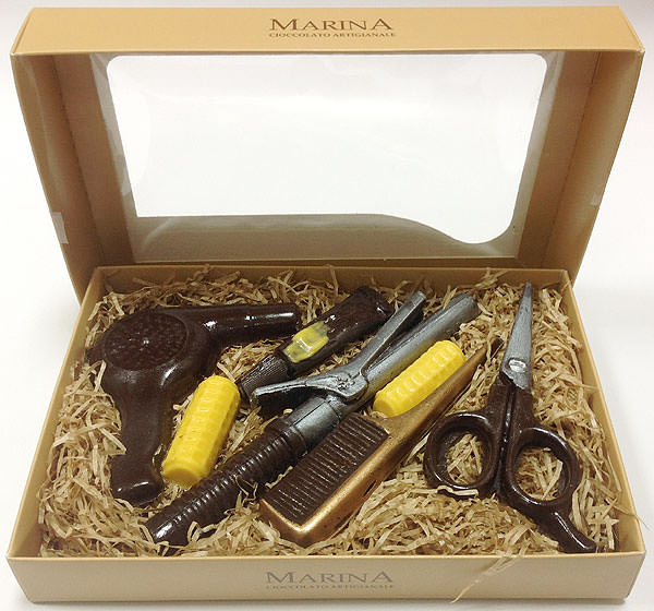 Набор фигурного шоколада "Парикмахер" / Parrucchiera - шоколадный набор из горького (фен, тюбик, термощипцы, расческа, ножницы) и белого (бигуди) шоколада. Возможность отблагодарить Вашего регулярного парикмахера. Красота иногда "требует жертв", но Вы гарантированно станете любимым клиентом. Отличный подарок для женщин.