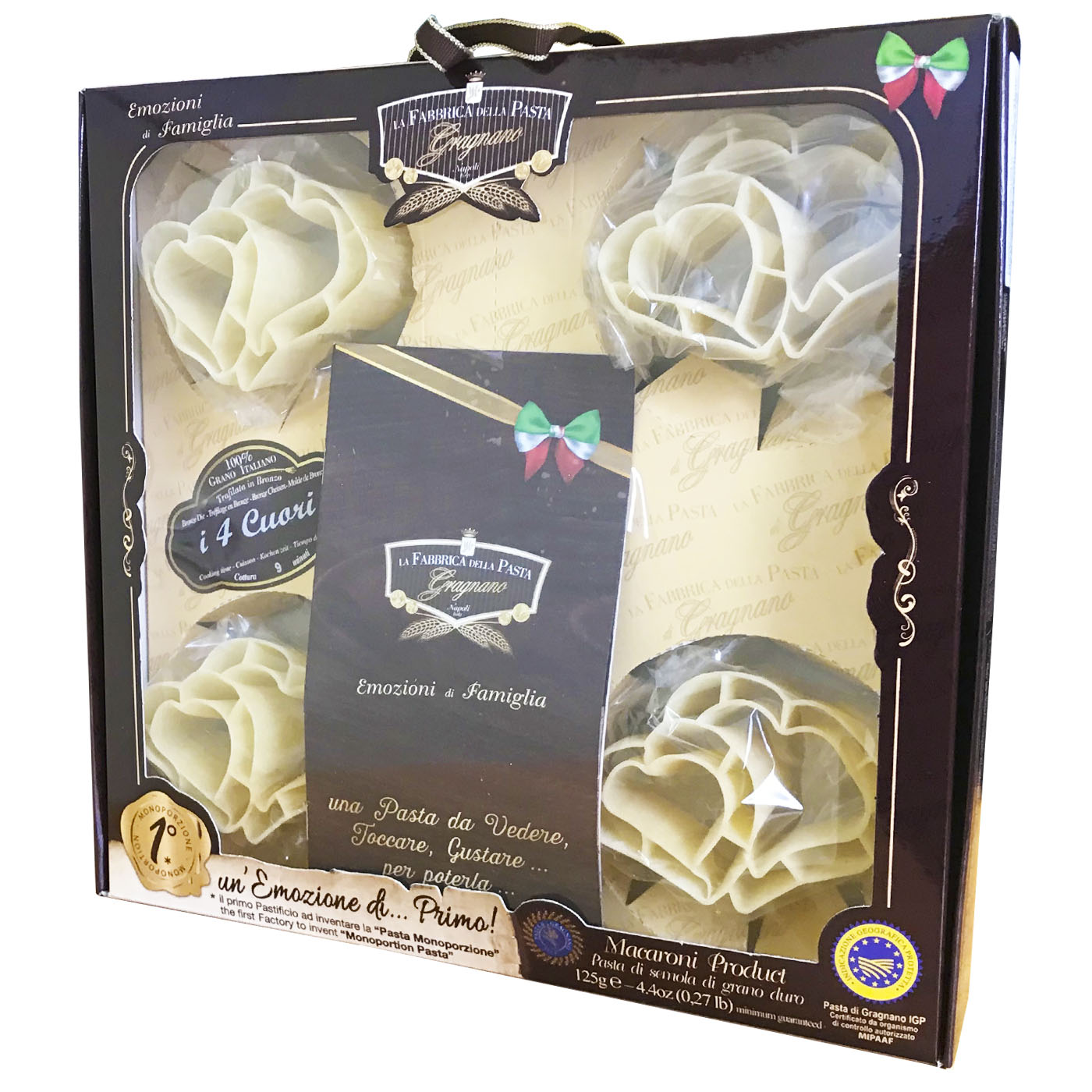 Подарочный набор пасты из твердых сортов пшеницы в форме "Двух сердец". Комплект из четырех макаронных изделий и брошюры с рецептами.