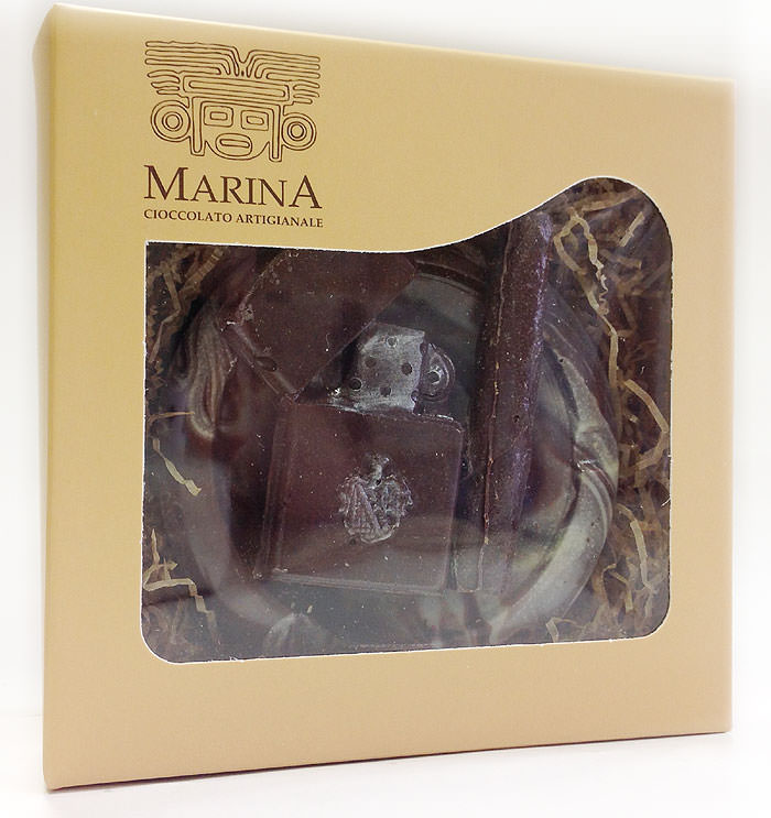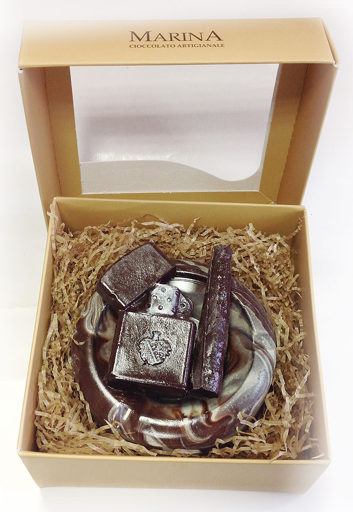 Набор фигурного шоколада "Пепельница и сигара" / Posacenere con sigaro - шоколадный набор из горького шоколада. Оригинальный и, в некотором смысле, благородный набор, в который входят зажигалка, сигара и пепельница. Приятный сюрприз для джентельмена
