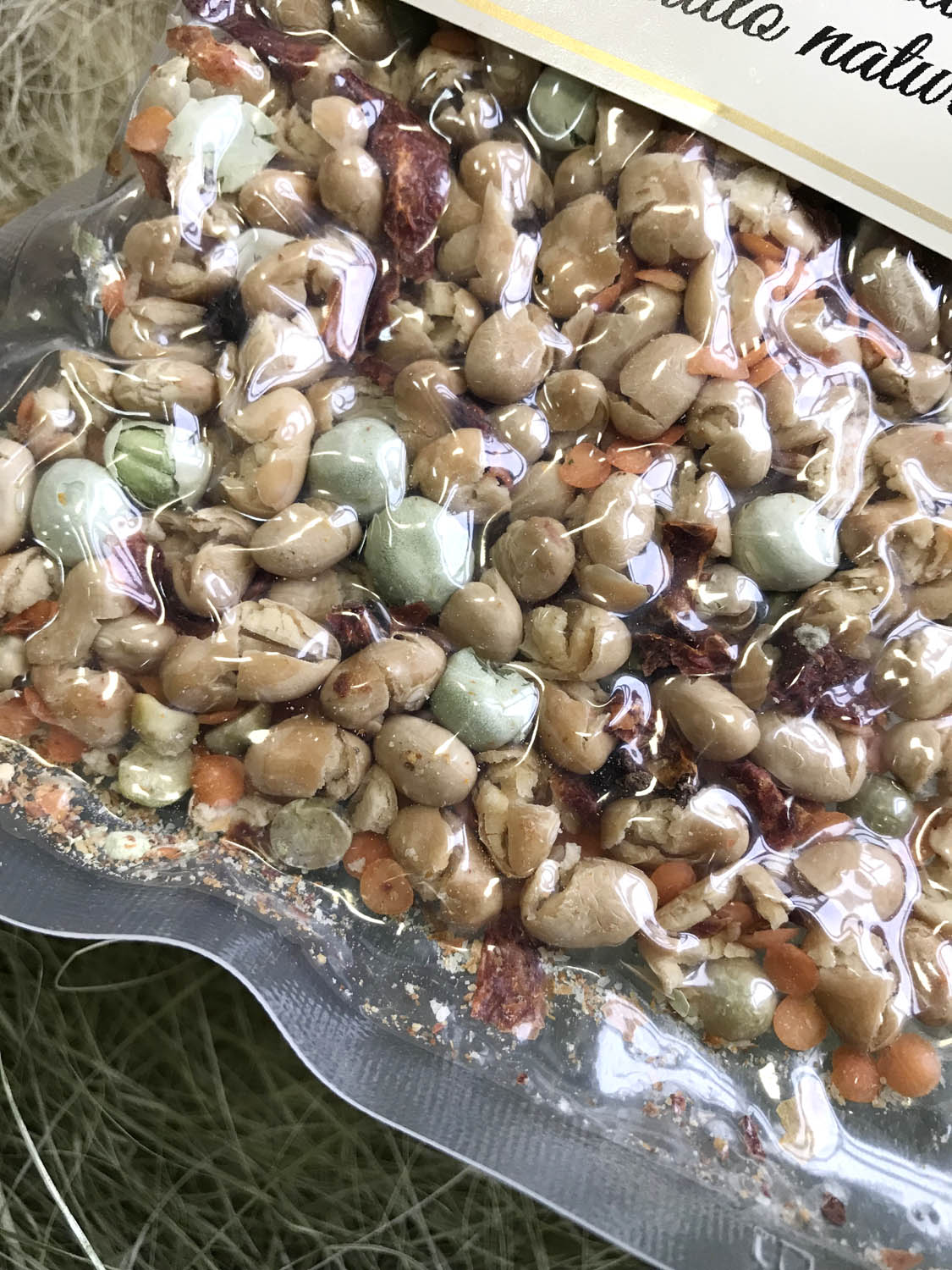Фасоль (61%), чечевица (25%), горох (8%), чеснок (2%), томаты (2%), петрушка (1%), овощной бульон (морская соль, репчатый лук, белые грибы Boletus Edulis, морковь, оливковое масло extra virgin, лук-порей, петрушка, молотые семена сельдерея, экстракт оливки, чеснок) (1%). Содержит глютен. Может содержать следы миндаля, фундука, сои, кунжута и других рыбных продуктов. Не содержит глутамат натрия, химических пищевых добавок и продуктов животного происхождения.