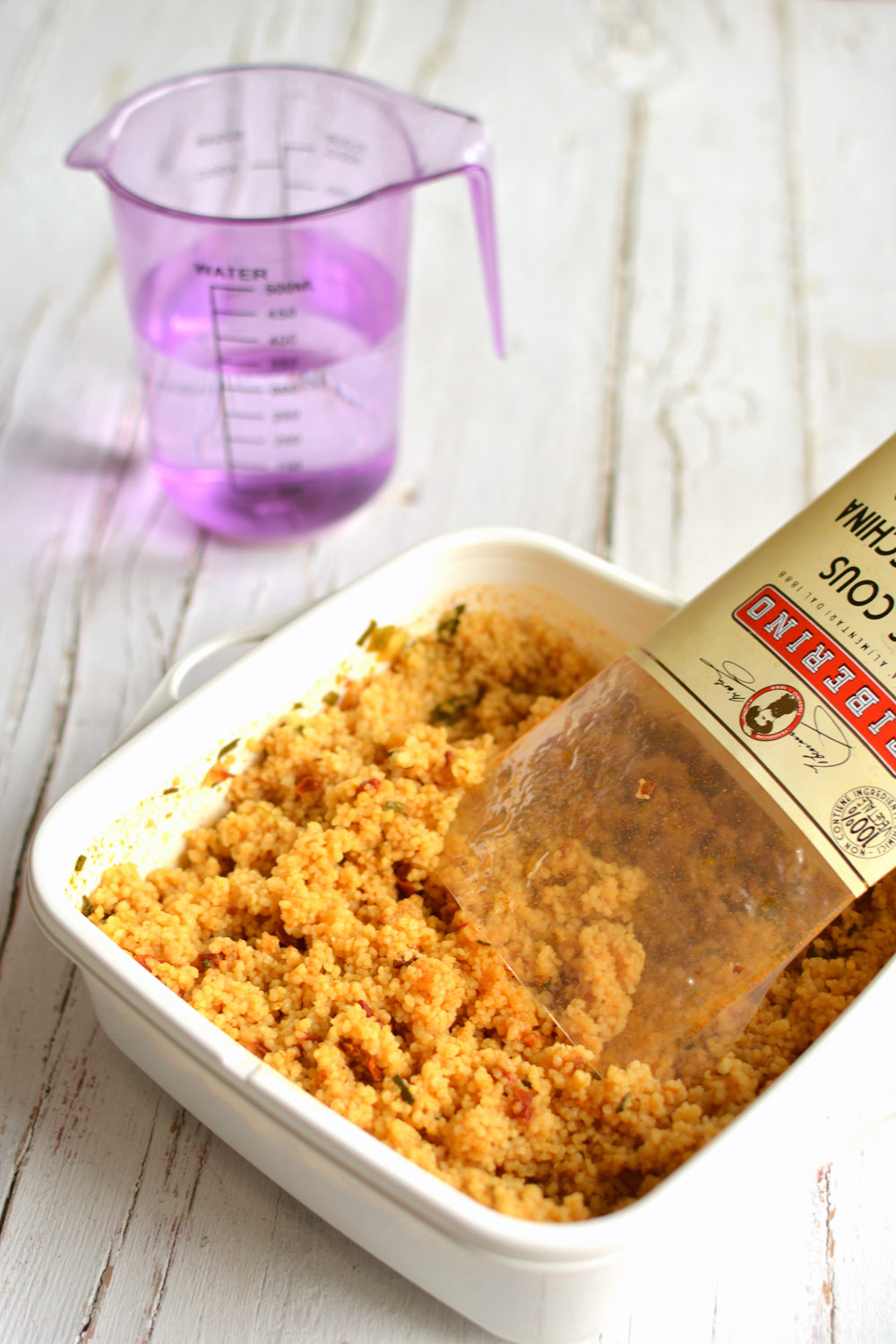 В кастрюле или глубоком сотейнике довести до кипения 600 мл воды. Засыпать содержимое упаковки, интенсивно перемешивать в течение 1 минуты, закрыть крышкой, выключить огонь и оставить на 9 мин. Если потребуется, можно добавить еще немного теплой воды. Посолить по вкусу и оставить еще на 1 мин. Подавать с оливковым маслом.