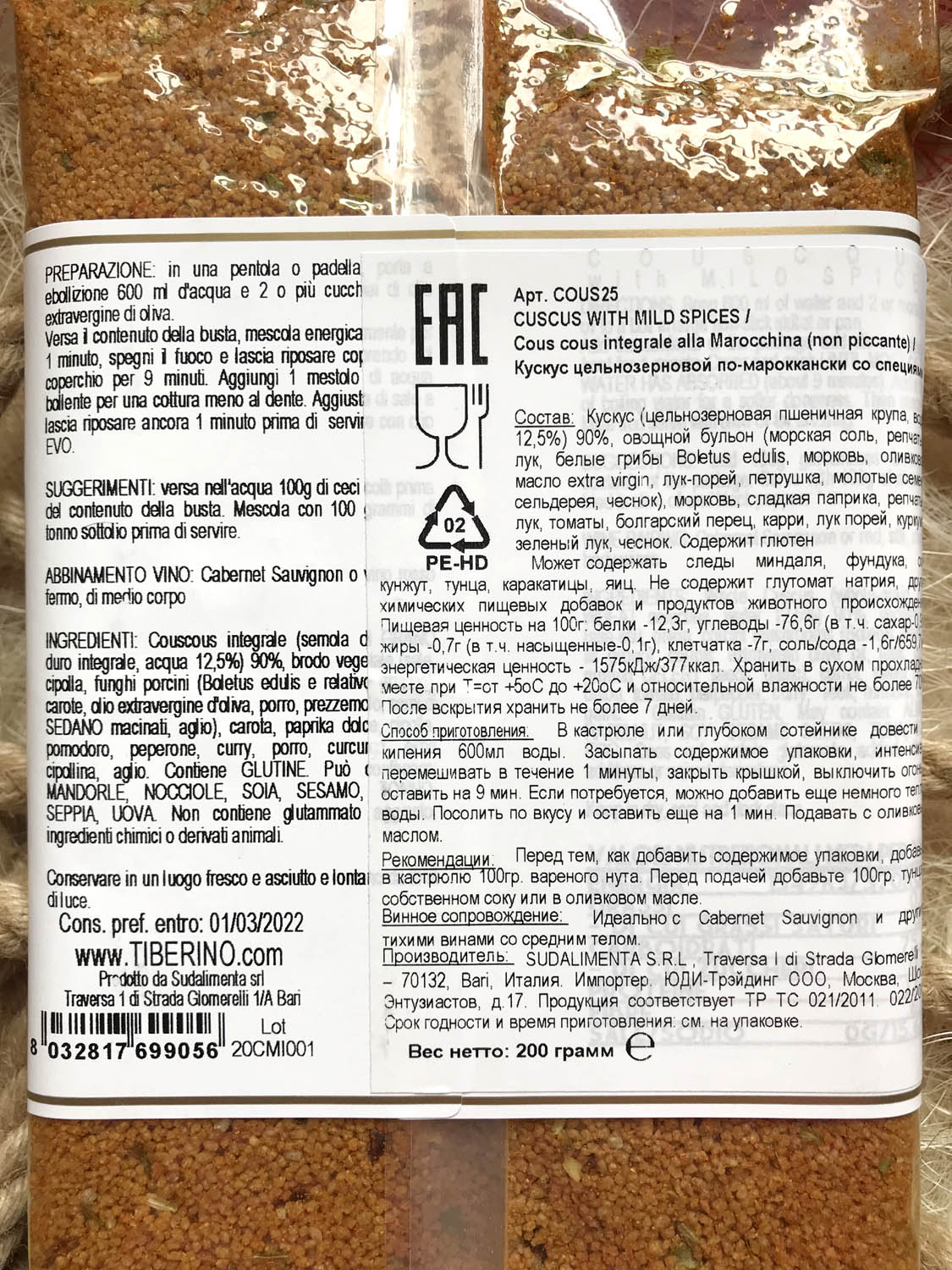 | Оригинальное наименование | COUS COUS CON SPEZIE & ERBE ALLA MEDITERRANEA 200G |
