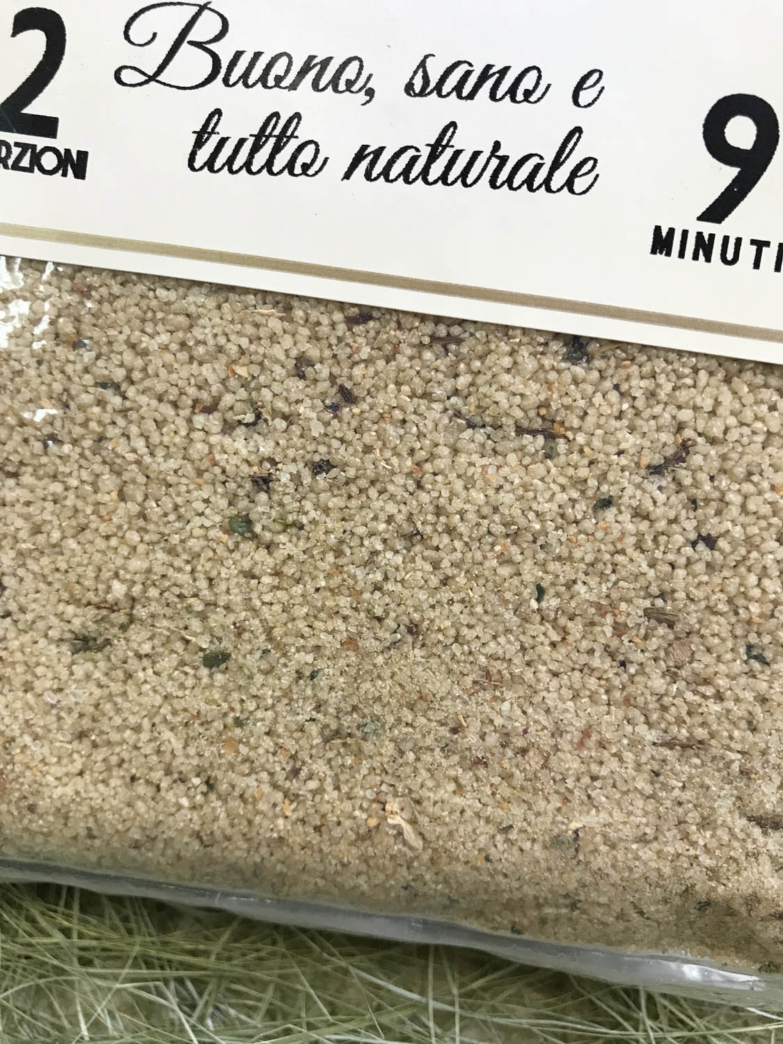 Кускус (цельнозерновая пшеничная крупа, вода 12,5%) 93%, белые грибы (Boletus Edulis) 4%, овощной бульон ( морская соль, репчатый лук, белые грибы Boletus Edulis, морковь, оливковое масло extra virgin, лук-порей, петрушка, молотые семена сельдерея, чеснок), чеснок, петрушка. Содержит глютен. Может содержать следы миндаля, фундука, сои, кунжута, тунца, каракатицы, яиц. Не содержит глутамат натрия, других химических пищевых добавок и продуктов животного происхождения.