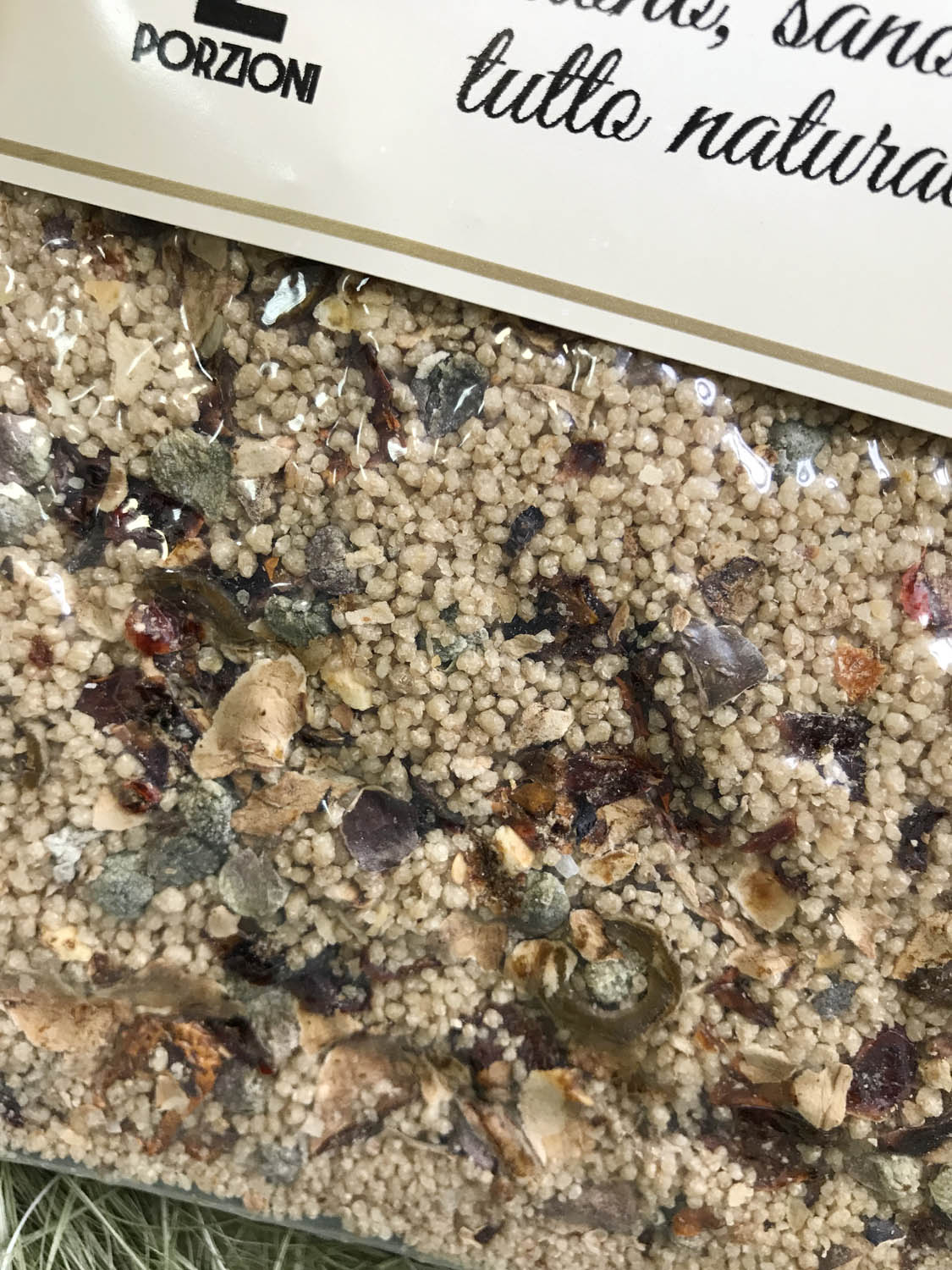 Кускус (цельнозерновая пшеничная крупа, вода 12,5%) 85%, томаты 3%, болгарский перец 3%, баклажан 3%, овощной бульон ( морская соль, репчатый лук, белые грибы Boletus Edulis, морковь, оливковое масло extra virgin, лук-порей, петрушка, молотые семена сельдерея, чеснок), каперсы, оливки, репчатый лук, апельсин, чеснок. Содержит глютен. Может содержать следы миндаля, фундука, сои, кунжута, тунца, каракатицы и яиц. Не содержит глутамат натрия, других химических пищевых добавок и продуктов животного происхождения.