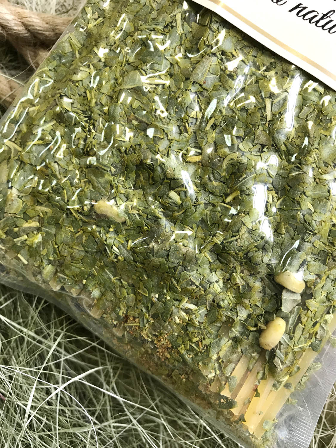 Паста (макаронные изделия) (мука из твердых сортов пшеницы, вода 12,5%) 93%, базилик 3%,овощной бульон (морская соль, репчатый лук, белые грибы Boletus Edulis, морковь, оливковое масло extra virgin, лук-порей, петрушка, молотые семена сельдерея, чеснок), кедровые орехи «пиноли», чеснок. Содержит глютен. Может содержать следы миндаля, фундука, сои, кунжута, тунца, каракатицы и яиц.Не содержит глутамат натрия, других химических пищевых добавок и продуктов животного происхождения.