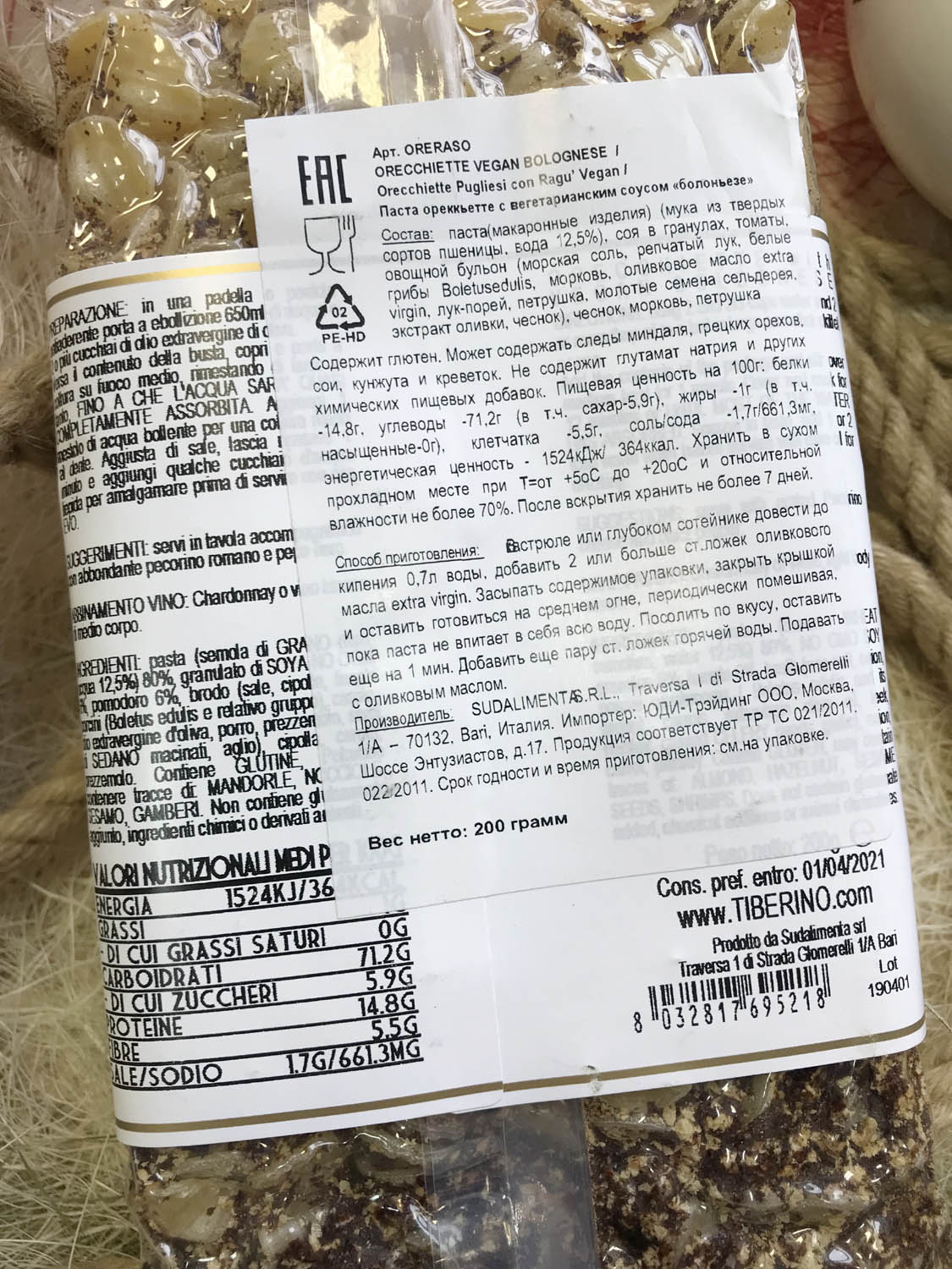 | Оригинальное наименование | ORECCHIETTE PUGLIESI CON RAGU' VEGAN 200G |