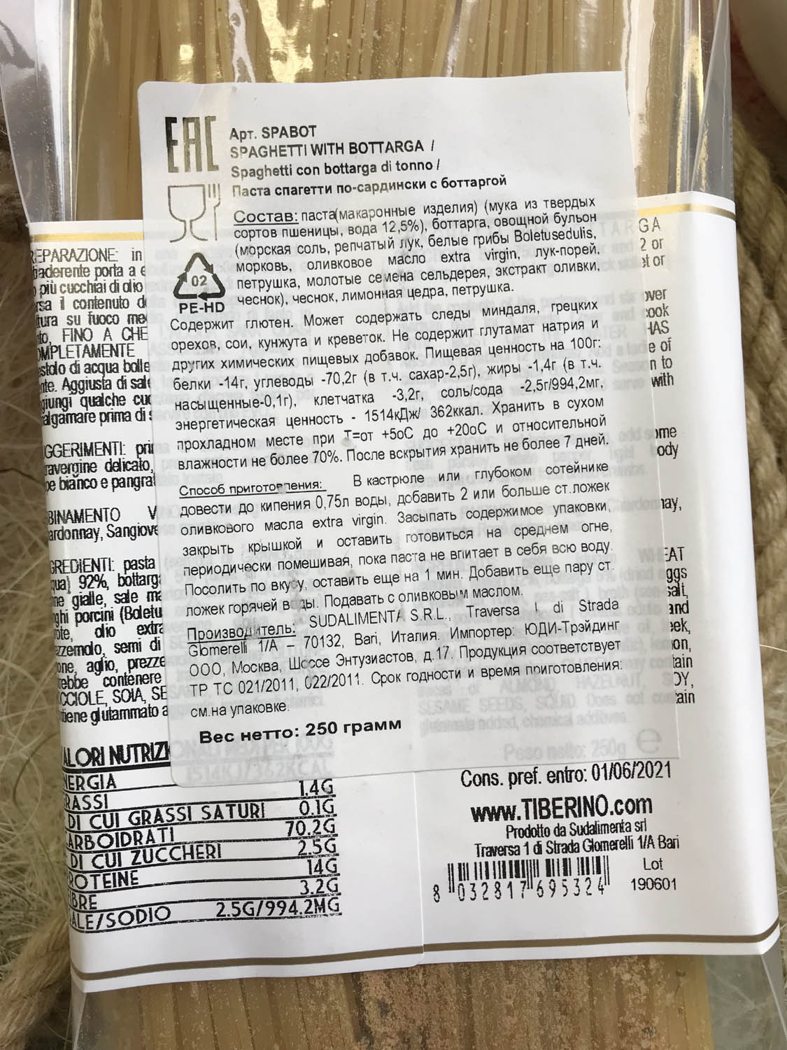 | Оригинальное наименование | SPAGHETTI CON BOTTARGA 250G |